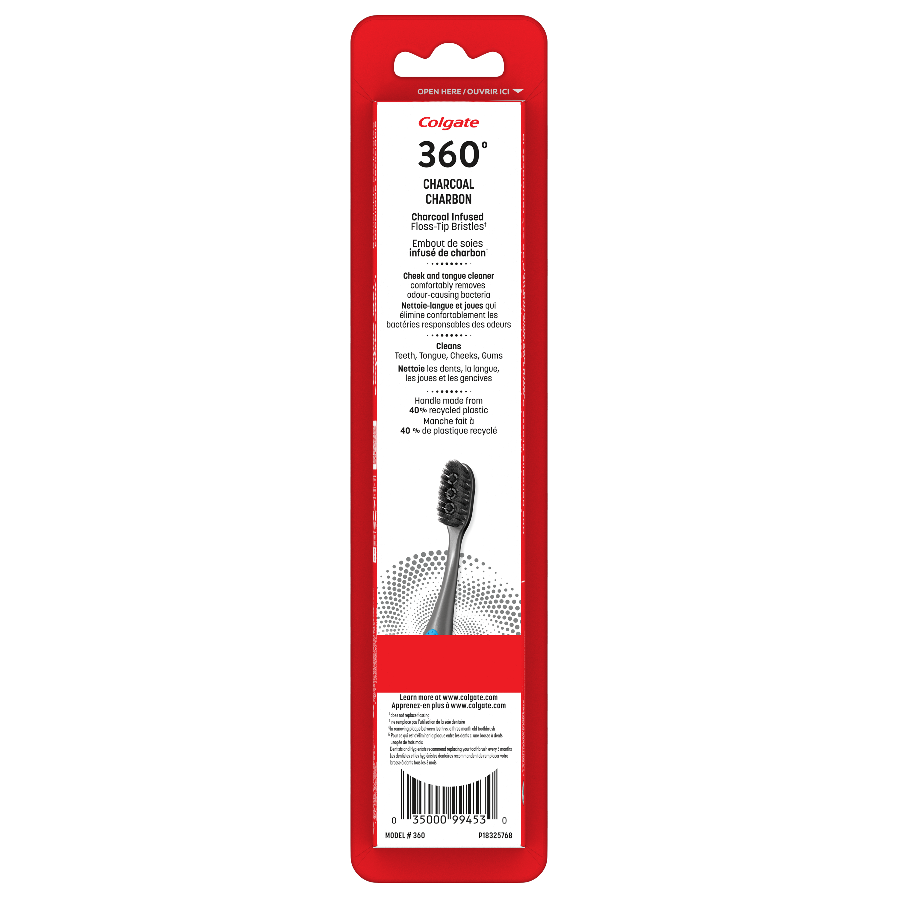 Product Title Brosse à dents Colgate 360° Anthracite, brosses à dents souples pour adultes, paquet de 2 SKU 61057286 SKU eCommerce Name Brosse à dents Colgate 360° Anthracite, brosses à dents souples pour adultes, paquet de 2 Consumer Unit - GTIN 00035000994530 Product Category Oral Care Product Sub Category Manual TB Brand Colgate Product Sub Brand Colgate 360 Man TB Consumer Unit Gross Weight 0.043 KG / 0.095 LB Consumer Unit Net Weight 0.031 KG / 0.068 LB Consumer Unit Length 18.000 MM / 0.709 IN Consumer Unit Width 52.000 MM / 2.047 IN Consumer Unit Height 229.000 MM / 9.016 IN Consumer Unit Volume 0.214 C8 / 0.008 CF Product Title Brosse à dents Colgate 360° Anthracite, brosses à dents souples pour adultes, paquet de 2 eCommerce Copy La brosse à dents pour adultes Colgate 360° Antracite est dotée de soies Floss-Tip† infusées de charbon et elle blanchit les dents‡. Cette brosse à dents avec charbon nettoie 2x plus en profondeur* le long de la ligne gingivale et son nettoie-langue et joue élimine aisément les bactéries responsables de mauvaises odeurs. †Cette brosse à dents ne remplace pas l’utilisation de la soie dentaire *c. une brosse à dents ordinaire à soies plates ‡En 1 semaine; la brosse à dents élimine les taches à la surface eCommerce Copy- Long Description La brosse à dents pour adultes Colgate 360° Anthracite est dotée de soies Floss-Tip† infusées de charbon et elle blanchit les dents‡. Cette brosse à dents avec charbon nettoie 2x plus en profondeur* le long de la ligne gingivale et son nettoie-langue et joue élimine aisément les bactéries responsables de mauvaises odeurs. De plus, cette brosse à dents Colgate pour adultes est fabriquée de façon responsable.* Fabriquée dans une installation zéro déchet véritable certifiée LEED, la brosse à dents Colgate 360° est dotée d’un emballage fait à 100 % de carton recyclé. Ce paquet double de brosses à dents comprend deux brosses à dents de couleurs différentes pour les différentes personnes dans le foyer ou pour faire des provisions. Souvenez-vous de remplacer votre brosse à dents tous les 3 mois. *Pour en savoir plus, visitez www.colgatepalmolive.com/responsibly-made †Cette brosse à dents ne remplace pas l’utilisation de la soie dentaire ‡En 1 semaine; la brosse à dents élimine les taches à la surface Keywords (eCommerce) brosse à dents colgate, brosse à dents manuelle, soies de brosse à dents souples, brosse à dents pour adultes, nettoie-langue et joues, tête pleine grandeur, brosse à dents de voyage, brosses à dents en vrac, brosses à dents pour la famille, paquet économique de brosses à dents, brosses à dents