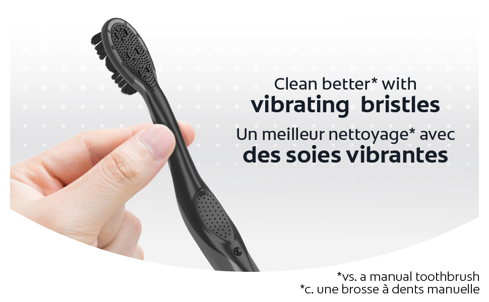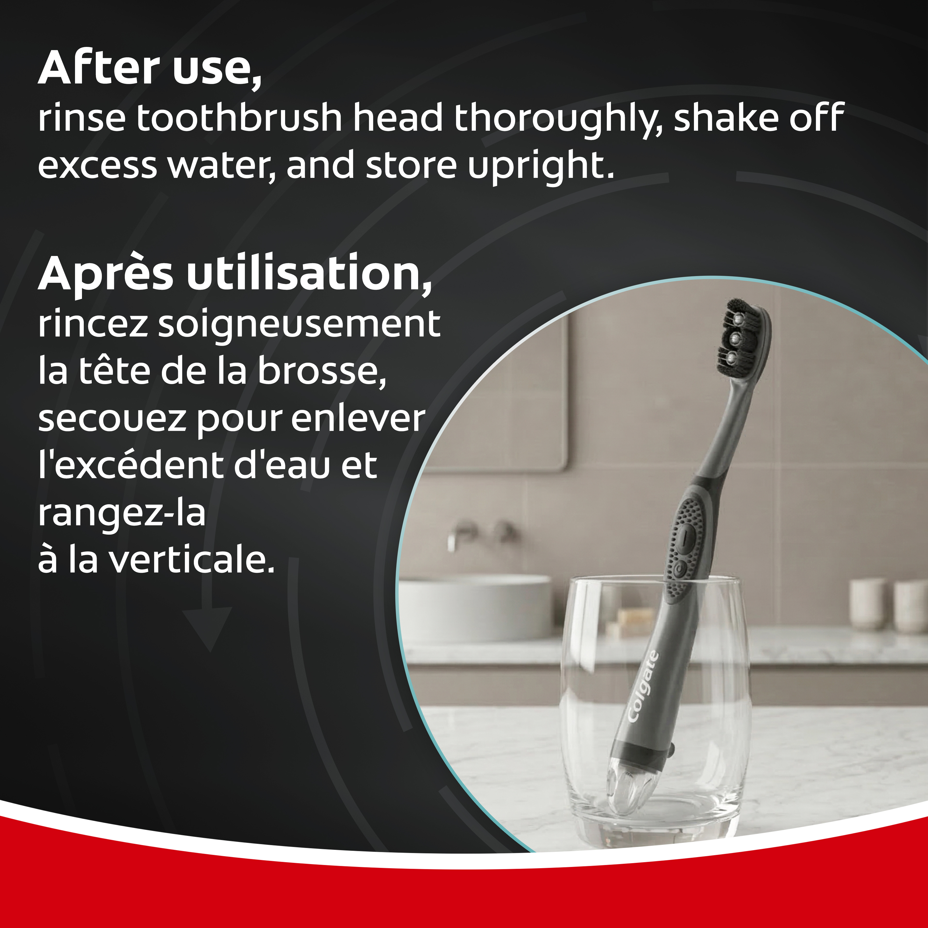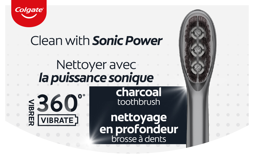 Product Title Brosse à dents vibrante électrique à piles Colgate 360 Charbon, soies souples, lot de 1 SKU CN08198A Consumer Unit - GTIN 00035000983992 Case - GTIN 10035000983999 Product Category Oral Care Product Sub Category Battery TB Brand Colgate Product Sub Brand Colgate 360 Hybrid BTB Consumer Unit Gross Weight 0.046 KG / 0.101 LB Consumer Unit Net Weight 0.036 KG / 0.079 LB Consumer Unit Length 25.000 MM / 0.984 IN Consumer Unit Width 51.000 MM / 2.008 IN Consumer Unit Height 230.000 MM / 9.055 IN Consumer Unit Volume 0.283 C8 / 0.010 CF Product Title Brosse à dents vibrante électrique à piles Colgate 360 Charbon, soies souples, lot de 1 Product Description La brosse à dents vibrante à piles Colgate 360 Charbon allie la puissance d’une brosse à dents à piles au confort d’une tête de brosse à dents manuelle pour un nettoyage des dents efficace. Cette brosse à dents sonique à soies souples utilise des soies vibrantes dotées de la technologie sonique pour un nettoyage plus efficace*. De plus, cette brosse à dents vibrante est parfaite pour voyager, car elle fonctionne à piles et peut être utilisée où que vous alliez (1 pile AAA fournie). Profitez d’un nettoyage bucco-dentaire plus complet et plus sain** d’une simple pression sur un bouton avec la brosse à dents vibrante Colgate 360 Charbon. Cette brosse à dents à piles pour adultes vous aide à nettoyer vos dents, vos joues, votre langue et vos gencives, pour profiter d’une hygiène bucco-dentaire complète à chaque brossage. Les soies souples et vibrantes assurent un nettoyage alimenté par la technologie sonique. Nettoyez plus efficacement* grâce aux soies vibrantes alimentées par la technologie sonique de la brosse à dents vibrante à piles Colgate 360 Charbon. * par rapport à une brosse à dents manuelle ** par rapport à un brossage avec une brosse à dents classique à tête plate eCommerce Copy La brosse à dents Colgate 360 Vibrer Charbon associe la puissance d'une brosse à dents à piles à la familiarité d'une tête de brosse à dents manuelle pour une expérience de nettoyage des dents rafraîchissante. Cette brosse à dents vibrante pour toute la bouche est dotée d’un embout de soies* souples pour nettoyer entre les dents. La brosse à dents pour adultes est parfaite pour les voyages, car elle est alimentée par une pile, ce qui permet de l'utiliser où que vous alliez (1 pile AAA incluse). eCommerce Copy- Long Description Brosse à dents à piles Colgate 360 Vibrer Charbon La brosse à dents Colgate 360 Vibrer Charbon associe la puissance d'une brosse à dents à piles à la familiarité d'une tête de brosse à dents manuelle pour une expérience de nettoyage des dents rafraîchissante. Cette brosse à dents vibrante pour toute la bouche est dotée d’un embout de soies* souples pour nettoyer entre les dents. La brosse à dents pour adultes est parfaite pour les voyages, car elle est alimentée par une pile, ce qui permet de l'utiliser où que vous alliez (1 pile AAA incluse). Action nettoyante avec charbon par simple pression d'un bouton Faites l’expérience d’un nettoyage plus sain de toute la bouche** par simple pression d’un bouton avec la brosse à dents Colgate 360 Vibrer Charbon. Cette brosse à dents à piles nettoie les dents, les joues, la langue et les gencives pour que vous puissiez profiter d'un nettoyage de toute la bouche à chaque brossage. Les soies souples et vibrantes offrent un nettoyage puissant grâce à la technologie sonique. Un meilleur nettoyage*** avec des soies vibrantes alimentées grâce à la technologie sonique de la brosse à dents à piles Colgate 360 Vibrer Charbon. Des sourires sains avec Colgate Chez Colgate, nous fabriquons des produits qui favorisent des sourires sains. Non seulement parce qu’un sourire sain est important pour votre santé générale, mais aussi parce que lorsque vous avez un sourire sain, vous souriez davantage – et c’est un atout majeur. Les sourires sont la forme la plus simple de l’optimisme, ce dont nous avons besoin aujourd’hui plus que jamais. C'est pourquoi nous prônons l'optimisme – nous nous engageons à créer une planète plus saine et nous travaillons chaque jour à créer des sourires sains pour tous. Tout le monde a le droit d'avoir un sourire éclatant. C’est pourquoi nous nous engageons à améliorer les normes de santé buccodentaire partout dans le monde. Qu'il s'agisse de prendre de nouvelles habitudes saines en tant qu'enfant ou d'apprendre quelque chose de nouveau auprès des experts, nous sommes là pour vous. *ne remplace pas l’utilisation de la soie dentaire **c. le brossage des dents seulement avec une brosse à dents ordinaire à soies plates ***c. une brosse à dents manuelle Bullet 1 Comprend une (1) brosse à dents vibrante électrique à piles Colgate 360 Charbon à soies souples, 1 pile AAA incluse Bullet 2 Allie le confort d’une brosse à dents manuelle pour adultes à la puissance d’une brosse à dents électrique alimentée par la technologie sonique Bullet 3 Cette brosse à dents à soies souples pour adultes est dotée de soies vibrantes alimentées par la technologie sonique, pour un nettoyage plus efficace* d’une simple pression sur un bouton Bullet 4 La brosse à dents vibrante vous aide à nettoyer vos dents, vos joues, votre langue et vos gencives, pour profiter d’une hygiène bucco-dentaire complète à chaque brossage Bullet 5 Profitez d’un nettoyage bucco-dentaire plus complet et plus sain** grâce à la brosse à dents vibrante électrique à piles Colgate 360 Charbon à soies souples Bullet 6 Cette brosse à dents à piles comprend une pile AAA pour une utilisation immédiate et convient parfaitement comme brosse à dents de voyage portative puisqu’elle n’a pas besoin de chargeur Keywords (eCommerce) brosse à dents à piles, brosse à dents alimentée, brosse à dents à piles alimentée, meilleure brosse à dents électrique, meilleures 