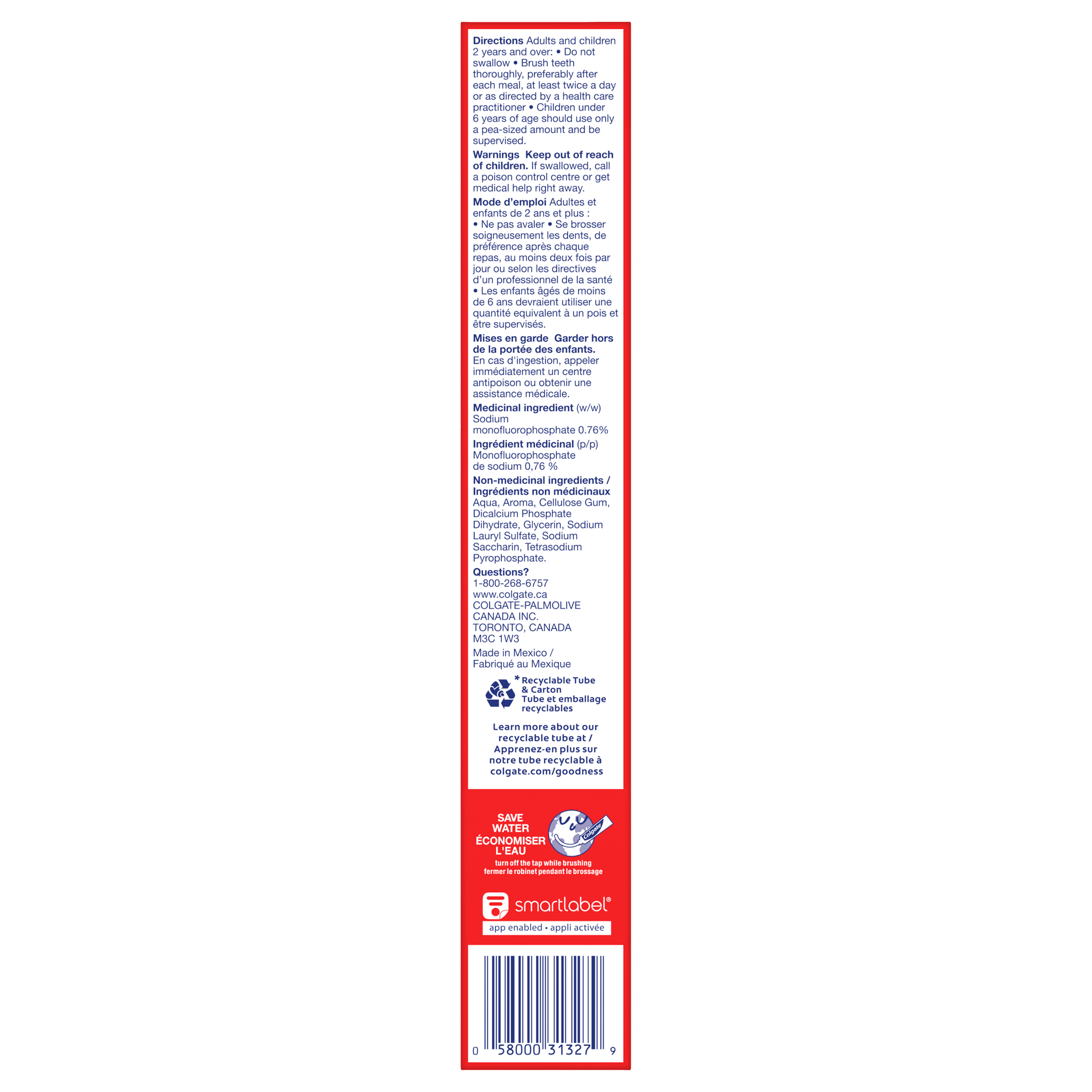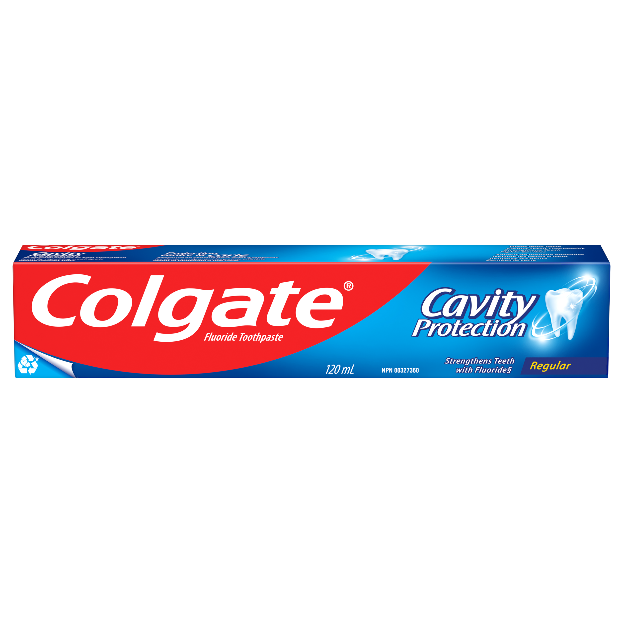 Product Title Dentifrice au fluorure Colgate Protection contre la carie Populaire, 120 mL SKU MX03597A SKU eCommerce Name Dentifrice au fluorure Colgate Protection contre la carie Populaire, 120 mL Consumer Unit - GTIN 058000313279 Case - GTIN 10058000313276 Product Category Oral Care Product Sub Category Toothpaste Brand Colgate Product Sub Brand Colgate Maximum Cavity Protection TP Consumer Unit Gross Weight 0.200 KG / 0.441 LB Consumer Unit Net Weight 0.174 KG / 0.384 LB Consumer Unit Length 36.000 MM / 1.417 IN Consumer Unit Width 221.000 MM / 8.701 IN Consumer Unit Height 44.000 MM / 1.732 IN Consumer Unit Volume 0.350 C8 / 0.012 CF Product Title Dentifrice au fluorure Colgate Protection contre la carie Populaire, 120 mL eCommerce Copy Le dentifrice Colgate Protection contre la carie formulé au fluorure et à l’excellent goût de menthe est éprouvé en clinique pour aider à renforcer les dents en réparant les points affaiblis et procure une haleine propre et fraîche. eCommerce Copy- Long Description Le dentifrice Colgate Protection contre la carie procure la même protection fiable contre les caries pour toute la famille. Formulé au fluorure, il est éprouvé en clinique pour aider à renforcer les dents en réparant les points affaiblis avant la formation des caries et procure une haleine propre et fraîche. De plus, son excellent goût de menthe plaira à toute la famille. Keywords (eCommerce) dentifrice, pâte à dents, dentifrices, pâte, pâte dentifrice, meilleur, odeur, goût délicieux, goût formidable, goût merveilleux, goût épatant, menthe, halitose, dents, lavage de dents, propre, propreté, moussant, élimination des taches, blanchiment, blanchissant, ligne gingivale, bord gingival, rebord gingival, contrôle du tartre, fluorure, anticarie, anticaries, anti-carie, anti-caries, adulte, économique, écono, avantageux, famille, familial, haleine fraîche, rafraîchit, bouche propre, dents plus blanches OS Amazon Product Title Colgate Cavity Protection Dentifrice au Fluorure, Menthe, 120 ml OS Amazon Product Description Le dentifrice fluoré Colgate Cavity Protection offre à vos dents la meilleure protection* grâce à sa formule unique anti-caries au fluor. Ce dentifrice puissant contre les caries a un bon goût de menthe et il est cliniquement prouvé qu'il aide à renforcer les dents en réparant les points faibles avant l'apparition des caries. Offrez à vos dents un nettoyage de haute qualité avec le dentifrice fluoré Colgate Cavity Protection. Ce dentifrice à la menthe avec fluorure aide à lutter contre les caries et nettoie les dents en profondeur. De plus, ce dentifrice anti-caries utilise du fluorure pour aider à renforcer les dents et l'émail pendant que vous vous brossez les dents, pour une meilleure protection contre les caries. Le dentifrice fluoré Colgate Cavity Protection aide à promouvoir une bouche plus saine en aidant à prévenir les caries grâce au fluorure. *pour la protection des caries par rapport à la formule précédente. OS Amazon Bullet 1 Comprend un (1) tube de 120 ml de dentifrice Colgate Cavity Protection, dentifrice au fluorure OS Amazon Bullet 2 Cliniquement prouvé pour aider à renforcer les dents en réparant les points faibles avant le début des caries OS Amazon Bullet 3 Ce dentifrice au fluorure se double d'un dentifrice à la menthe rafraîchissant OS Amazon Bullet 4 Renforcez vos dents et protégez-les contre les caries grâce à ce dentifrice anti-caries de Colgate OS Amazon Bullet 5 Le dentifrice Colgate Cavity Protection utilise une formule ant-anti-caries unique à base de fluorure et d'arginine naturelle pour aider à prévenir les caries OS Walmart Product Title Colgate Cavity Protection Dentifrice au Fluorure, Menthe, 120 ml OS Walmart Product Description Dentifrice Colgate Cavity Protection fluoré, menthe, 120mL Le dentifrice fluoré Colgate Cavity Protection offre à vos dents la meilleure protection* grâce à sa formule unique anti-caries au fluor. Ce dentifrice puissant contre les caries a un bon goût de menthe et il est cliniquement prouvé qu'il aide à renforcer les dents en réparant les points faibles avant l'apparition des caries. Un nettoyage de qualité Offrez à vos dents un nettoyage de haute qualité avec le dentifrice fluoré Colgate Cavity Protection. Ce dentifrice à la menthe avec fluorure aide à lutter contre les caries et nettoie les dents en profondeur. De plus, ce dentifrice anti-caries utilise du fluorure pour aider à renforcer les dents et l'émail pendant que vous vous brossez les dents, pour une meilleure protection contre les caries. Protection puissante de la cavité Le dentifrice fluoré Colgate Cavity Protection aide à promouvoir une bouche plus saine en aidant à prévenir les caries grâce au fluorure. Prenez des mesures proactives pour un sourire plus confiant avec le dentifrice Colgate Cavity Protection. *pour la protection des caries par rapport à la formule précédente. OS Walmart Bullet 1 Comprend un (1) tube de 120 ml de dentifrice Colgate Cavity Protection, dentifrice au fluorure. OS Walmart Bullet 2 Cliniquement prouvé pour aider à renforcer les dents en réparant les points faibles avant le début des caries OS Walmart Bullet 3 Ce dentifrice au fluorure se double d'un dentifrice à la menthe rafraîchissant OS Walmart Bullet 4 Renforcez vos dents et protégez-les contre les caries grâce à ce dentifrice anti-caries de Colgate OS Walmart Bullet 5 Le dentifrice Colgate Cavity Protection utilise une formule ant-anti-caries unique à base de fluorure et d'arginine naturelle pour aider à prévenir les caries OS Loblaws Product Title Colgate protection dentifrice au fluorure, menthe OS Loblaws Product Description Le dentifrice fluoré Colgate Cavity Protection offre à vos dents la meilleure protection* grâce à sa formule unique anti-caries au fluor. Ce dentifrice puissant contre les caries a un bon goût de menthe et il est cliniquement prouvé qu'il aide