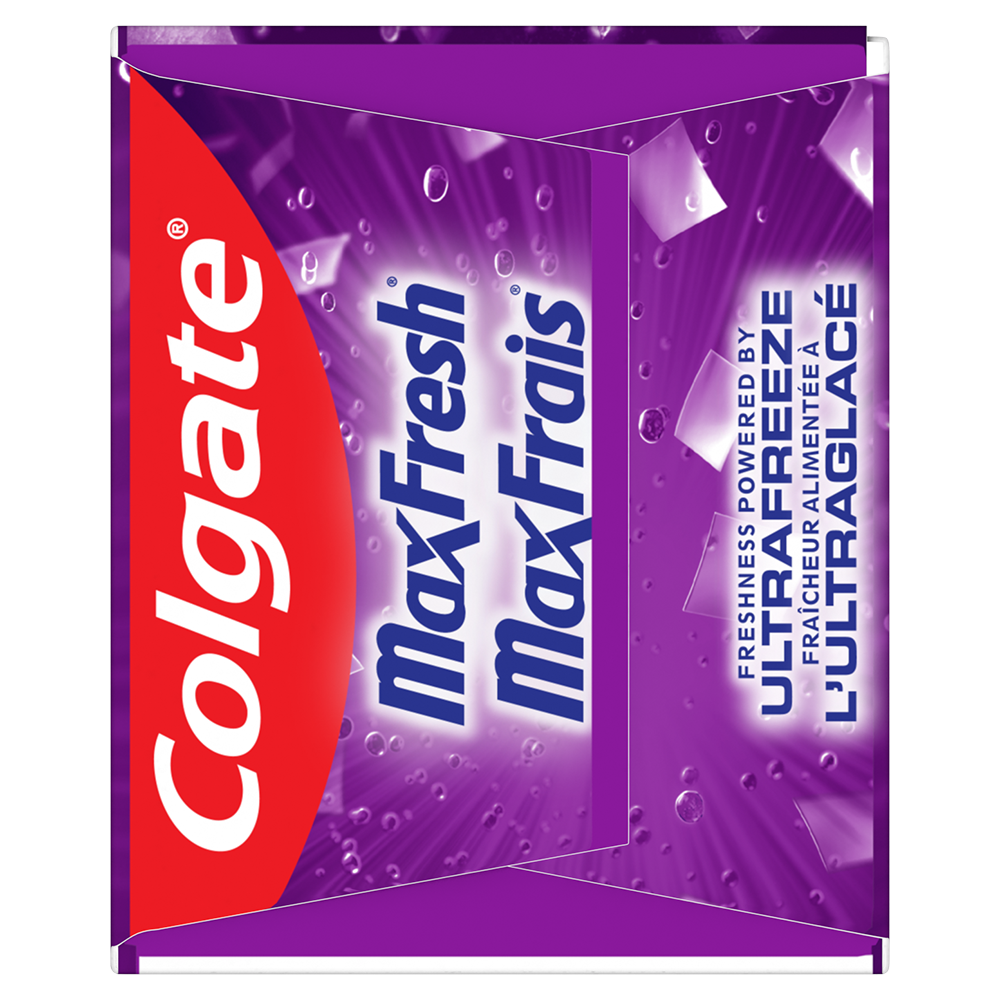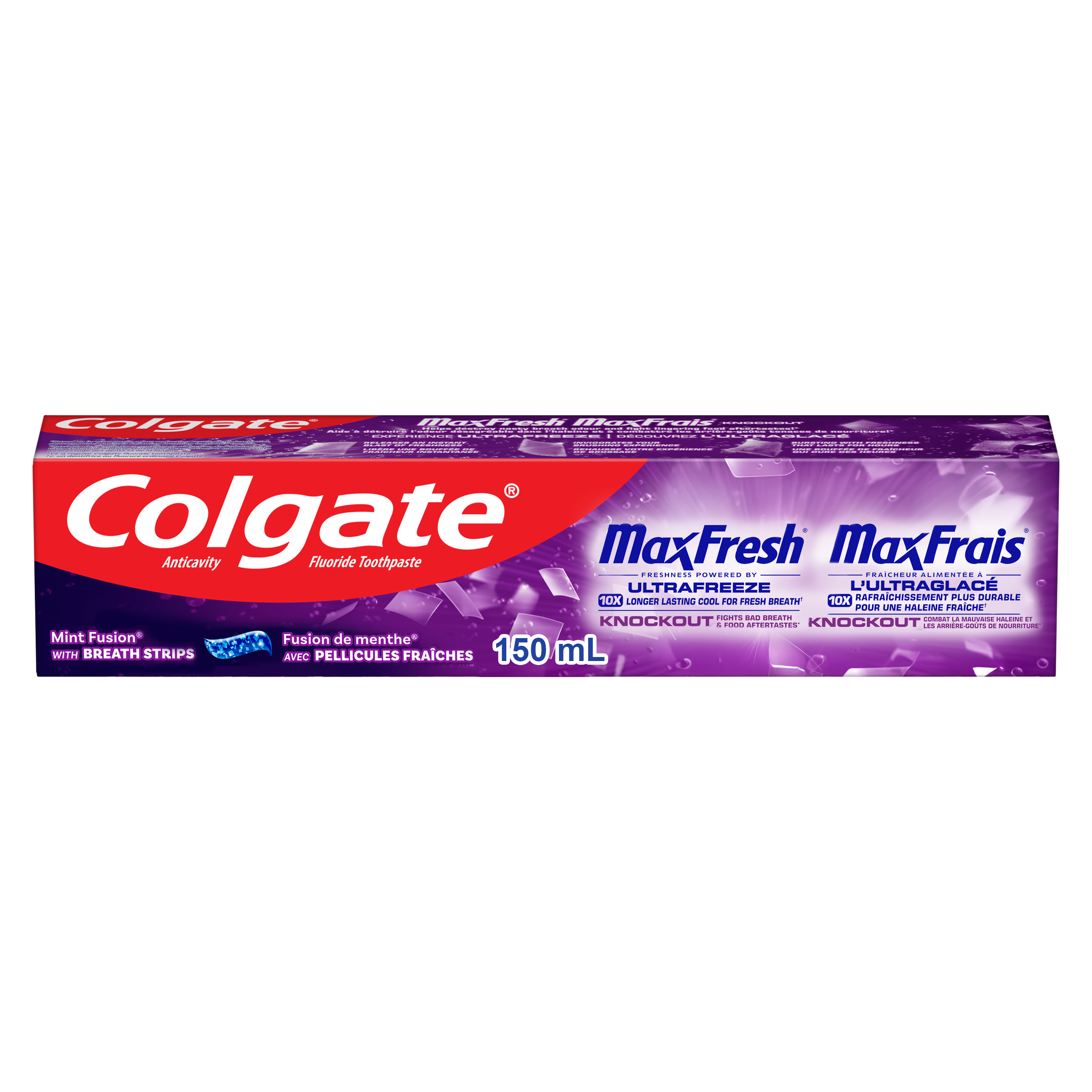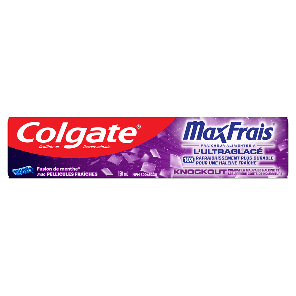 Product Title Dentifrice Colgate MaxFrais KnockOut, 150 mL SKU MX06042A SKU eCommerce Name Dentifrice Colgate MaxFrais KnockOut, 150 mL Consumer Unit - GTIN 00058000142336 Case - GTIN 10058000142333 Product Category Oral Care Product Sub Category Toothpaste Brand Colgate Product Sub Brand Colgate Max Fresh TP Consumer Unit Gross Weight 0.230 KG / 0.507 LB Consumer Unit Net Weight 0.204 KG / 0.450 LB Consumer Unit Length 43.000 MM / 1.693 IN Consumer Unit Width 232.000 MM / 9.134 IN Consumer Unit Height 51.000 MM / 2.008 IN Consumer Unit Volume 0.509 C8 / 0.018 CF Product Title Dentifrice Colgate MaxFrais KnockOut, 150 mL Product Description Libérez un jet instantané de fraîcheur et détruisez les mauvaises odeurs grâce au dentifrice Colgate MaxFrais Knockout. Grâce à l'action décuplée d’Ultrafreeze, ce dentifrice vivifiant à la menthe offre une fraîcheur qui dure 10 fois plus longtemps pour une haleine fraîche* et combat les arrière-goûts**. Ce dentifrice à la menthe, grâce à ses centaines de mini-feuilles, reste rafraîchissant pendant des heures. Le dentifrice Colgate MaxFrais est disponible au puissant goût de menthe qui vivifie l’expérience de brossage. La formule unique, avec une technologie qui neutralise les odeurs, détruit les mauvaises odeurs et vous permet de garder une haleine fraîche pendant des heures.** Cependant, plus qu’un simple dentifrice contre la mauvaise haleine, Colgate MaxFrais Knockout à la menthe contient du fluorure et prévient les caries. Grâce à son goût menthe rafraîchissant et ses centaines de mini-feuilles, Colgate MaxFrais apporte une fraîcheur durable à votre haleine. De plus, la formule au fluorure permet de combattre les caries. Profitez d'une haleine fraîche durable grâce au dentifrice Colgate MaxFrais. *par rapport à un dentifrice au fluorure Colgate ordinaire **selon les résultats d’une étude in-vitro de réduction des odeurs d'ail et d'une analyse d’un panel sensoriel descriptif après brossage des dents et de la langue eCommerce Copy Le dentifrice en gel Colgate MaxFrais KnockOut combat la carie, blanchit les dents et rafraîchit l’haleine grâce à la technologie de neutralisation des odeurs. eCommerce Copy- Long Description La formule unique du dentifrice en gel Colgate MaxFrais KnockOut avec technologie de neutralisation des odeurs aide à détruire les odeurs désagréables et à combattre les arrière-goûts tenaces (basé sur des résultats en matière de réduction des odeurs in vitro et sur une analyse sensorielle descriptive par un panel suite au brossage des dents et de la langue). Notre formule unique de dentifrice, avec sa super saveur de menthe, garde votre haleine fraîche pendant des heures. De plus, il combat la carie et blanchit les dents, vous donnant un sourire éclatant de santé. Bullet 1 Un (1) tube de 150 ml de dentifrice Colgate MaxFrais Knockout à la menthe Bullet 2 Grâce à l’action décuplée d’Ultrafreeze, Colgate MaxFrais offre une fraîcheur 10 fois plus longtemps* et détruit les odeurs et les arrière-goûts** Bullet 3 La formule du dentifrice au fluorure permet de combattre les caries Bullet 4 Ce dentifrice, grâce à ses centaines de mini-feuilles, reste rafraîchissant pendant des heures. Bullet 5 Libérez un jet instantané de fraîcheur grâce au dentifrice Colgate MaxFrais Knockout à la menthe OS Amazon Product Title Dentifrice Colgate MaxFrais Knockout à la menthe, 150 ml OS Amazon Product Description Libérez un jet instantané de fraîcheur et détruisez les mauvaises odeurs grâce au dentifrice Colgate MaxFrais Knockout. Grâce à l'action décuplée d’Ultrafreeze, ce dentifrice vivifiant à la menthe offre une fraîcheur qui dure 10 fois plus longtemps pour une haleine fraîche* et combat les arrière-goûts**. Ce dentifrice à la menthe, grâce à ses centaines de mini-feuilles, reste rafraîchissant pendant des heures. Le dentifrice Colgate MaxFrais est disponible au puissant goût de menthe qui vivifie l’expérience de brossage. La formule unique, avec une technologie qui neutralise les odeurs, détruit les mauvaises odeurs et vous permet de garder une haleine fraîche pendant des heures.** Cependant, plus qu’un simple dentifrice contre la mauvaise haleine, Colgate MaxFrais Knockout à la menthe contient du fluorure et prévient les caries. Grâce à son goût menthe rafraîchissant et ses centaines de mini-feuilles, Colgate MaxFrais apporte une fraîcheur durable à votre haleine. De plus, la formule au fluorure permet de combattre les caries. Profitez d'une haleine fraîche durable grâce au dentifrice Colgate MaxFrais. *par rapport à un dentifrice au fluorure Colgate ordinaire **selon les résultats d’une étude in-vitro de réduction des odeurs d'ail et d'une analyse d’un panel sensoriel descriptif après brossage des dents et de la langue OS Amazon Bullet 1 Un (1) tube de 150 ml de dentifrice Colgate MaxFrais Knockout à la menthe OS Amazon Bullet 2 Grâce à l’action décuplée d’Ultrafreeze, Colgate MaxFrais offre une fraîcheur 10 fois plus longtemps* et détruit les odeurs et les arrière-goûts** OS Amazon Bullet 3 La formule du dentifrice au fluorure permet de combattre les caries OS Amazon Bullet 4 Ce dentifrice, grâce à ses centaines de mini-feuilles, reste rafraîchissant pendant des heures. OS Amazon Bullet 5 Libérez un jet instantané de fraîcheur grâce au dentifrice Colgate MaxFrais Knockout à la menthe OS Walmart Product Title Dentifrice Colgate MaxFrais Knockout à la menthe, 150 ml OS Walmart Product Description Dentifrice Colgate MaxFrais Knockout à la menthe, 150 ml Libérez un jet instantané de fraîcheur et détruisez les mauvaises odeurs grâce au dentifrice Colgate MaxFrais Knockout. Grâce à l'action décuplée d’Ultrafreeze, ce dentifrice vivifiant à la menthe offre une fraîcheur qui dure 10 fois plus longtemps (1) et combat les arrière-goûts (2). Ce dentifrice à la menthe, grâce à ses centa
