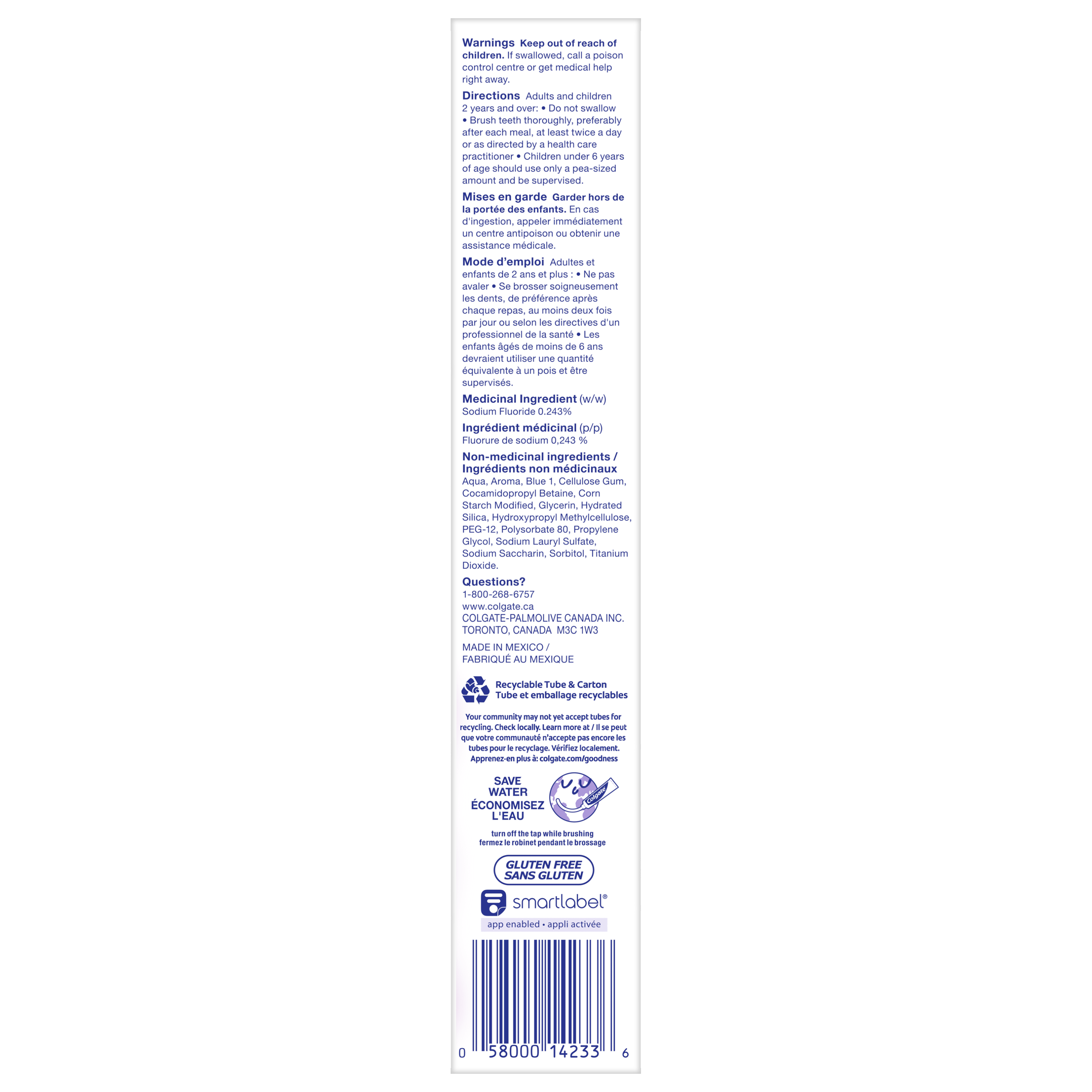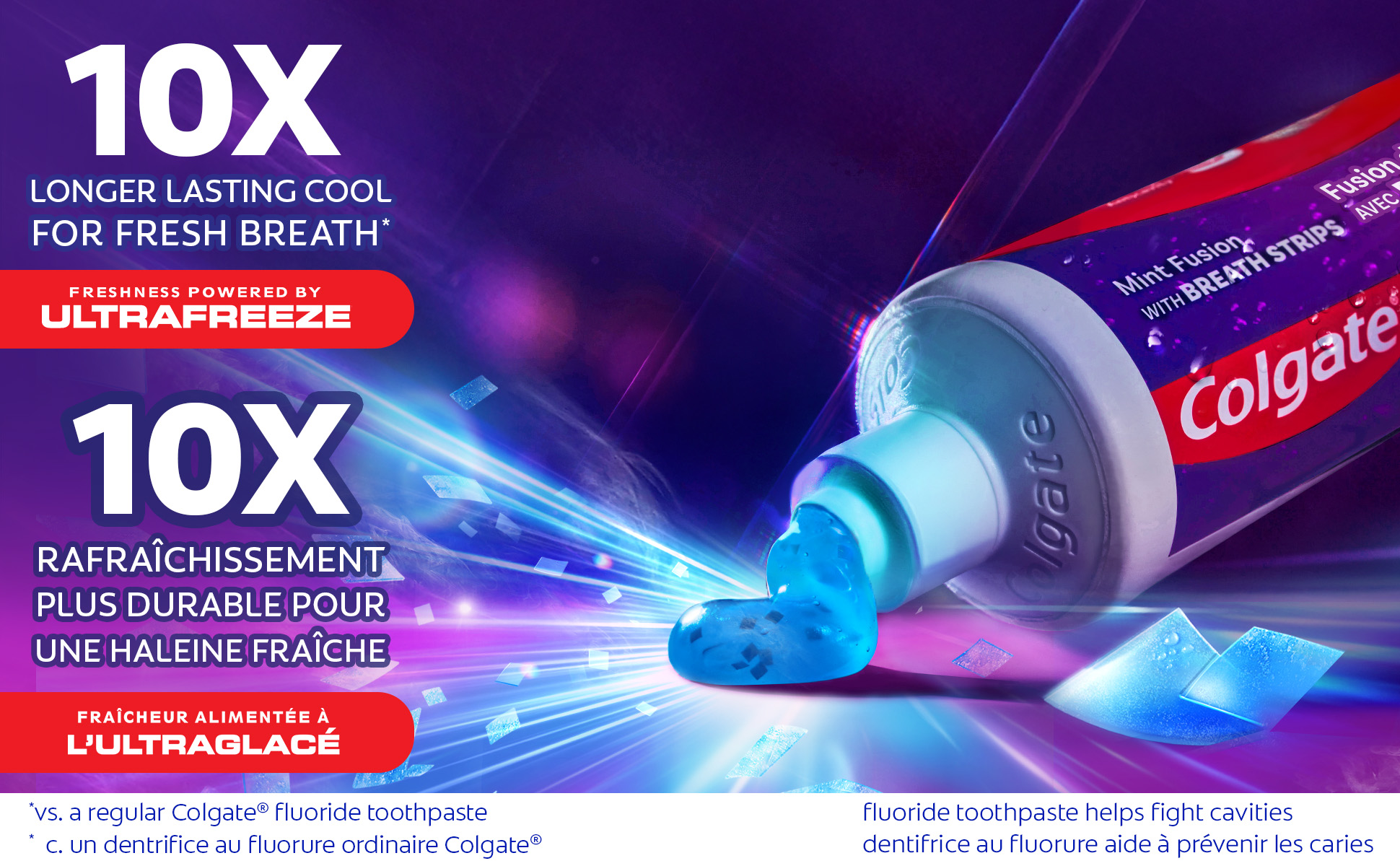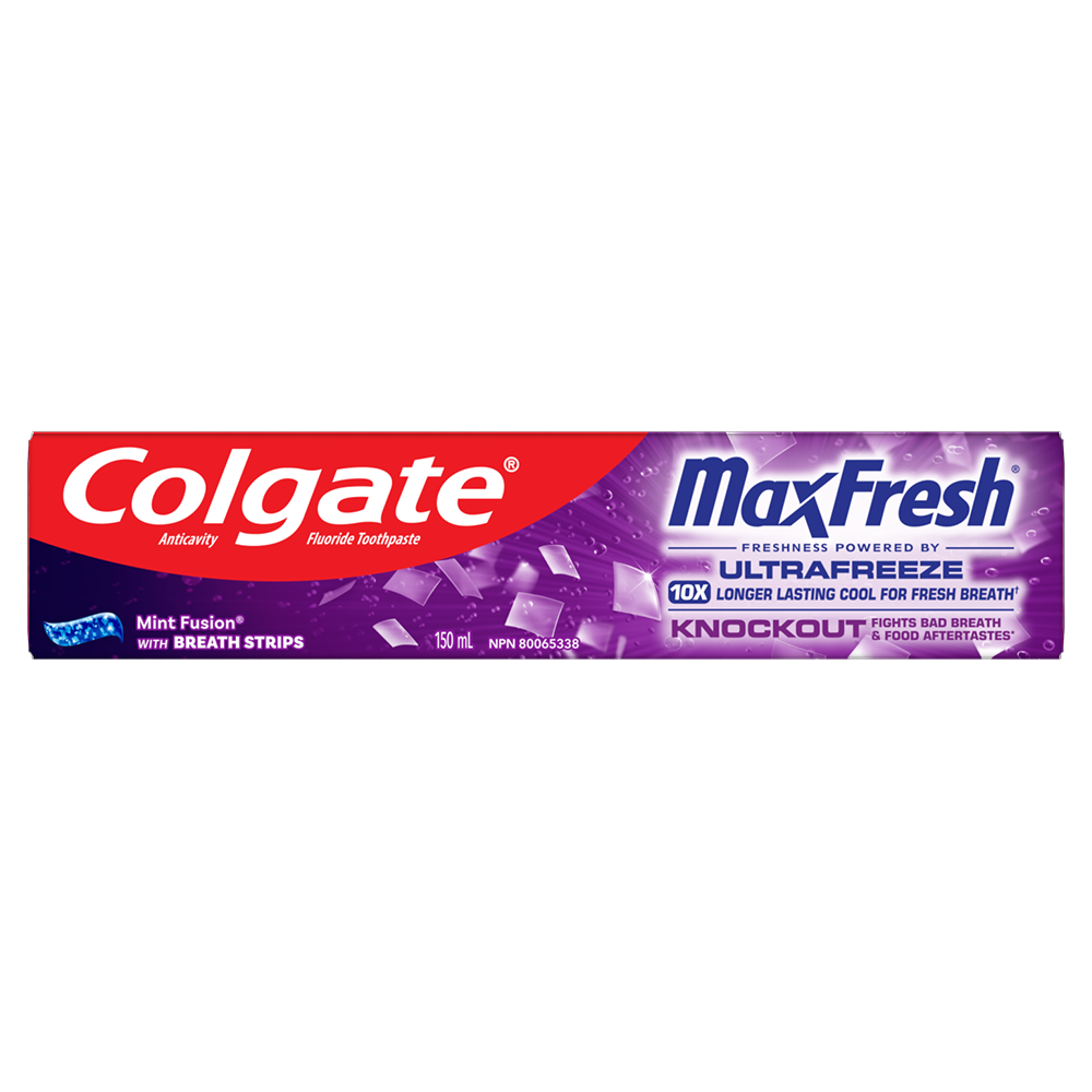 Product Title Dentifrice Colgate MaxFrais KnockOut, 150 mL SKU MX06042A SKU eCommerce Name Dentifrice Colgate MaxFrais KnockOut, 150 mL Consumer Unit - GTIN 00058000142336 Case - GTIN 10058000142333 Product Category Oral Care Product Sub Category Toothpaste Brand Colgate Product Sub Brand Colgate Max Fresh TP Consumer Unit Gross Weight 0.230 KG / 0.507 LB Consumer Unit Net Weight 0.204 KG / 0.450 LB Consumer Unit Length 43.000 MM / 1.693 IN Consumer Unit Width 232.000 MM / 9.134 IN Consumer Unit Height 51.000 MM / 2.008 IN Consumer Unit Volume 0.509 C8 / 0.018 CF Product Title Dentifrice Colgate MaxFrais KnockOut, 150 mL Product Description Libérez un jet instantané de fraîcheur et détruisez les mauvaises odeurs grâce au dentifrice Colgate MaxFrais Knockout. Grâce à l'action décuplée d’Ultrafreeze, ce dentifrice vivifiant à la menthe offre une fraîcheur qui dure 10 fois plus longtemps pour une haleine fraîche* et combat les arrière-goûts**. Ce dentifrice à la menthe, grâce à ses centaines de mini-feuilles, reste rafraîchissant pendant des heures. Le dentifrice Colgate MaxFrais est disponible au puissant goût de menthe qui vivifie l’expérience de brossage. La formule unique, avec une technologie qui neutralise les odeurs, détruit les mauvaises odeurs et vous permet de garder une haleine fraîche pendant des heures.** Cependant, plus qu’un simple dentifrice contre la mauvaise haleine, Colgate MaxFrais Knockout à la menthe contient du fluorure et prévient les caries. Grâce à son goût menthe rafraîchissant et ses centaines de mini-feuilles, Colgate MaxFrais apporte une fraîcheur durable à votre haleine. De plus, la formule au fluorure permet de combattre les caries. Profitez d'une haleine fraîche durable grâce au dentifrice Colgate MaxFrais. *par rapport à un dentifrice au fluorure Colgate ordinaire **selon les résultats d’une étude in-vitro de réduction des odeurs d'ail et d'une analyse d’un panel sensoriel descriptif après brossage des dents et de la langue eCommerce Copy Le dentifrice en gel Colgate MaxFrais KnockOut combat la carie, blanchit les dents et rafraîchit l’haleine grâce à la technologie de neutralisation des odeurs. eCommerce Copy- Long Description La formule unique du dentifrice en gel Colgate MaxFrais KnockOut avec technologie de neutralisation des odeurs aide à détruire les odeurs désagréables et à combattre les arrière-goûts tenaces (basé sur des résultats en matière de réduction des odeurs in vitro et sur une analyse sensorielle descriptive par un panel suite au brossage des dents et de la langue). Notre formule unique de dentifrice, avec sa super saveur de menthe, garde votre haleine fraîche pendant des heures. De plus, il combat la carie et blanchit les dents, vous donnant un sourire éclatant de santé. Bullet 1 Un (1) tube de 150 ml de dentifrice Colgate MaxFrais Knockout à la menthe Bullet 2 Grâce à l’action décuplée d’Ultrafreeze, Colgate MaxFrais offre une fraîcheur 10 fois plus longtemps* et détruit les odeurs et les arrière-goûts** Bullet 3 La formule du dentifrice au fluorure permet de combattre les caries Bullet 4 Ce dentifrice, grâce à ses centaines de mini-feuilles, reste rafraîchissant pendant des heures. Bullet 5 Libérez un jet instantané de fraîcheur grâce au dentifrice Colgate MaxFrais Knockout à la menthe OS Amazon Product Title Dentifrice Colgate MaxFrais Knockout à la menthe, 150 ml OS Amazon Product Description Libérez un jet instantané de fraîcheur et détruisez les mauvaises odeurs grâce au dentifrice Colgate MaxFrais Knockout. Grâce à l'action décuplée d’Ultrafreeze, ce dentifrice vivifiant à la menthe offre une fraîcheur qui dure 10 fois plus longtemps pour une haleine fraîche* et combat les arrière-goûts**. Ce dentifrice à la menthe, grâce à ses centaines de mini-feuilles, reste rafraîchissant pendant des heures. Le dentifrice Colgate MaxFrais est disponible au puissant goût de menthe qui vivifie l’expérience de brossage. La formule unique, avec une technologie qui neutralise les odeurs, détruit les mauvaises odeurs et vous permet de garder une haleine fraîche pendant des heures.** Cependant, plus qu’un simple dentifrice contre la mauvaise haleine, Colgate MaxFrais Knockout à la menthe contient du fluorure et prévient les caries. Grâce à son goût menthe rafraîchissant et ses centaines de mini-feuilles, Colgate MaxFrais apporte une fraîcheur durable à votre haleine. De plus, la formule au fluorure permet de combattre les caries. Profitez d'une haleine fraîche durable grâce au dentifrice Colgate MaxFrais. *par rapport à un dentifrice au fluorure Colgate ordinaire **selon les résultats d’une étude in-vitro de réduction des odeurs d'ail et d'une analyse d’un panel sensoriel descriptif après brossage des dents et de la langue OS Amazon Bullet 1 Un (1) tube de 150 ml de dentifrice Colgate MaxFrais Knockout à la menthe OS Amazon Bullet 2 Grâce à l’action décuplée d’Ultrafreeze, Colgate MaxFrais offre une fraîcheur 10 fois plus longtemps* et détruit les odeurs et les arrière-goûts** OS Amazon Bullet 3 La formule du dentifrice au fluorure permet de combattre les caries OS Amazon Bullet 4 Ce dentifrice, grâce à ses centaines de mini-feuilles, reste rafraîchissant pendant des heures. OS Amazon Bullet 5 Libérez un jet instantané de fraîcheur grâce au dentifrice Colgate MaxFrais Knockout à la menthe OS Walmart Product Title Dentifrice Colgate MaxFrais Knockout à la menthe, 150 ml OS Walmart Product Description Dentifrice Colgate MaxFrais Knockout à la menthe, 150 ml Libérez un jet instantané de fraîcheur et détruisez les mauvaises odeurs grâce au dentifrice Colgate MaxFrais Knockout. Grâce à l'action décuplée d’Ultrafreeze, ce dentifrice vivifiant à la menthe offre une fraîcheur qui dure 10 fois plus longtemps (1) et combat les arrière-goûts (2). Ce dentifrice à la menthe, grâce à ses centa