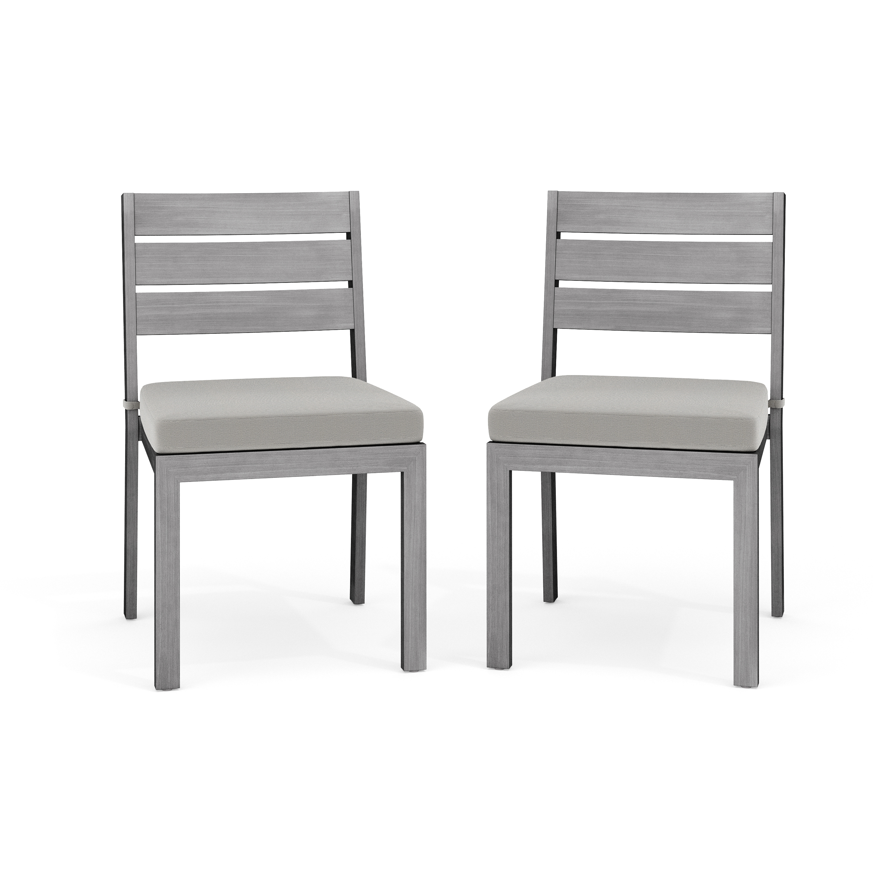 Bedford Set of 2 Indoor-Outdoor Stackable Patio Dining Chairs with Gray Brushed Woodgrain Aluminum Finish and Gray All-Weather Seat Cushions