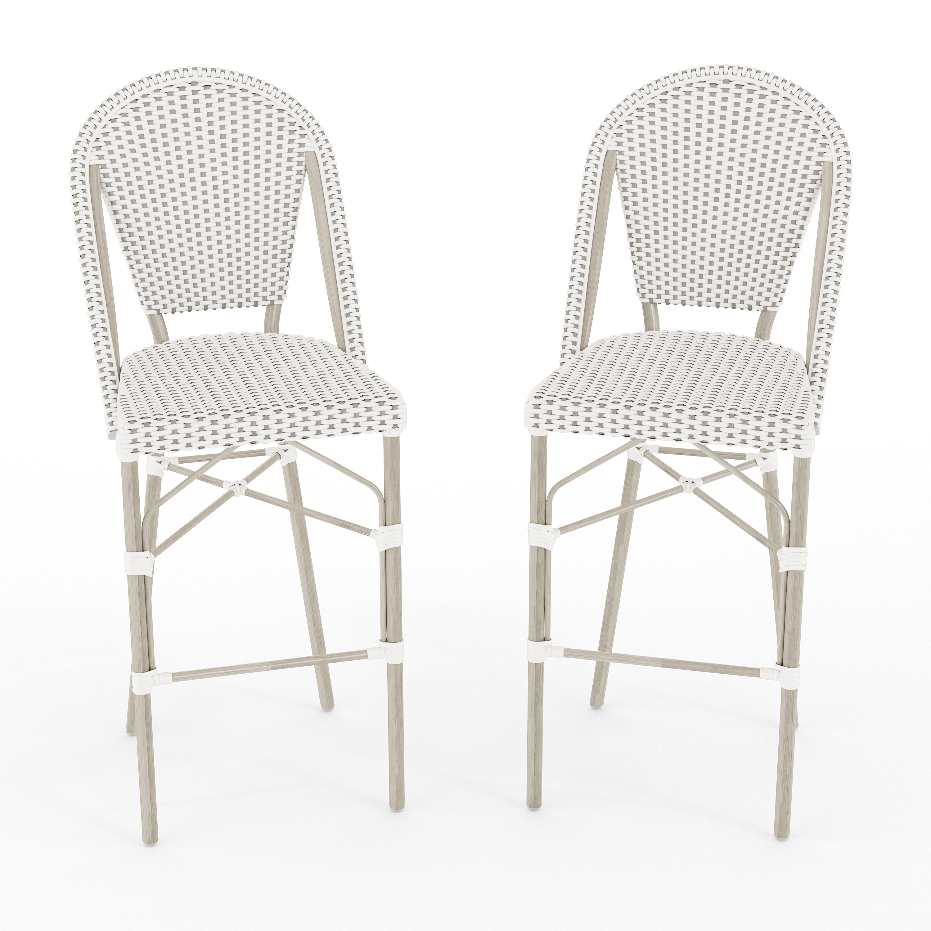 Lily Pond Set of 2 Indoor-Outdoor Stackable Bistro Bar Stools with Gray Woodgrain Aluminum Finish Frames, White/Gray Woven Rattan Backs/Seats