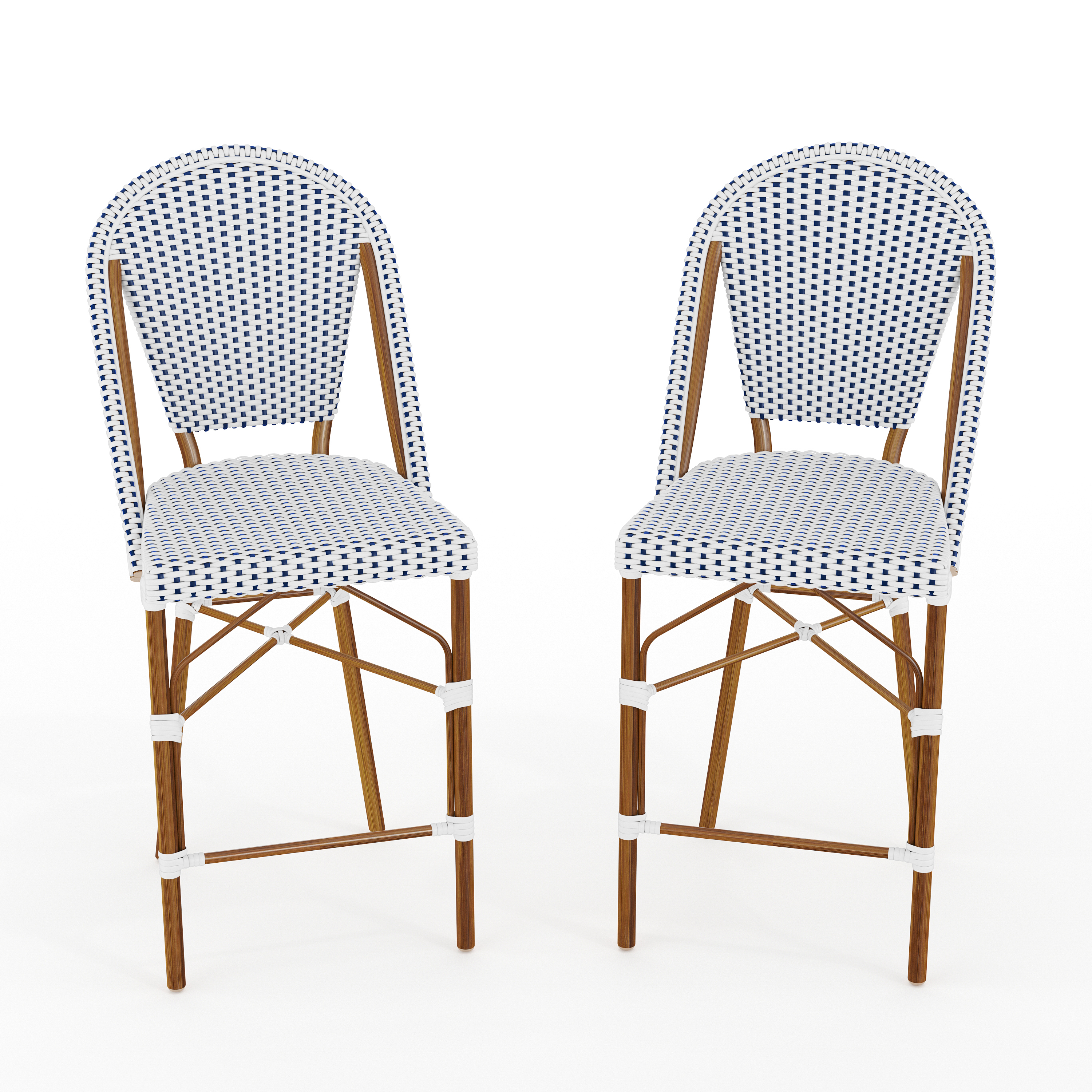 Lily Pond Set of 2 Indoor-Outdoor Stackable Bistro Counter Stools with Natural Woodgrain Aluminum Finish Frame, White/Navy Woven Rattan Back/Seat