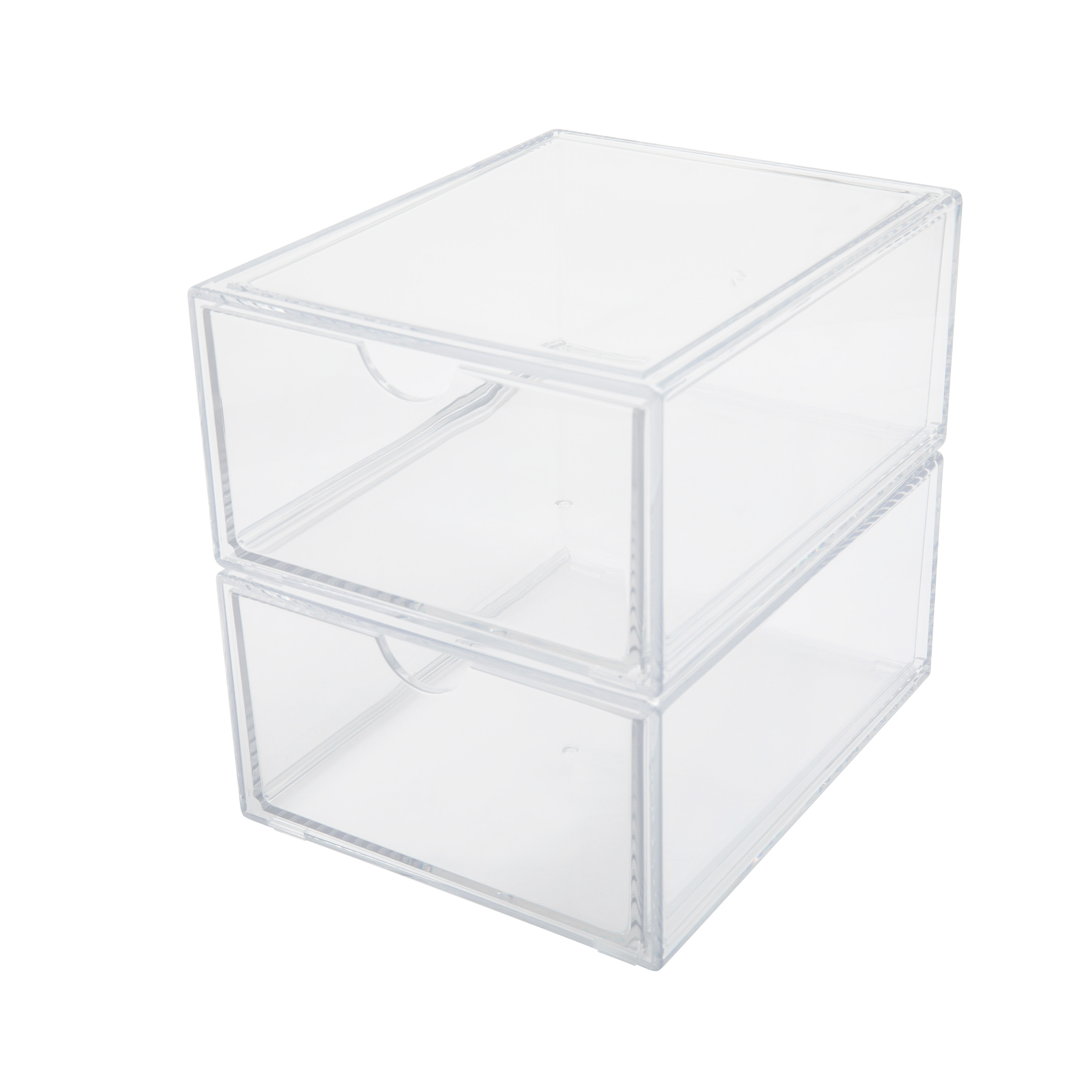 UPC Code 196861055676 Product Series Brody Product Family Thomas Bundle Size 2 Planned to Discontinue No Warranty 1 Year Limited Rated For Commercial Use No Cleaning Code Damp cloth Assembly Required No Item Weight 1.2 Colors Clear Key Feature Bullet 1 Easily locate pens, pencils, makeup brushes or coupons while maintaining neat and tidy spaces with this Set of 2 Martha Stewart Stackable Organizer Boxes with Pullout Drawers Key Feature Bullet 2 Stackable design allows for vertical configurations while lower grooves lock in place for stability and non-skid feet keep each unit in place Key Feature Bullet 3 Premium crack resistant and BPA free plastic with half-moon cutout for easy opening and closing Key Feature Bullet 4 No assembly required and wipes clean with damp cloth Key Feature Bullet 5 Dimensions (2) - 6"W x 7.5"D x 3.5"H Bullet_1 Set of 2 stackable organizer boxes with easy open drawers Bullet_2 Clear Bullet_3 Premium BPA free and crack resistant plastic Bullet_4 Half-Moon shaped cutout drawers for easy opening and closing Bullet_5 Lower grooves lock into place for stability Bullet_6 Non-Skid feet keep each piece in place Bullet_7 No assembly required Bullet_8 Wipe clean with a damp cloth Product Copy Organize a multitude of supplies and accessories with this Set of 2 Martha Stewart Brody Organizer Boxes with Drawers and keep all of your surfaces clutter-free. Premium BPA-free and crack-resistant plastic holds up well in almost any environment from your desktop to your bathroom vanity for many years of use. The removable drawers are accented with a half-moon cutout for easy opening and closing while the crystal clear housings make locating your items effortless. The stackable design enables you to use vertical instead of horizontal real estate, which makes this storage drawer set a great space-saver. Lower grooves lock in place for stability and non-skid feet ensure the boxes stay in your desired location to maintain a neat and tidy appearance.