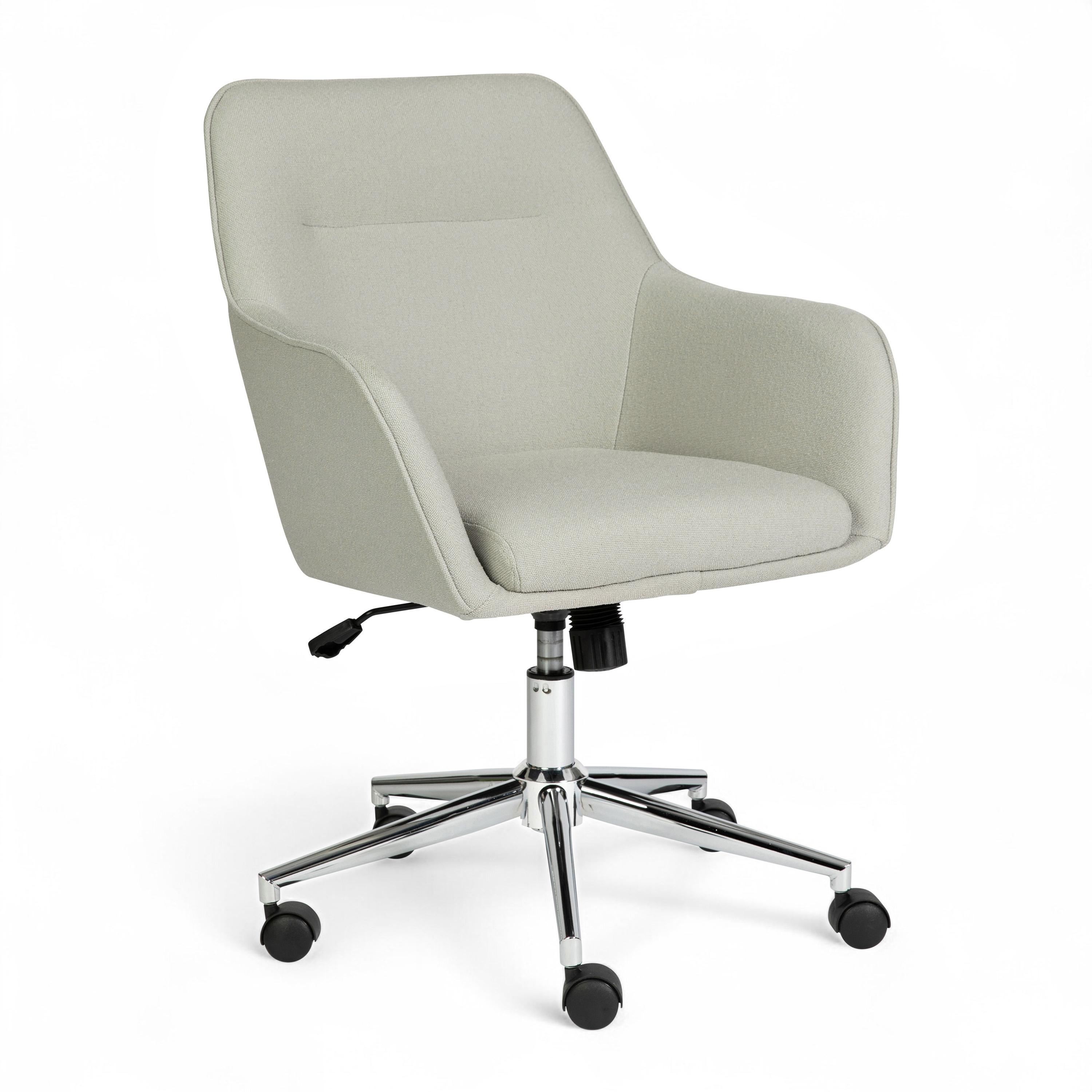 UPC Code 196861189180 Product Series Rayna Product Family Jones Planned to Discontinue No Warranty 1 Year Limited Rated For Commercial Use Yes Cleaning Code Dry Cloth Assembly Required Yes Assembly Level Easy Assembly Time Frame 10-30 Minutes Item Weight 29.0 Weight Capacity 300 Colors Gray Key Feature Bullet 1 Elevate your home office decor with the luxurious style of the Martha Stewart Rayna Office Chair Key Feature Bullet 2 The seat and back are upholstered in a soft fabric complemented by the polished nickel metal frame for an iconic look Key Feature Bullet 3 360° Swivel seat with pneumatic height adjustment, tilt lock and tilt tension provides a custom seating experience Key Feature Bullet 4 Assembly and Care Instructions: Quick and easy assembly with included tools and wipes clean with dry cloth Key Feature Bullet 5 Dimensions - 24.5"W x 21.75"D x 33-36.25"H; Seat Size: 16.75"W x 17.25"D x 17.75-20.75"H; Back Size: 18"W x 16.75"H; Arm Size: 30"H from floor; 2.75"H from seat; Maximum Static Weight Capacity: 300 LBS. Bullet_1 Updated office chair features simple elegance for any home office Bullet_2 Contemporary style office chair in light gray fabric upholstery Bullet_3 Gently flared armrests Bullet_4 Powder coated polished nickel frame with dual wheel casters Bullet_5 Pneumatic height adjustable 360° swivel seat Bullet_6 Tilt lock and tilt tension controls Bullet_7 Maximum static weight capacity: 300 lbs. Bullet_8 Wipe clean with a dry cloth Product Copy The Martha Stewart Rayna Office Chair is an elevated version of the traditional accent chair modified for your work space. The height adjustable 360° swivel seat boasts gentle contouring paired with flared arms for personalized performance and understated elegance. This fabric upholstered desk chair, with its polished nickel frame, holds you in comfort throughout your workday while lending an eye-catching sophistication to your home office or study. Assembly is easy with the included tools and step-by-step instructions.