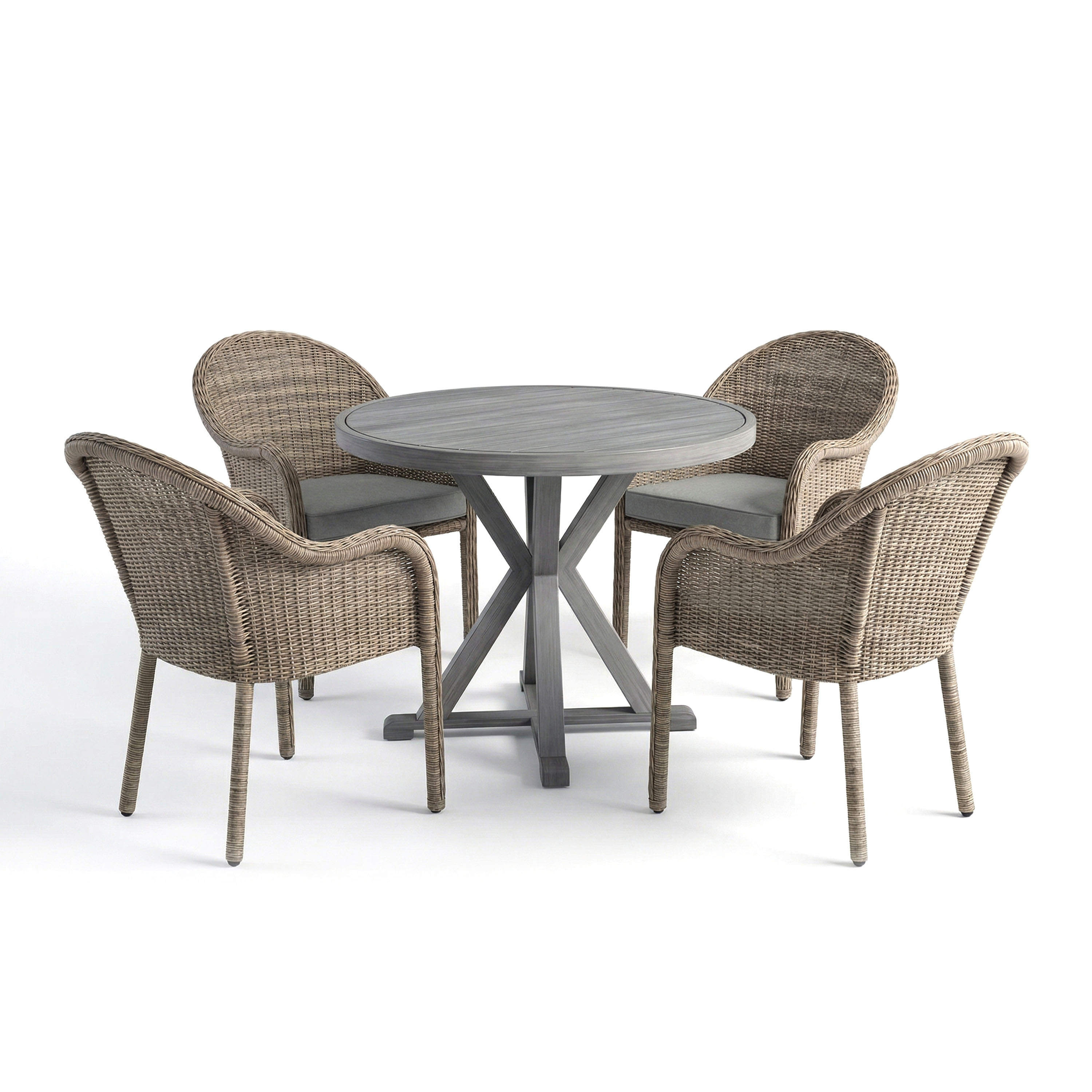Bedford 5 Piece Patio Set, 4 Stacking Weathered Gray Rattan Wicker Chairs, Gray Cushions, 36" Round Gray Brushed Woodgrain Aluminum Trestle Base Table