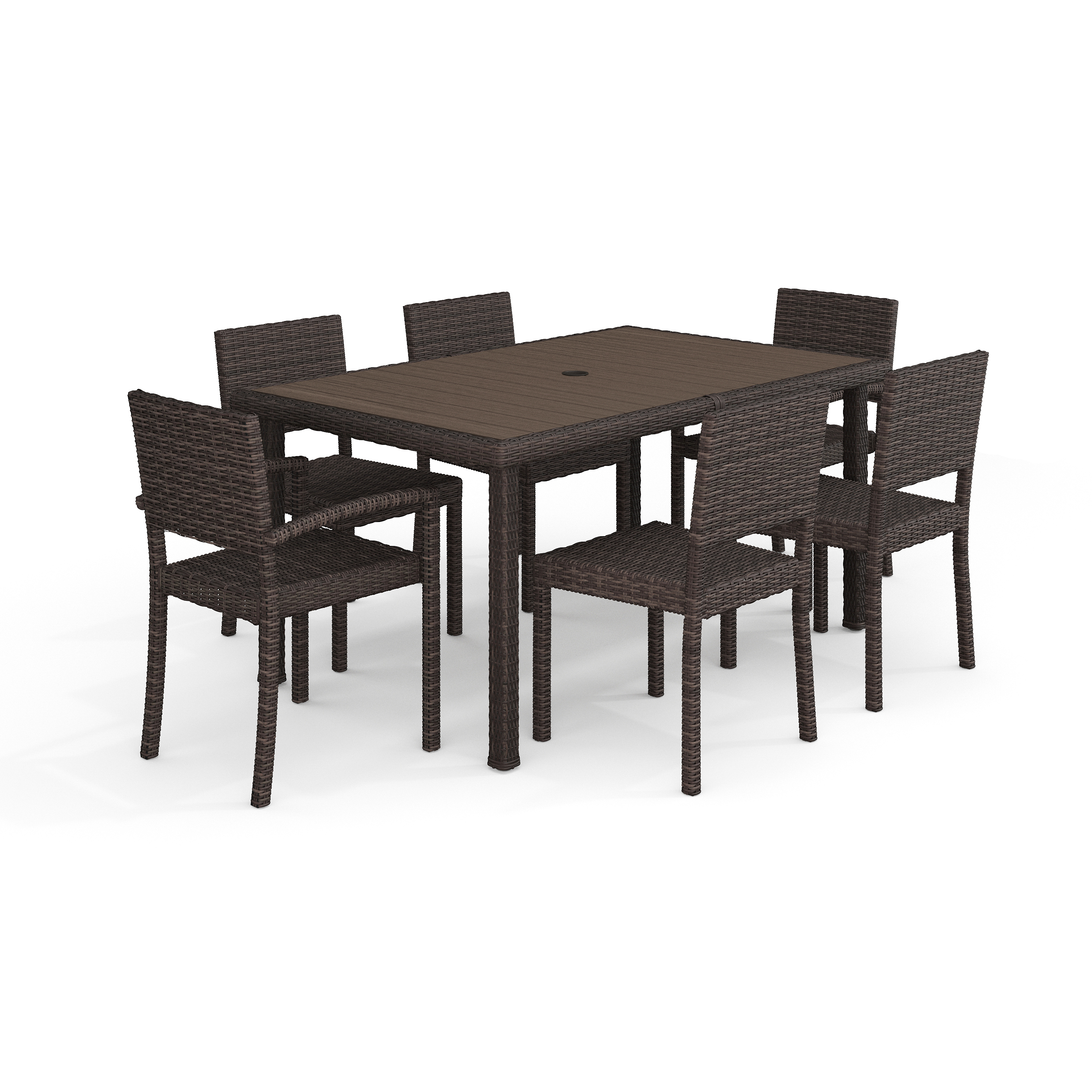 Bedford 7-Piece Indoor-Outdoor Dining Set with 6 Stackable Dining Chairs and 62" Patio Table with Engineered Wood Top in Brown Rattan Wicker