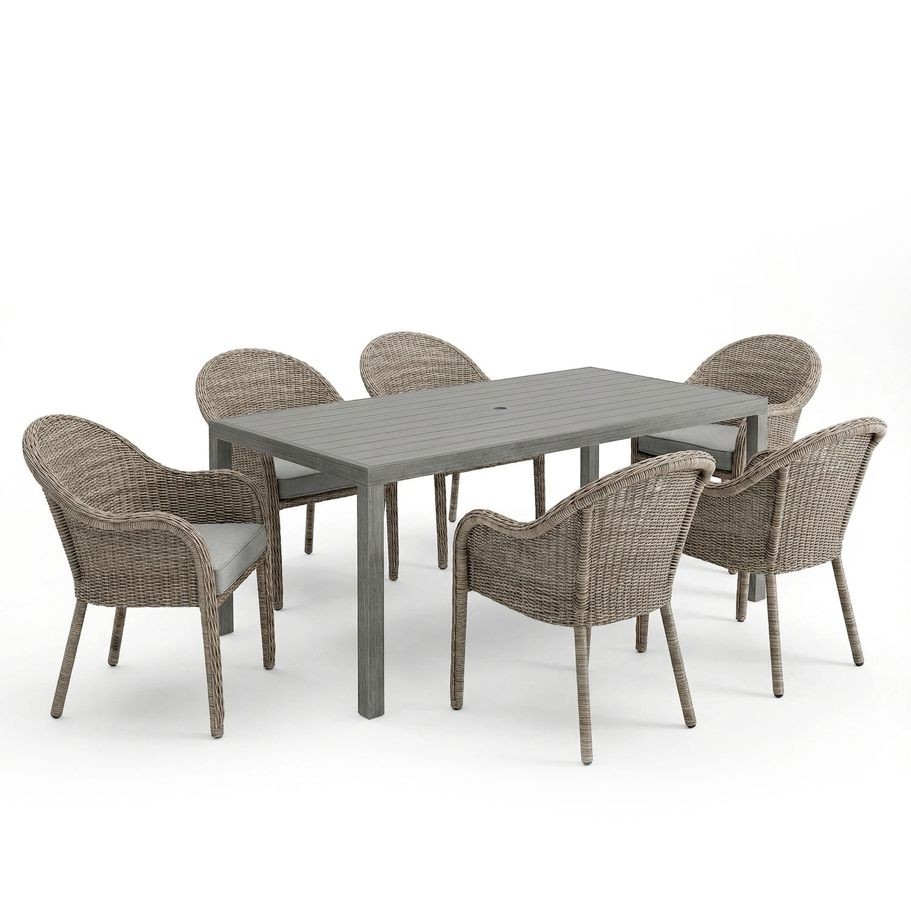 Bedford 7 Piece Patio Set, 6 Stacking Weathered Gray Rattan Wicker Chairs, Gray Cushions, 62 Inch Rectangular Gray Brushed Woodgrain Aluminum Table