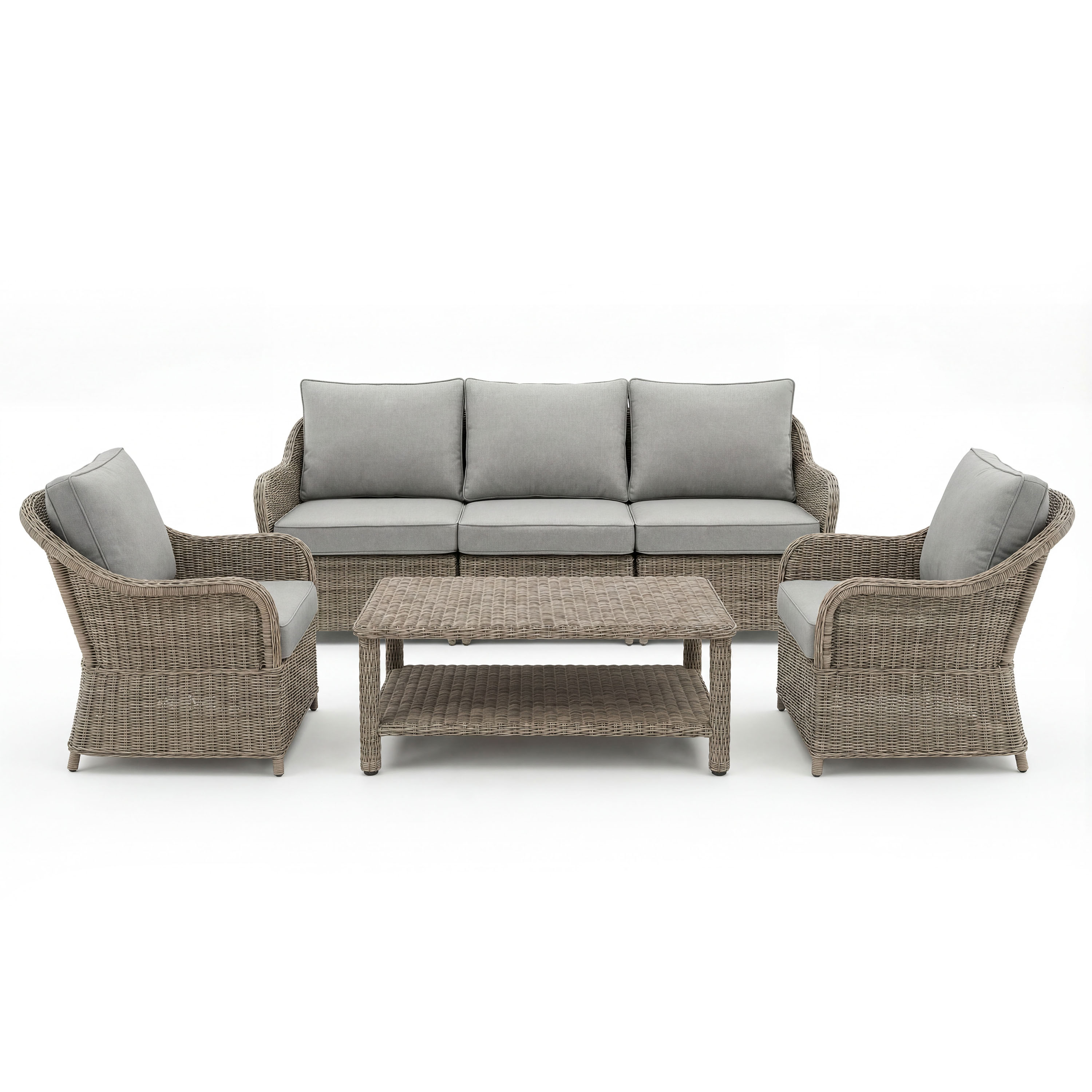 UPC Code 889142910091 Product Series Lily Pond Product Family Brantley Set Includes Patio Lounge Loveseat-1;Patio Lounge Chair-3;Patio Coffee Table-1 Planned to Discontinue No Warranty 1 Year Limited Rated For Commercial Use No Cleaning Code Damp cloth Assembly Required Yes Assembly Level Easy Assembly Time Frame 1-10 Minutes Item Weight 146.0 Weight Capacity 900 Table Weight Capacity 200 Shelf Weight Capacity 50 Seating Capacity 5 Colors Gray Key Feature Bullet 1 Elegant rattan wicker design in weathered gray adds timeless style and comfort that elevates the look of any indoor or outdoor space Key Feature Bullet 2 Durable and supportive steel frames wrapped in rattan wicker support up to 300 lbs. per seat. Features 4" thick weather-resistant olefin seat cushions with full back cushions; coffee table holds 200 lbs. static weight Key Feature Bullet 3 Pair with other modular pieces in the collection to craft a custom ensemble that fits your entertaining needs Key Feature Bullet 4 Assembly and Care Instructions: Simply unpack, attach the joining clips for the sofa, and add the cushions; Upkeep is easy with removable washable cushion covers and a damp cloth Key Feature Bullet 5 Sofa: 81.75"W x 31.25"D x 30.25"H; Seat Size: 76.5"W x 26.25"D x 17.5"H; Back Size: 76.5"W x 1.75"D x 18"H; Arm Size: 23.25"H from floor; 10.25"H from seat; Chairs (2) : 31"W x 31.25"D x 30.25"H; Seat Size: 27.5"W x 26.25"D x 17.5"H; Back Size: 1.5"D x 18.25"H; Arm Size: 23.25"H from floor; 10.25"H from seat; Table: 40.5"W x 22"D x 16.75"H; Shelf Size: 36.5"W x 18"D x 9.25"H Bullet 1 Contemporary indoor outdoor 6 piece patio set instills any patio with chic comfort and style Bullet 2 Set includes 3-seat sofa, two club chairs and 2-tier coffee table Bullet 3 Sturdy steel frames with weathered gray, all-weather wicker rattan construction Bullet 4 4" Thick seat cushions and padded back cushions crafted from water-resistant weathered gray Olefin fabric Bullet 5 Maximum static weight capacity: 300 lbs. per seat; Coffee table: 200 lbs. Bullet 6 Fixed floor glides to protect indoor flooring surfaces Bullet 7 Clip sofa pieces together and add the cushions; Coffee table assembles in 30 minutes or less Bullet 8 Clean with a damp cloth; Unzip and remove cushion covers for machine washing Bullet 9 Pairs with other modular items in the collection Product Copy Elevate your indoor or outdoor living space with the Martha Stewart Lily Pond 5-Piece Rattan Wicker Patio Set, thoughtfully designed to bring timeless elegance and lasting comfort to any home. This versatile set includes a 3-seat sofa, two club chairs, and a coffee table, creating a complete seating area ideal for relaxing, entertaining, or everyday lounging. Each piece is crafted with a durable steel frame wrapped in premium weathered gray rattan wicker, offering strength, style, and year-round resilience. The sofa and club chairs feature gently curved armrests and plush 4-inch thick all-weather seat cushions, paired with generously padded back cushions to deliver exceptional comfort. The coordinating coffee table includes a lower storage shelf—perfect for keeping décor, books, or outdoor essentials within easy reach. This set also pairs beautifully with other modular pieces in the collection, allowing you to customize a cohesive and inviting outdoor retreat. Assembly is simple: attach the joining clips to the sofa, add the cushions, and assemble the coffee table in 30 minutes or less. Maintenance is effortless as well—wipe the rattan wicker clean with a damp cloth, and remove the all-weather cushion covers for convenient machine washing. Whether hosting family gatherings, enjoying quiet morning coffee, or unwinding after a long day, this patio set offers refined style, comfort, and versatility that complements any décor.