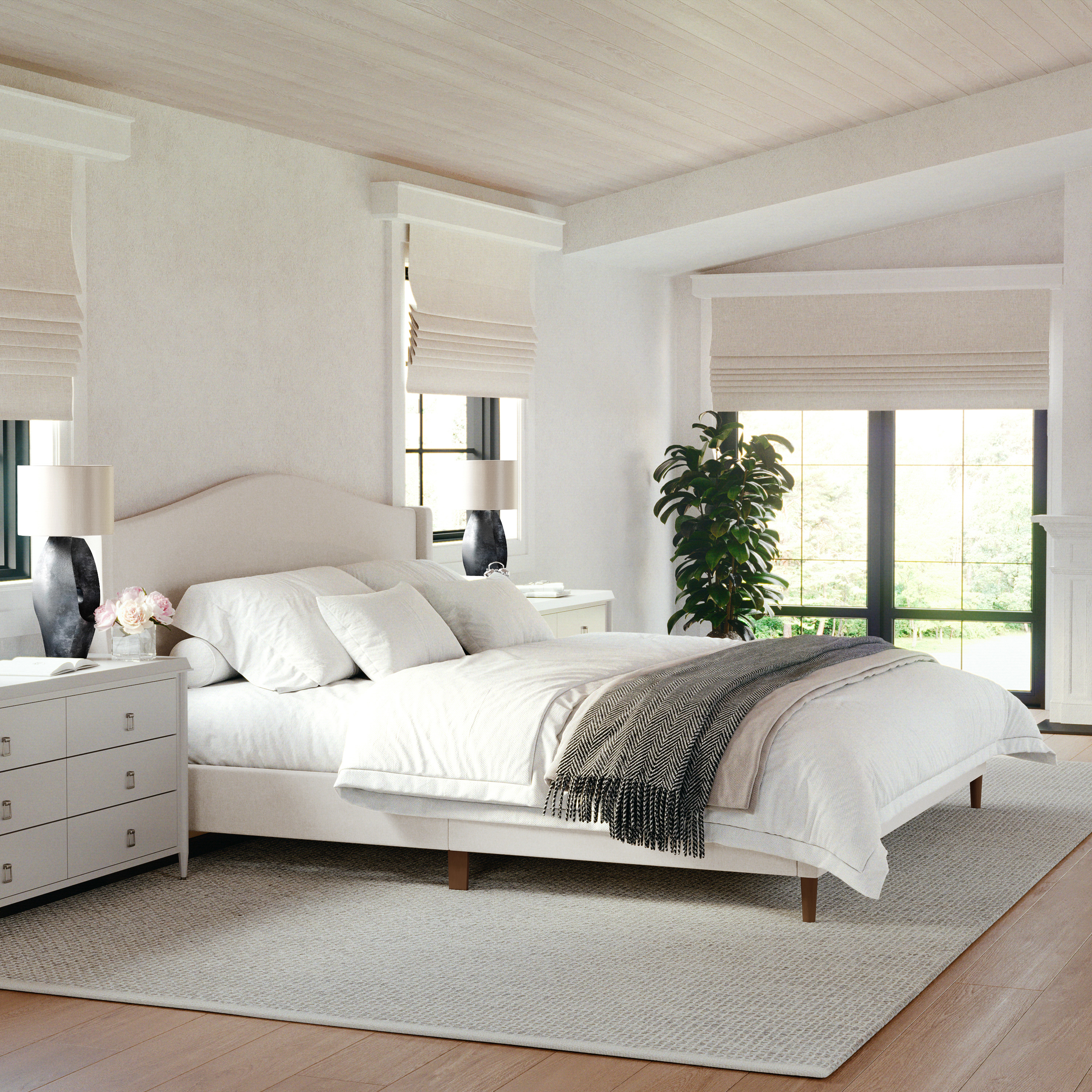 UPC Code 196861066795 Product Series Amelia Product Family Amelia Planned to Discontinue No Warranty 2 Years Limited Rated For Commercial Use No Cleaning Code Vacuum or light brushing to remove dirt Assembly Required Yes Assembly Level Medium Assembly Time Frame 30-60 Minutes Item Weight 121.77 Weight Capacity 800 Colors Beige Key Feature Bullet 1 Effortlessly elevate any sleep space with the softly curved design of this perfectly proportioned platform bed that does not require a box spring Key Feature Bullet 2 Faux linen upholstery covers the headboard, footboard and the cushioned side rails that sit atop tapered wooden legs that give 6" of underbed storage space Key Feature Bullet 3 A solid wood frame paired with the wood slat foundation hold up to 500 lbs. of static weight for full size and 800 lbs. of static weight for queen and king sizes Key Feature Bullet 4 Illustrated instructions guide you through the assembly process in under one hour Key Feature Bullet 5 Dimensions: 82.25"W x 86.75"D x 45.5"H Bullet_1 Contemporary King Size Upholstered Platform Bed with Curved Headboard Bullet_2 Beige Faux Linen Upholstery Bullet_3 Curved Wingback Headboard Bullet_4 Cushioned Side Rails with 6" Under Bed Clearance Bullet_5 Solid Wood Frame Holds up to 800 LBS. Static Weight Bullet_6 Wood Slat Foundation with No Box Spring Required Bullet_7 Tapered Wooden Legs Bullet_8 Assembles in Under One Hour Bullet_9 Vacuum or Lightly Brush to Remove Soil Product Copy A gracefully contoured silhouette dressed in beautiful faux linen upholstery makes the Martha Stewart Amelia Platform Bed a stunning addition to any bedroom in your home. Durably crafted with an eye toward longevity, this bed frame is outfitted with a solid wood frame and tapered wood legs ensuring 800 lbs. of static weight capacity. Cushioned siderails sit 6 inches from the floor creating storage space and adding to the understated elegance of this platform bed. No box spring is required with the wood slat foundation, just add your favorite mattress and bedding to complete your desired look. Illustrated step-by-step instructions guide you through the assembly process so you can elevate your sleep space in no time. Optimize your sleep experience and pair this bed with one of our premium Martha Stewart SleepComplete mattresses for an exceptional look and luxurious comfort.