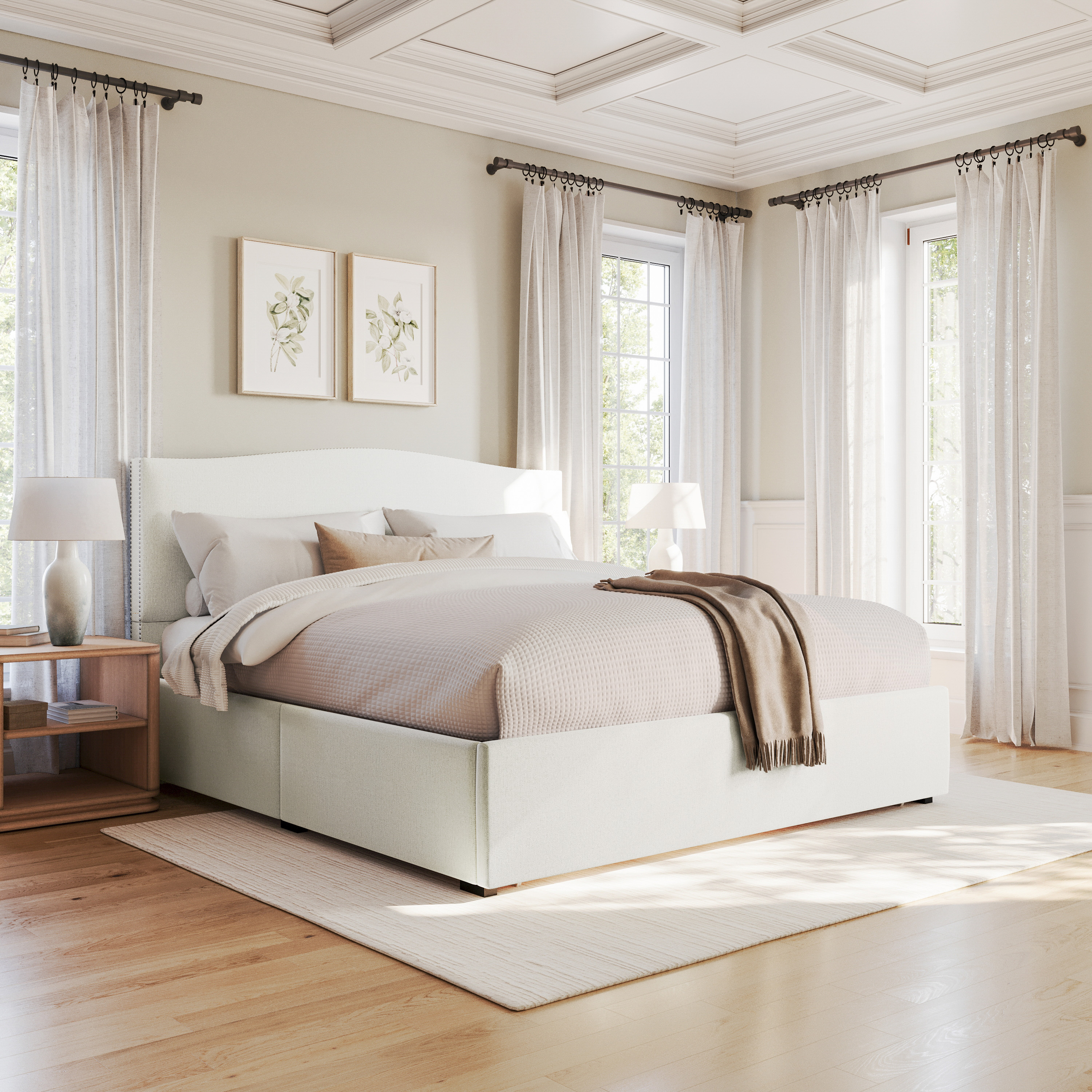 UPC Code 889142927686 Product Series Nyla Product Family Nyla Planned to Discontinue No Warranty 2 Years Limited Rated For Commercial Use No Cleaning Code Vacuum or light brushing to remove dirt Assembly Required Yes Assembly Level Medium Assembly Time Frame 30-60 Minutes Item Weight 180.5 Weight Capacity 800 Colors White Key Feature Bullet 1 Curved headboard with nail head trim creates an elegant focal point that blends traditional detail with modern lines Key Feature Bullet 2 Upholstered in soft off-white fabric with a rich texture that adds warmth and sophistication to any bedroom Key Feature Bullet 3 Built with a solid wood frame and legs plus a supportive slat system that offers durability and eliminates the need for a box spring Key Feature Bullet 4 Designed for easy assembly with included tools and features a static weight capacity of 800 lbs. for reliable support Key Feature Bullet 5 Overall dimensions 80.75"W x 86.75"D x 51"H with interior drawer dimensions of 74.75"W x 22"D x 8.5"H and overall drawer dimensions of 80.75"W x 25"D x 16"H Bullet 1 Upholstered King Platform Bed With Curved Headboard Design Bullet 2 Off-White Faux Linen Upholstery Bullet 3 Cushioned Side Rails and Footboard Bullet 4 Features Spacious Storage Drawer Built Into Frame Bullet 5 Strong wood slat system provides support with no box spring required Bullet 6 Solid Wood Frame Holds up to 800 LBS. Static Weight Bullet 7 Block Style Solid Wood Legs Bullet 8 Assembles in Under One Hour Bullet 9 Vacuum or Lightly Brush to Remove Soil Product Copy Bring classic refinement and hidden functionality into your bedroom with the Martha Stewart Nyla Upholstered Platform Storage Bed, a signature piece blending elegant craftsmanship with practical design. Thoughtfully tailored in a soft off-white fabric, this king bed instantly elevates your space with its gracefully curved headboard, detailed with nail head trim that adds a refined decorative edge. Perfectly suited for modern living, this bed features a large built-in storage drawer at the foot to neatly stow extra linens, pillows, or seasonal items. The solid wood frame and legs offer exceptional durability, while the wood slat system eliminates the need for a box spring. With a generous static weight capacity of 800 lbs., the bed combines long-lasting strength with everyday elegance. Easy to assemble with included tools, it's a timeless bedroom centerpiece designed with Martha Stewart’s signature blend of comfort, beauty, and thoughtful utility.