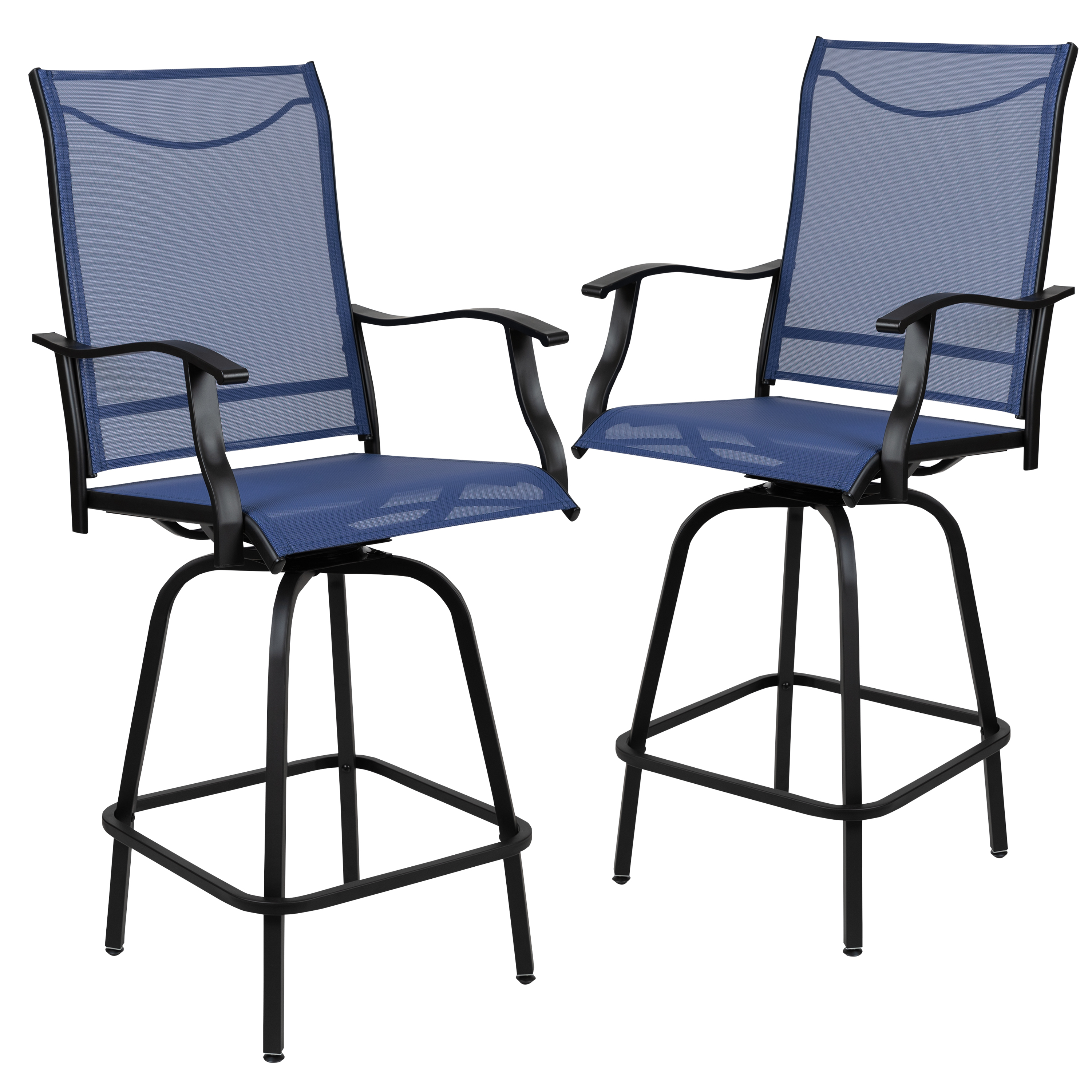 Brand Name FLASH UPC Code 889142609285 Product Family Valerie Bundle Size 2 Planned to Discontinue No Warranty 1 Year Limited Rated For Commercial Use No Cleaning Code Water and neutral detergent Assembly Required Yes Assembly Level Medium Assembly Time Frame 10-30 Minutes Item Weight 56.0 Weight Capacity 300 Seating Capacity 2 Colors Navy Overall Dimensions 26.5"D x 22.5"W x 51.5"H Extended Dimensions EFFICIENT SIZE: Measures 22.5"W x 26.5"D x 51.5"H with a 19.5"W x 19.5"D x 30"H seat size and 19.5"W x 24"H back size Bullet_1 Set of 2 Outdoor Stools - 360 Degree Swivel Bar Stools Bullet_2 Curved Scroll Arms provide support to upper body Bullet_3 Extra Wide Back covered in ventilated textilene sling fabric allowing air to pass Bullet_4 Waterfall Seat reduces pressure on your legs Bullet_5 Footrest provides a better sitting experience Bullet_6 Rustproof Galvanized Steel Frame Bullet_7 Pair with our Metal Indoor-Outdoor Bar Height Table Bullet_8 Bar height chairs provide versatile outdoor dining exchanges - balcony, backyard, garden, and more Product Copy Are you tired of eating dinner at the kitchen and dining room table? Get some fresh air and have the family meet you outside to enjoy your meals on these swivel patio stools. The seats are wrapped in a lightweight textilene material with its waterfall edge offering unparalleled comfort.