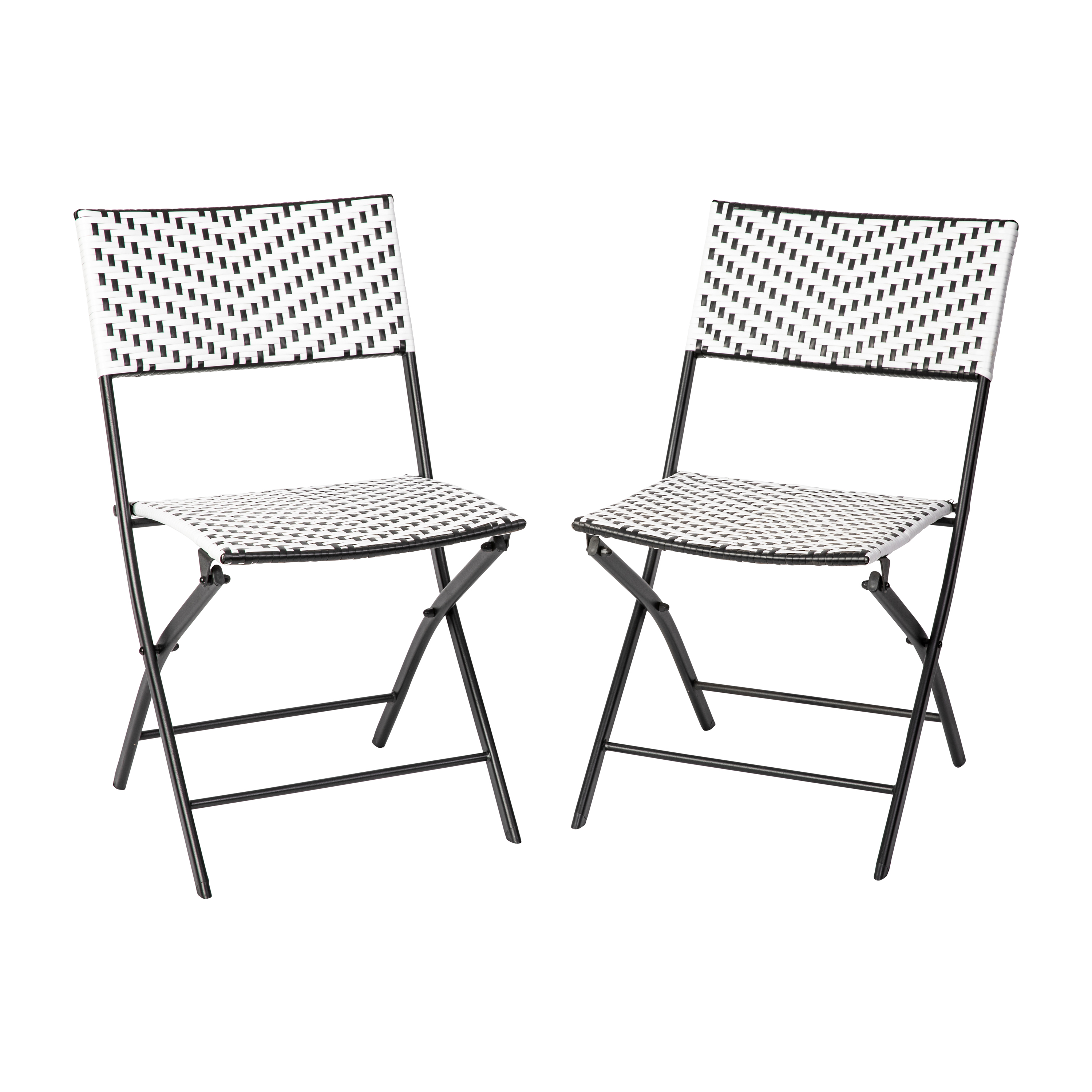 Rouen Set of 2 Commercial Grade Foldable Bistro Chairs, Indoor/Outdoor PE Rattan Back and Seat, Black/White with Black Steel Frames