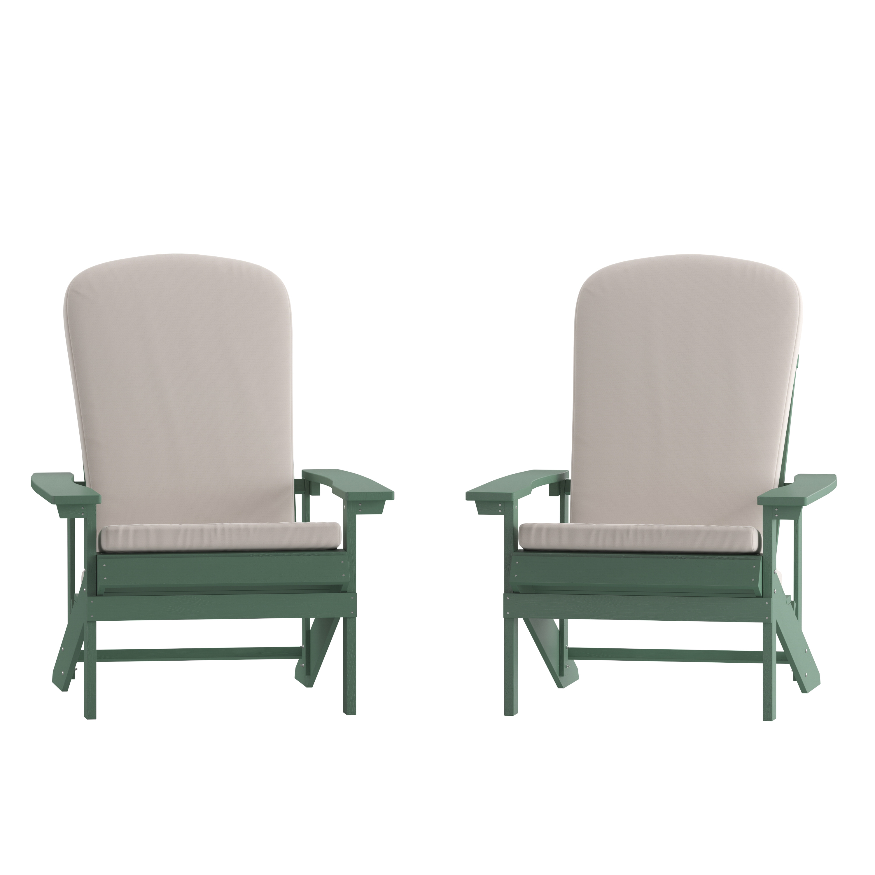 Charlestown Set of 2 All-Weather Poly Resin Wood Adirondack Chairs in Green with Cream Cushions for Deck, Porch, and Patio