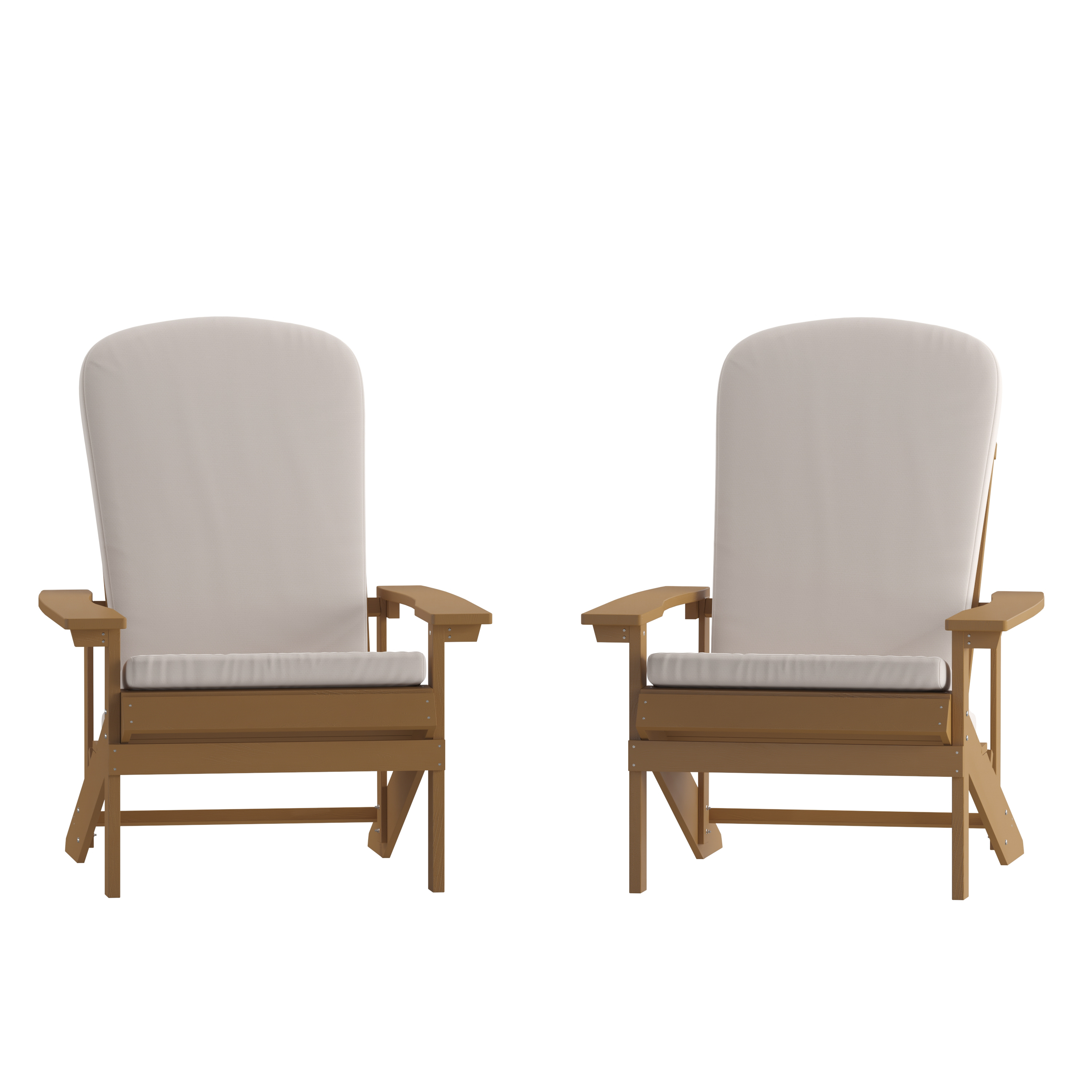 Charlestown Set of 2 All-Weather Poly Resin Wood Adirondack Chairs in Teak with Cream Cushions for Deck, Porch, and Patio