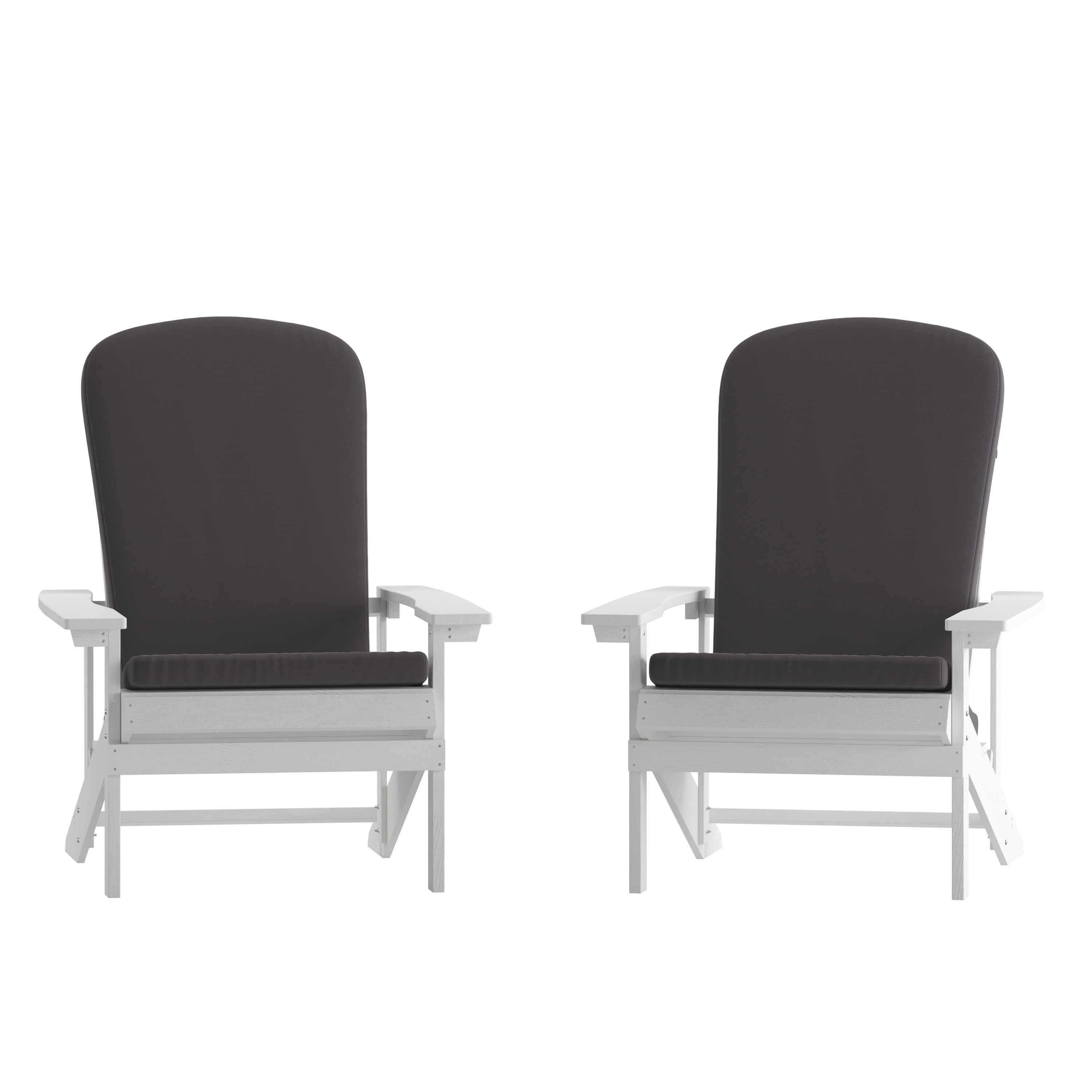 Brand Name FLASH UPC Code 196861045189 Product Family Collis Bundle Size 2 Planned to Discontinue Yes Warranty 1 Year Limited Rated For Commercial Use Yes Cleaning Code Water and neutral detergent Assembly Required Yes Assembly Level Easy Assembly Time Frame 10-30 Minutes Item Weight 64.2 Weight Capacity 350 Seating Capacity 2 Colors Gray, White Overall Dimensions 33.5"D x 29.5"W x 35"H Extended Dimensions PRODUCT MEASUREMENTS: Chair Size (2): 29.5"W x 33.5"D x 35"H; Seat Size: 19.75"W x 18.5"D x 14.5"H; Back Size: 17"W x 29"H; Arm Size: 20.5"H from floor; 6.25-10.75"H from seat | Cushion Size (2): 19.25"W x 47.25"D x 2"H Bullet_1 Set of 2 Classic Poly Resin Adirondack Chairs with Cushions Bullet_2 White Frames with Gray Padded Cushions Bullet_3 Extra Wide Back and Arms Bullet_4 Ultra-Strong Polystyrene Frames Hold up to 350 LBS. Static Weight Bullet_5 Will Not Rot, Peel, or Chip and Does Not Require Sanding or Painting Bullet_6 All-Weather Fabric Cushions with Zippered Removable Covers Bullet_7 2 Inch Thick Back and Seat Padding Bullet_8 Rear Elastic Straps Hold Cushions In Place Bullet_9 Chairs Assemble Quickly and Easily and May Be Cleaned with Water and a Neutral Detergent Bullet_10 Wipe Cushion Covers Clean with a Damp Cloth or Remove to Hand Wash and Air Dry Product Copy If you're looking for attractive seating that will allow you to relax and unwind then search no more. The classic design of this set of 2 adirondack chairs, boasting an extra wide back and arms, has stood the test of time and will make a lovely addition to any space. Featuring generously padded back and seat cushions, this seating set will quickly become your "go to" spot indoors or outside. This set of colorful lawn chairs mimics the look of real wood but won't rot, chip, or peel and is UV protected to help retain its great looks. Constructed of weather-resistant polystyrene, these chairs are designed to hold up in many environments and are strong enough to accommodate users up to 350 pounds. Best of all, these adirondack loungers can be easily cleaned with water and a neutral detergent while the cushions can be wiped clean with a damp cloth or remove the zippered covers to hand wash and air dry for a deeper clean. An elastic strap on the cushion back ensures they stay in place. This 2 pack of all-weather adirondack chairs with cushions beckons you to curl up, de-stress and let go of the day.