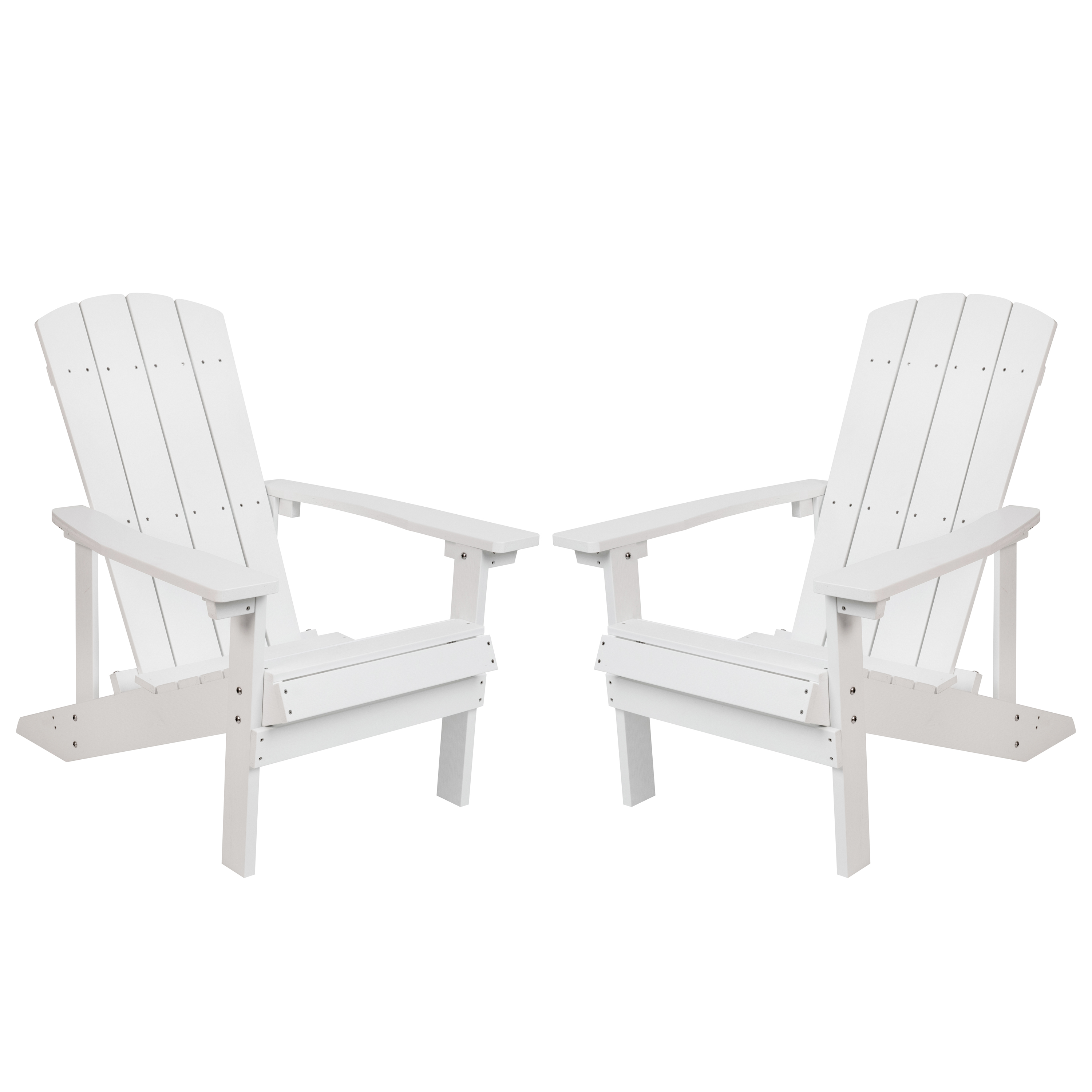 Brand Name FLASH UPC Code 840196321479 Product Family Collis Bundle Size 2 Planned to Discontinue No Warranty 1 Year Limited Rated For Commercial Use Yes Cleaning Code Water and neutral detergent Assembly Required Yes Assembly Level Easy Assembly Time Frame 1 Hour or More Item Weight 60.0 Weight Capacity 350 Seating Capacity 2 Colors White Overall Dimensions 33.5"D x 29.5"W x 35"H Extended Dimensions PRODUCT MEASUREMENTS: Overall Size: 29.5"W x 33.5"D x 35"H; Seat Size: 19.75"W x 18.5"D x 14.5"H; Back Size: 17"W x 29"H; Arm Size: 20.5"H from floor; 6.25-10.75"H from seat Bullet_1 Set of 2 Contemporary Adirondack Loungers for year round use Bullet_2 Vertical Lattice Back and Slanted Seat encourage relaxation Bullet_3 Extra Wide and Long Arms relieve pressure from the neck and shoulders Bullet_4 Arm Size: 3.5-5"W x 25.5"L Bullet_5 Weather-Resistant Polystyrene Frame won't splinter, peel or chip Bullet_6 UV Treated to prevent fading and discoloration Bullet_7 Stainless Steel Hardware is rust resistant Bullet_8 Colorful adirondack style patio chairs great for all environments from the backyard to the beach Product Copy If you're looking for attractive seating that will allow you to relax and unwind then search no more. The classic design of this set of 2 white adirondack chairs has stood the test of time and will make a lovely addition to any space.