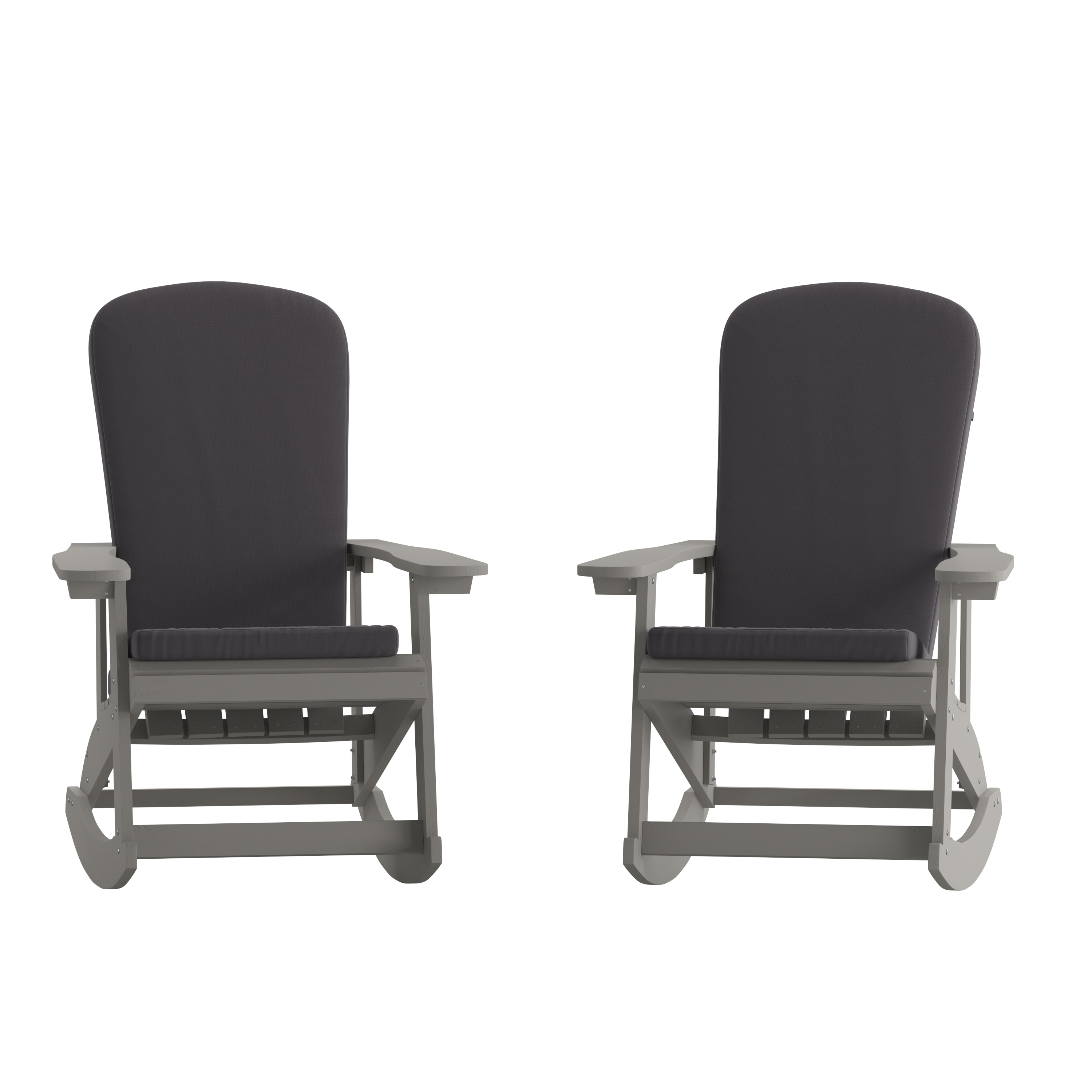 Savannah Set of 2 All-Weather Poly Resin Wood Adirondack Rocking Chairs in Gray with Gray Cushions for Deck, Porch, and Patio