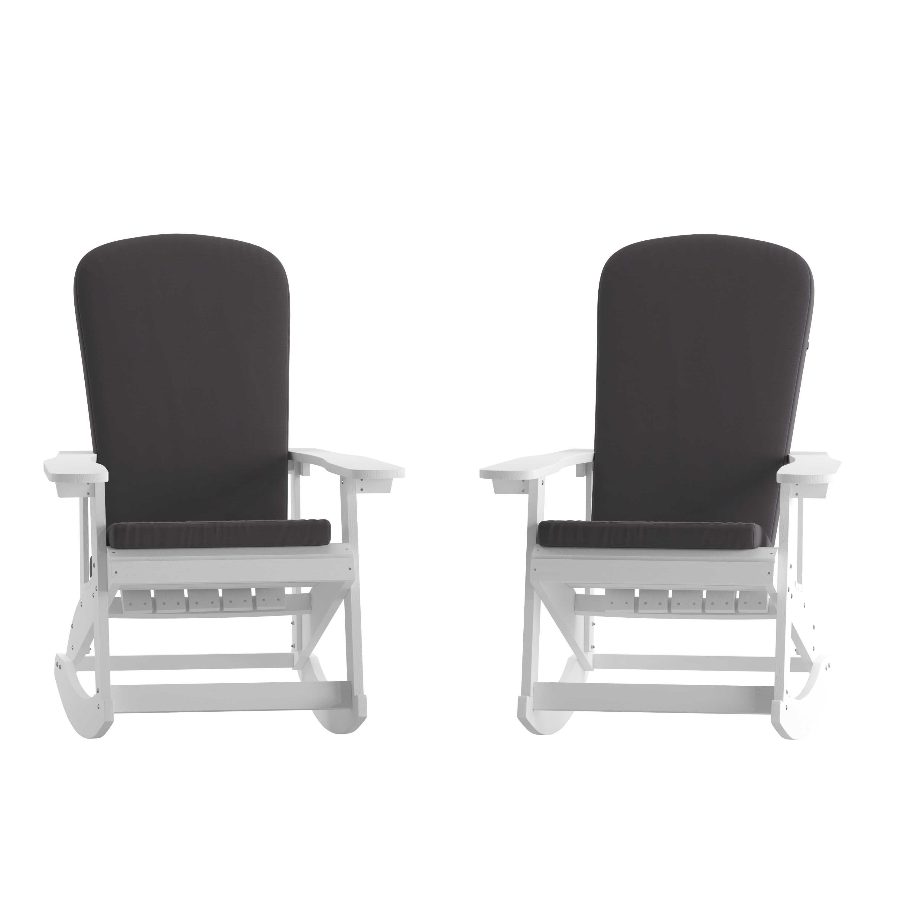 Savannah Set of 2 All-Weather Poly Resin Wood Adirondack Rocking Chairs in White with Gray Cushions for Deck, Porch, and Patio