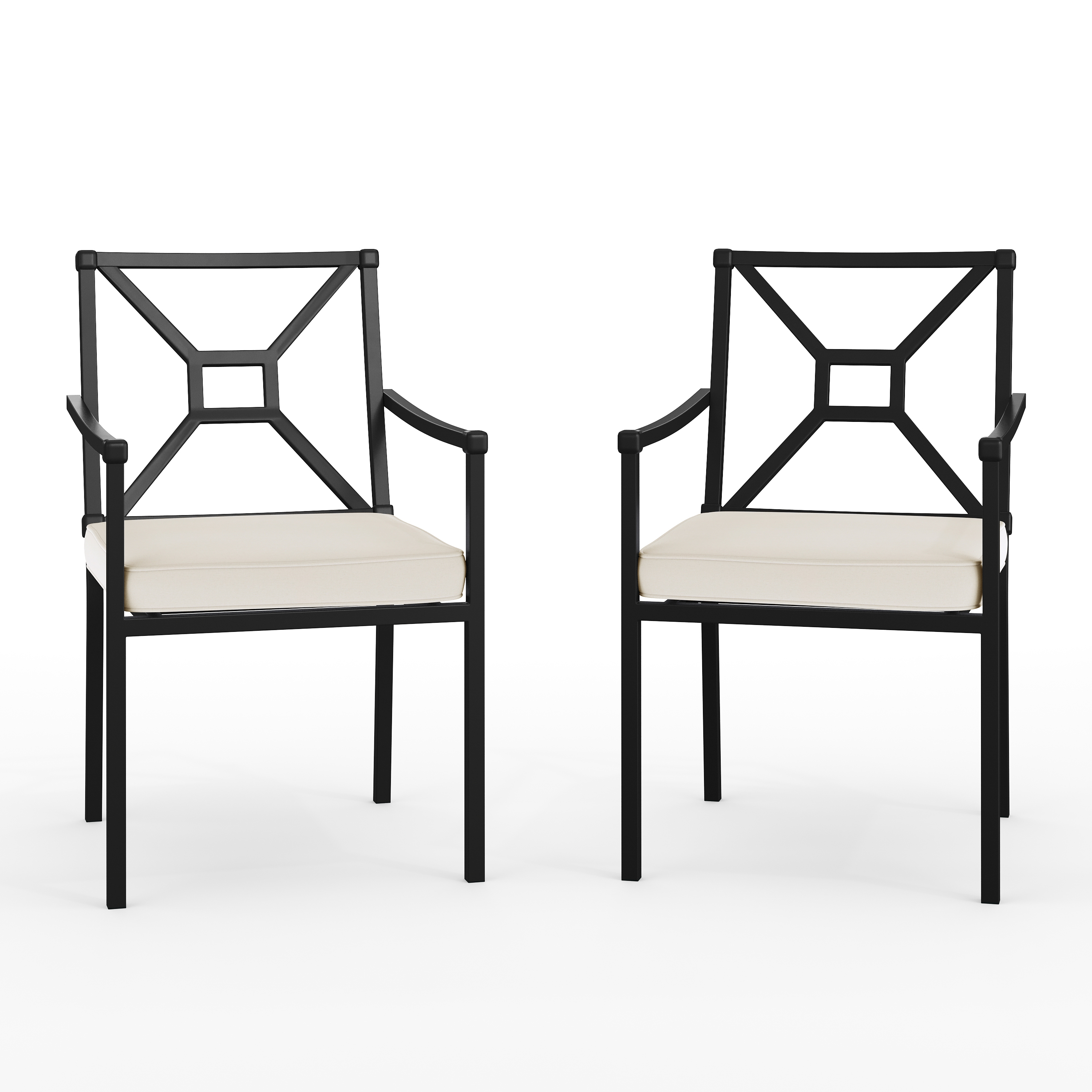 Lily Pond Set of 2 Indoor-Outdoor Stackable Patio Dining Armchairs with Steel Frames in Black with Cream All-Weather Cushions