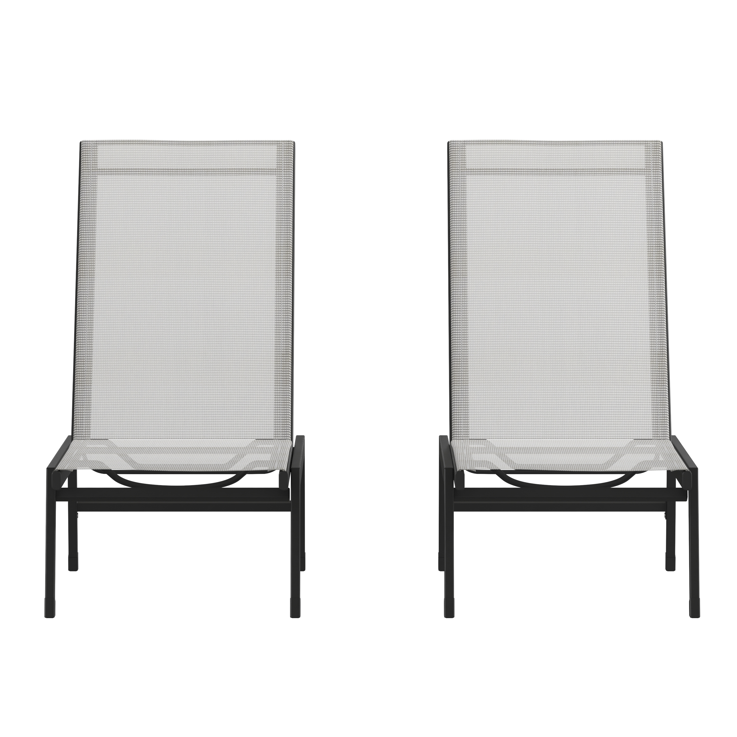 Brand Name FLASH UPC Code 196861094323 Product Family Brazos Bundle Size 2 Planned to Discontinue No Warranty 1 Year Limited Rated For Commercial Use No Cleaning Code Damp cloth Assembly Required Yes Assembly Level Medium Assembly Time Frame 10-30 Minutes Item Weight 42 Weight Capacity 300 Seating Capacity 2 Colors Gray Overall Dimensions 76"D x 23.25"W x 19.75" - 38"H Extended Dimensions PRODUCT MEASUREMENTS: Overall Size: 23.25"W x 76"D x 19.75-38"H; Seat Size: 18"W x 45.75"D x 13.25"H; Back Size: 19"W x 11.25-24.75"H; Arm Size: 19.75"H from floor; 6.5"H from seat Bullet_1 Modern Outdoor Chaise Lounge Chair , Set of 2 Bullet_2 Gray Textilene Fabric Back and Seat Bullet_3 5 Recline Positions from 120° to 180° Bullet_4 UV Fade and Weather Resistant Materials Bullet_5 Black Powder Coated Rust Resistant Steel Frames Bullet_6 Supports up to 350 LBS. Static Weight Per Chair Bullet_7 Assembles in 30 Minutes or Less Per Chair Bullet_8 Wipe Clean with a Damp Cloth Product Copy Nice weather is right around the corner and you will be more than ready when you have this set of two 5 position adjustable loungers. With recline angles from 120° to 180° you can sit up to read that bestseller you've been meaning to get to, lay flat to take a little nap or enjoy the recline positions in between. Breathable textilene fabric allows for airflow to keep you cool and is quick drying making it ideal for poolside use.