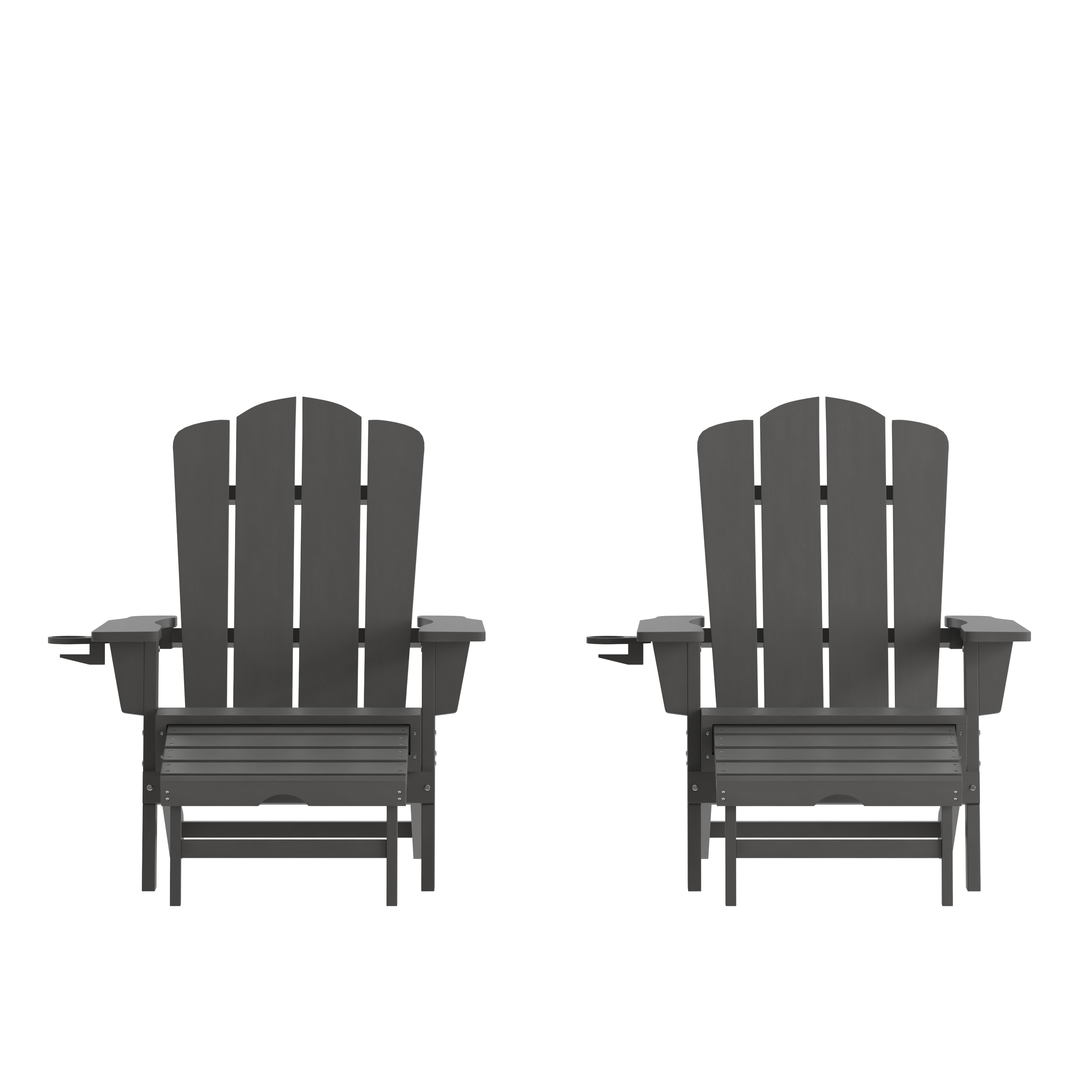 Brand Name FLASH UPC Code 196861019029 Product Family Collis Bundle Size 2 Planned to Discontinue No Warranty 1 Year Limited Rated For Commercial Use Yes Cleaning Code Damp cloth Assembly Required Yes Assembly Level Medium Assembly Time Frame 10-30 Minutes Item Weight 81 Weight Capacity 300 Seating Capacity 2 Colors Gray Overall Dimensions 33.25" - 47.25"D x 33.75"W x 35.75"H Extended Dimensions PRODUCT MEASUREMENTS: Overall Size (2): 33.75"W x 47.25"D x 35.75"H; Seat Size: 20"W x 20"D x 14.25"H; Back Size: 18.5"W x 27.25"H; Arm Size: 22.5"H from floor; 13.5"H from seat Bullet_1 Set of 2 Commercial Adirondack Chairs with Pull-Out Ottoman and Cupholders Bullet_2 Gray Finish Bullet_3 Space Saving Pull-Out Ottoman Bullet_4 Slide-Out Cupholder Bullet_5 UV Fade and Weather Resistant Materials Bullet_6 Holds up to 300 LBS. Static Weight Capacity Per Chair Bullet_7 Assembles in 30 Minutes or Less Per Chair Bullet_8 Wipe Clean with a Damp Cloth Bullet_9 Perfect for Indoor and Outdoor Use Product Copy Give your commercial or residential outdoor spaces an instant upgrade and lots of cozy comfort with this set of 2 all-weather Adirondack style chairs with pullout ottomans. Beautifully crafted to fit in any décor, these outdoor patio chairs are ideal for your outdoor lounge areas as well as poolside and can pull double duty as indoor seating. The supportive vertical back paired with the slanted seat with a waterfall front allows your whole body to relax. Extra wide arms relieve tension from the neck and shoulders and boast a slide out cupholder on the right side to free up your hands.
