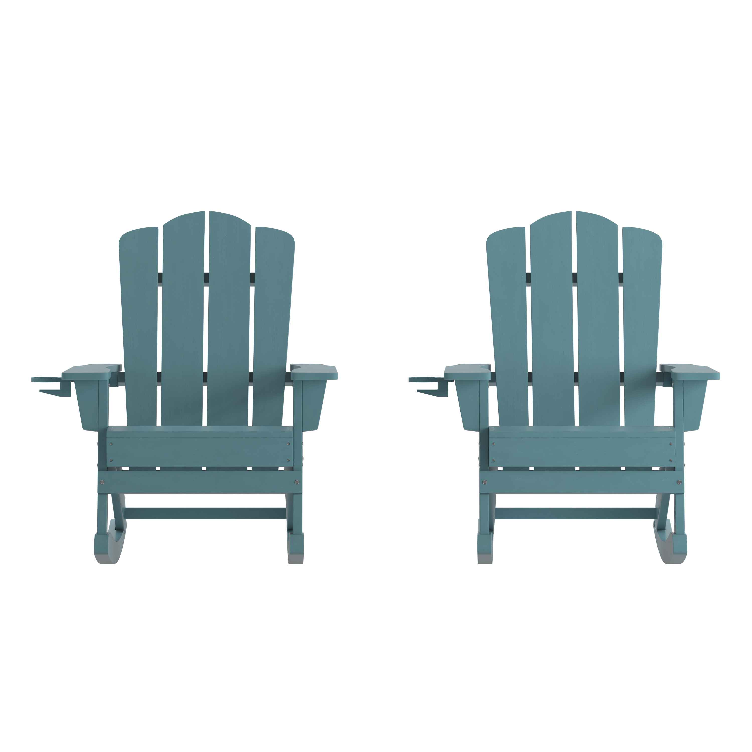 Newport Adirondack Rocking Chair with Cup Holder, Weather Resistant HDPE Adirondack Rocking Chair in Blue, Set of 2