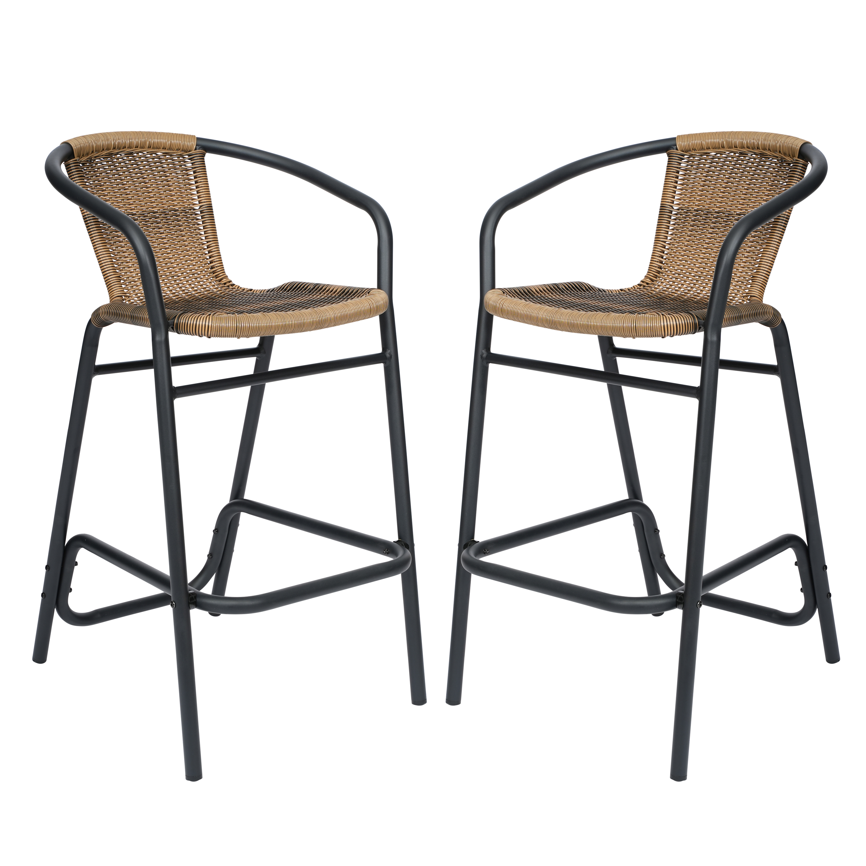 Brand Name FLASH UPC Code 889142948513 Product Family Lila Bundle Size 2 Planned to Discontinue No Warranty 1 Year Limited Rated For Commercial Use Yes Cleaning Code Water based cleaner Assembly Required Yes Assembly Level Easy Assembly Time Frame 1-10 Minutes Item Weight 30.0 Weight Capacity 400 Seating Capacity 2 Colors Brown Overall Dimensions 22"D x 22"W x 39.25"H Extended Dimensions PRODUCT MEASUREMENTS (2): 22"W x 22"D x 39.25"H; Seat Size: 17"W x 14.5"D x 29"H; Back Size: 12"W x 12.5"H; Arm Size: 38.5"H from floor; 10.5"H from seat Bullet_1 Set of 2 Commercial Grade Indoor/Outdoor Restaurant Barstools Bullet_2 Medium Brown Rattan Backs and Seats Bullet_3 Powder Coated Aluminum Frames are Lightweight and Durable Bullet_4 Hold up to 400 LBS. Static Weight Capacity Bullet_5 Footrest Assembles Quickly for Added Comfort Bullet_6 Backrest and Seat Arrive Pre-Assembled Bullet_7 Clean with Water-Based Cleaner Bullet_8 Clean with Water-Based Cleaner Product Copy Deliver a casual, comfortable environment to your restaurant, bistro, hotel, or backyard patio with this set of two indoor/outdoor commercial grade restaurant barstools. The durable PE rattan backs and seats are incredibly comfortable for any occasion. Available in three hues, these barstools are the perfect additions to your indoor and outdoor spaces, no matter the style. The lightweight, but durable, powder coated aluminum frames hold up to 400 lbs. static weight for strong, sturdy seating options. A foot rest gives your guests another way to stay comfortable and content. For your convenience, the seats and backrests arrive completely assembled and adding the footrest is quick and easy. These barstools can be cleaned easily with a water-based cleaner.