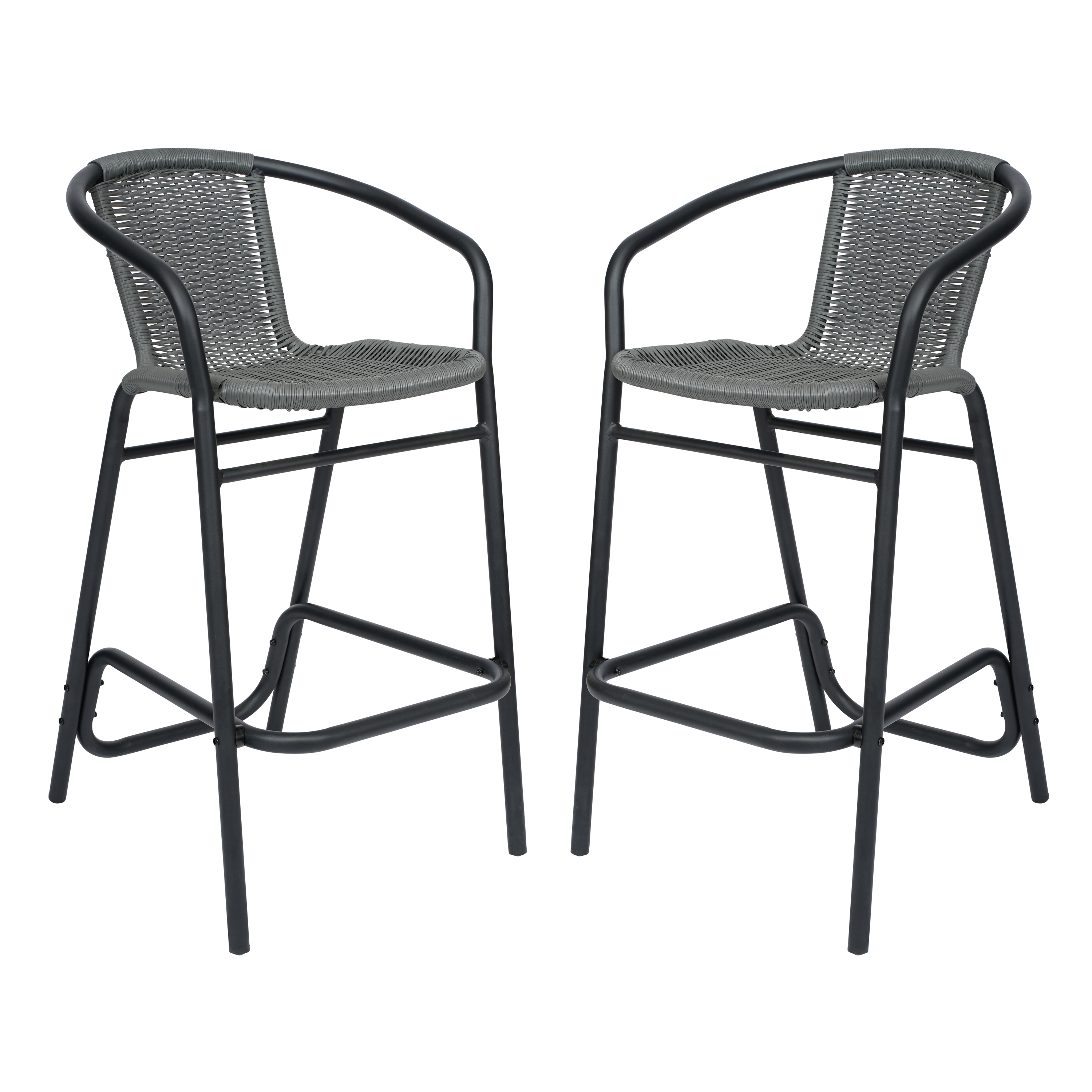 Brand Name FLASH UPC Code 889142948490 Product Family Lila Bundle Size 2 Planned to Discontinue No Warranty 1 Year Limited Rated For Commercial Use Yes Cleaning Code Water based cleaner Assembly Required Yes Assembly Level Easy Assembly Time Frame 1-10 Minutes Item Weight 30.0 Weight Capacity 400 Seating Capacity 2 Colors Gray Overall Dimensions 22"D x 22"W x 39.25"H Extended Dimensions PRODUCT MEASUREMENTS (2): 22"W x 22"D x 39.25"H; Seat Size: 17"W x 14.5"D x 29"H; Back Size: 12"W x 12.5"H; Arm Size: 38.5"H from floor; 10.5"H from seat Bullet_1 Set of 2 Commercial Grade Indoor/Outdoor Restaurant Barstools Bullet_2 Gray Rattan Backs and Seats Bullet_3 Powder Coated Aluminum Frames are Lightweight and Durable Bullet_4 Hold up to 400 LBS. Static Weight Capacity Bullet_5 Footrest Assembles Quickly for Added Comfort Bullet_6 Backrest and Seat Arrive Pre-Assembled Bullet_7 Clean with Water-Based Cleaner Bullet_8 Clean with Water-Based Cleaner Product Copy Deliver a casual, comfortable environment to your restaurant, bistro, hotel, or backyard patio with this set of two indoor/outdoor commercial grade restaurant barstools. The durable PE rattan backs and seats are incredibly comfortable for any occasion. Available in three hues, these barstools are the perfect additions to your indoor and outdoor spaces, no matter the style. The lightweight, but durable, powder coated aluminum frames hold up to 400 lbs. static weight for strong, sturdy seating options. A foot rest gives your guests another way to stay comfortable and content. For your convenience, the seats and backrests arrive completely assembled and adding the footrest is quick and easy. These barstools can be cleaned easily with a water-based cleaner.