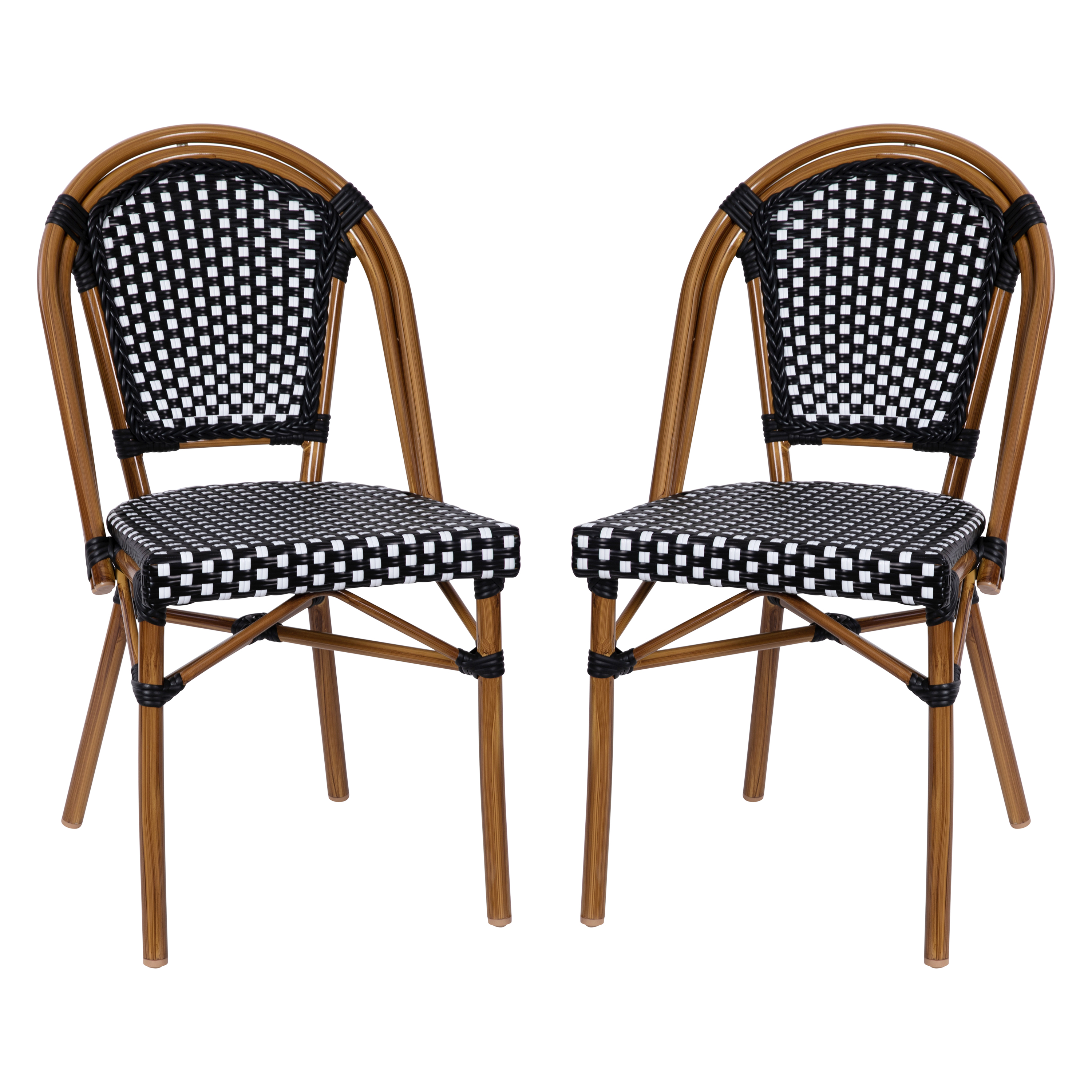 Bordeaux Set of 2 Indoor/Outdoor Commercial Bistro Stacking Chairs, Black/White PE Rattan Back and Seat, Bamboo Print Aluminum Frame in Natural