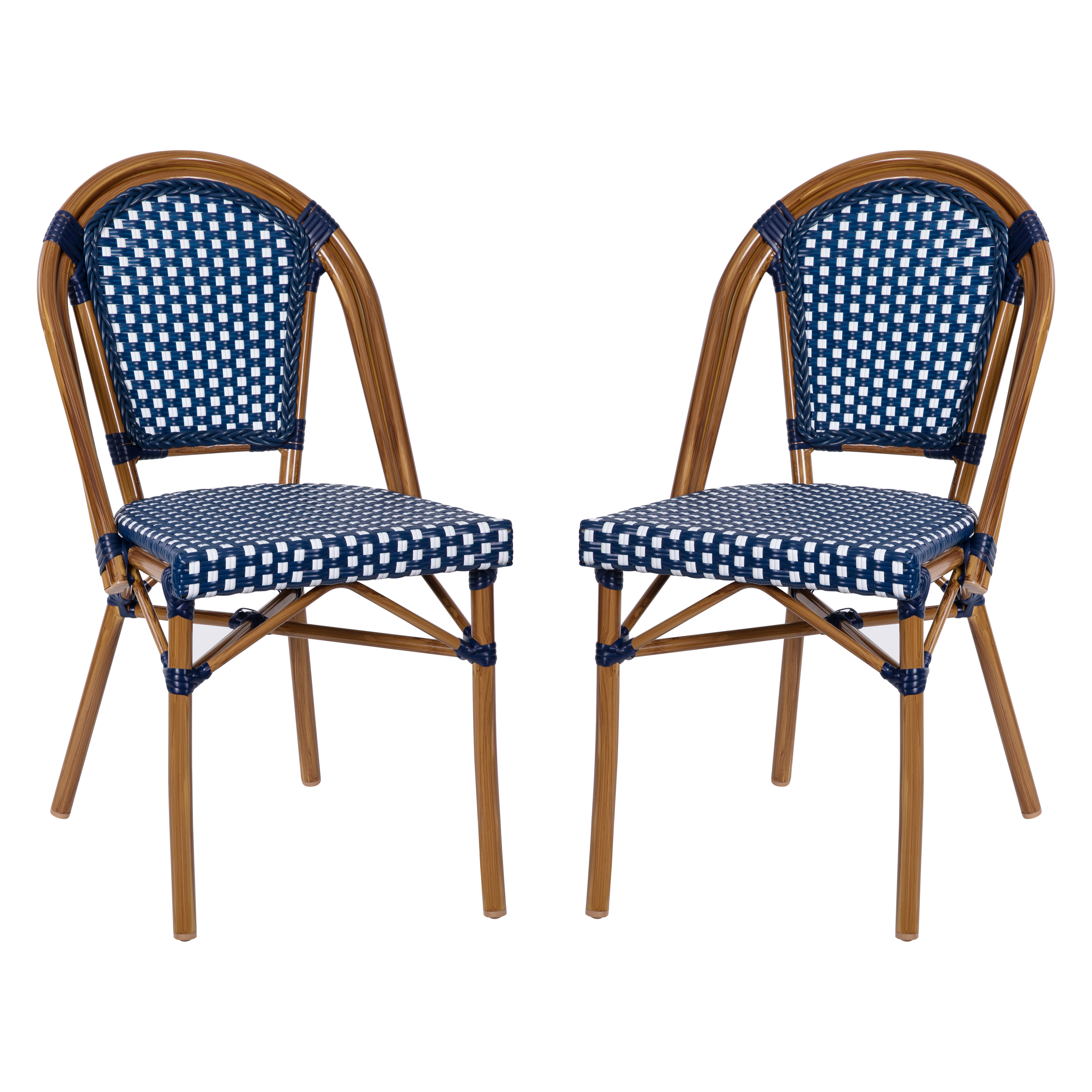Bordeaux Set of 2 Indoor/Outdoor Commercial Bistro Stacking Chairs, Navy/White PE Rattan Back and Seat, Bamboo Print Aluminum Frame in Natural
