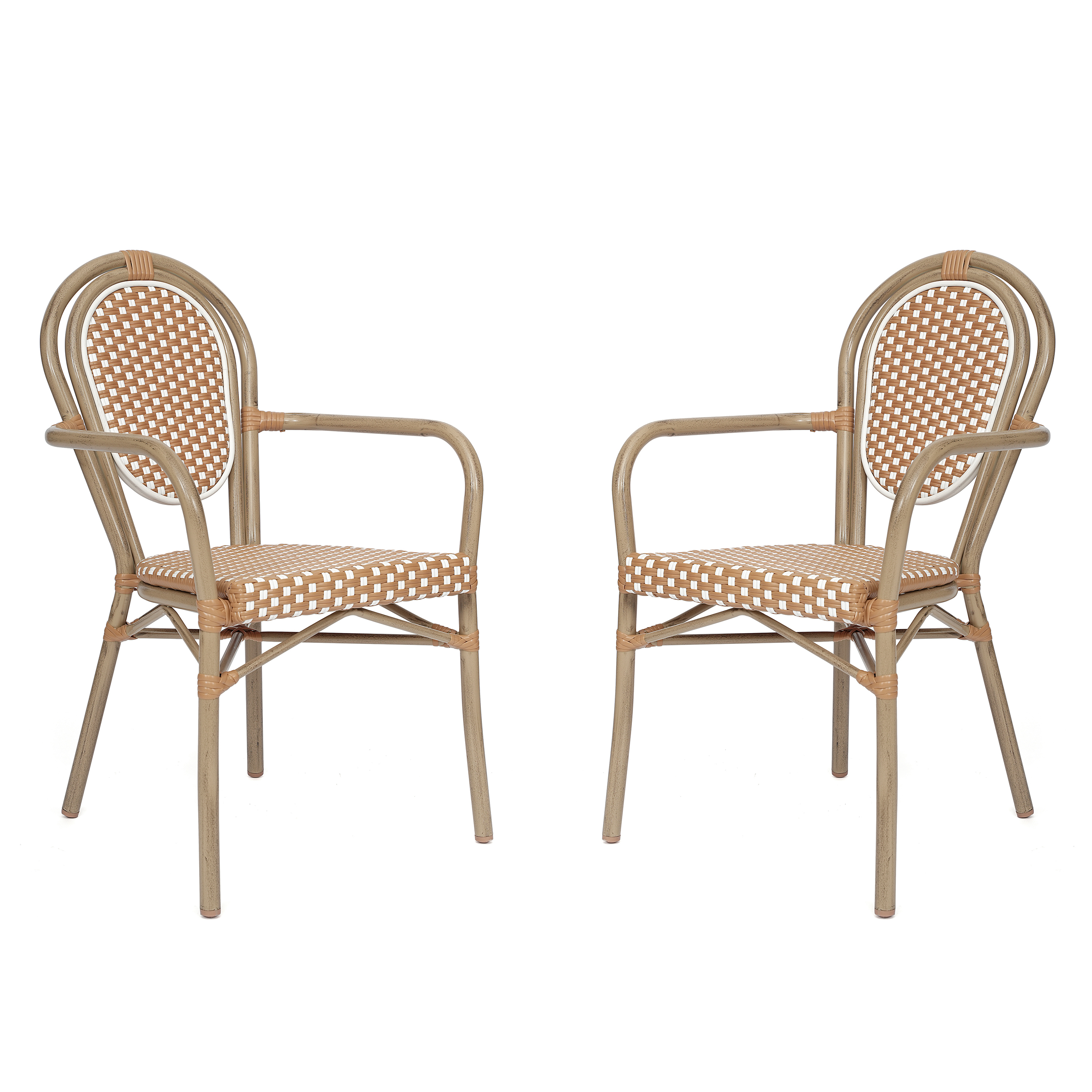2 Pack Lourdes Indoor/Outdoor Commercial Thonet Bistro Stack Chair with Arms, Natural/White PE Rattan and Bamboo Aluminum Frame in Lt Natural