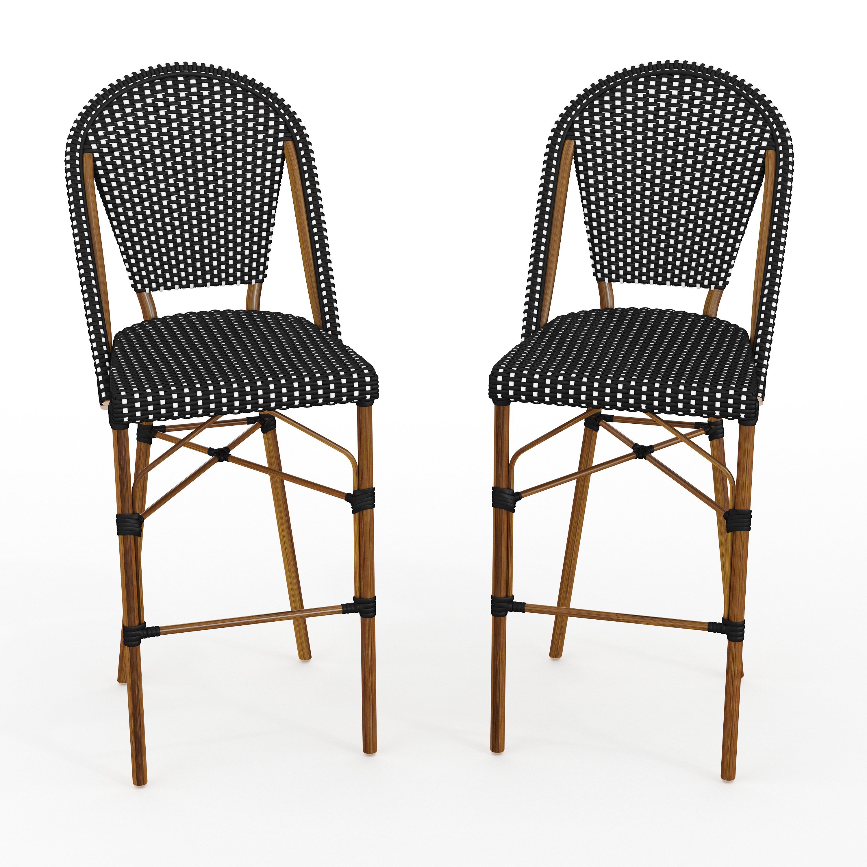 Lily Pond Set of 2 Indoor-Outdoor Stackable Bistro Bar Stools with Natural Woodgrain Aluminum Finish Frames, Black/White Woven Rattan Backs/Seats