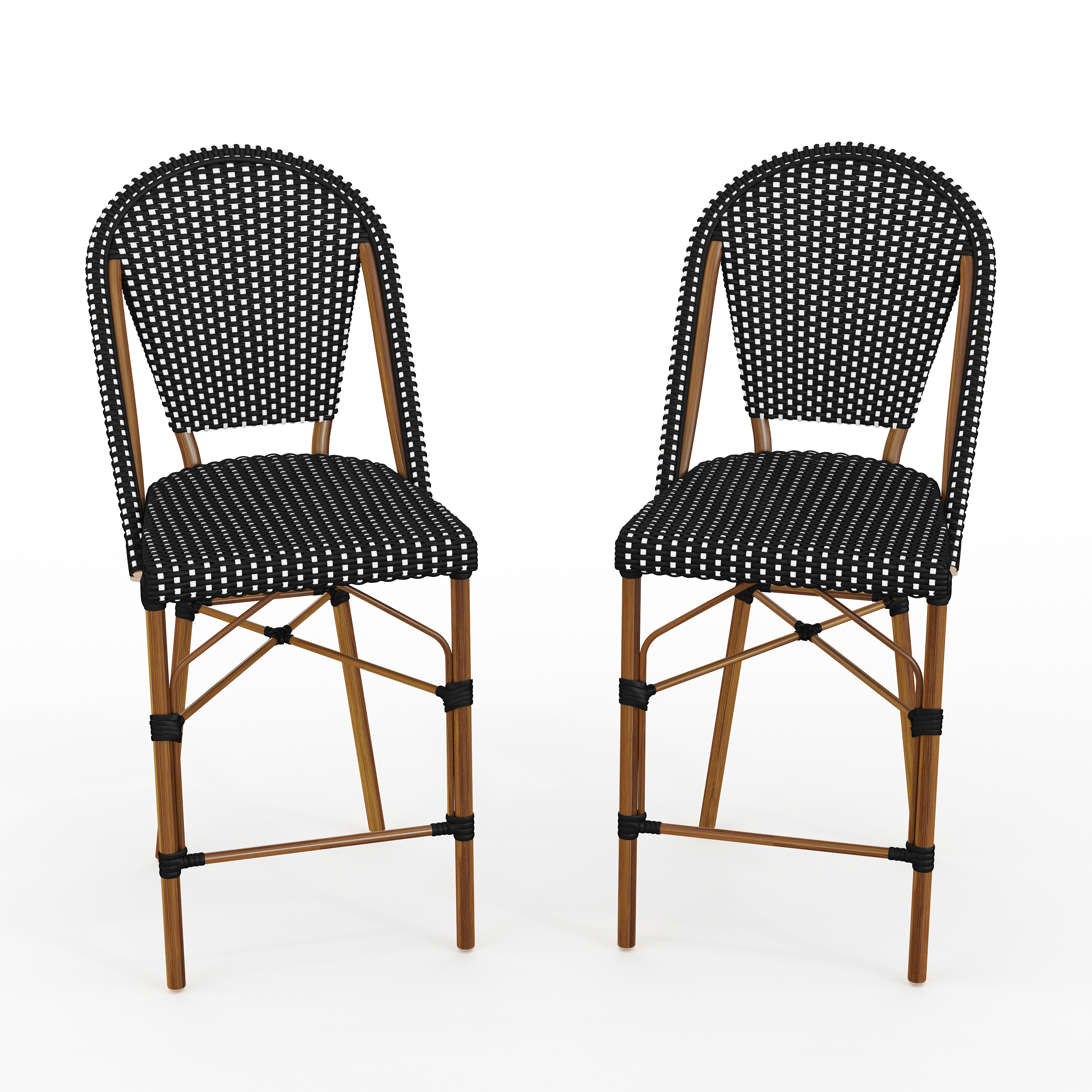 Lily Pond Set of 2 Indoor-Outdoor Stackable Bistro Counter Stools with Natural Woodgrain Aluminum Finish Frame, Black/White Woven Rattan Back/Seat
