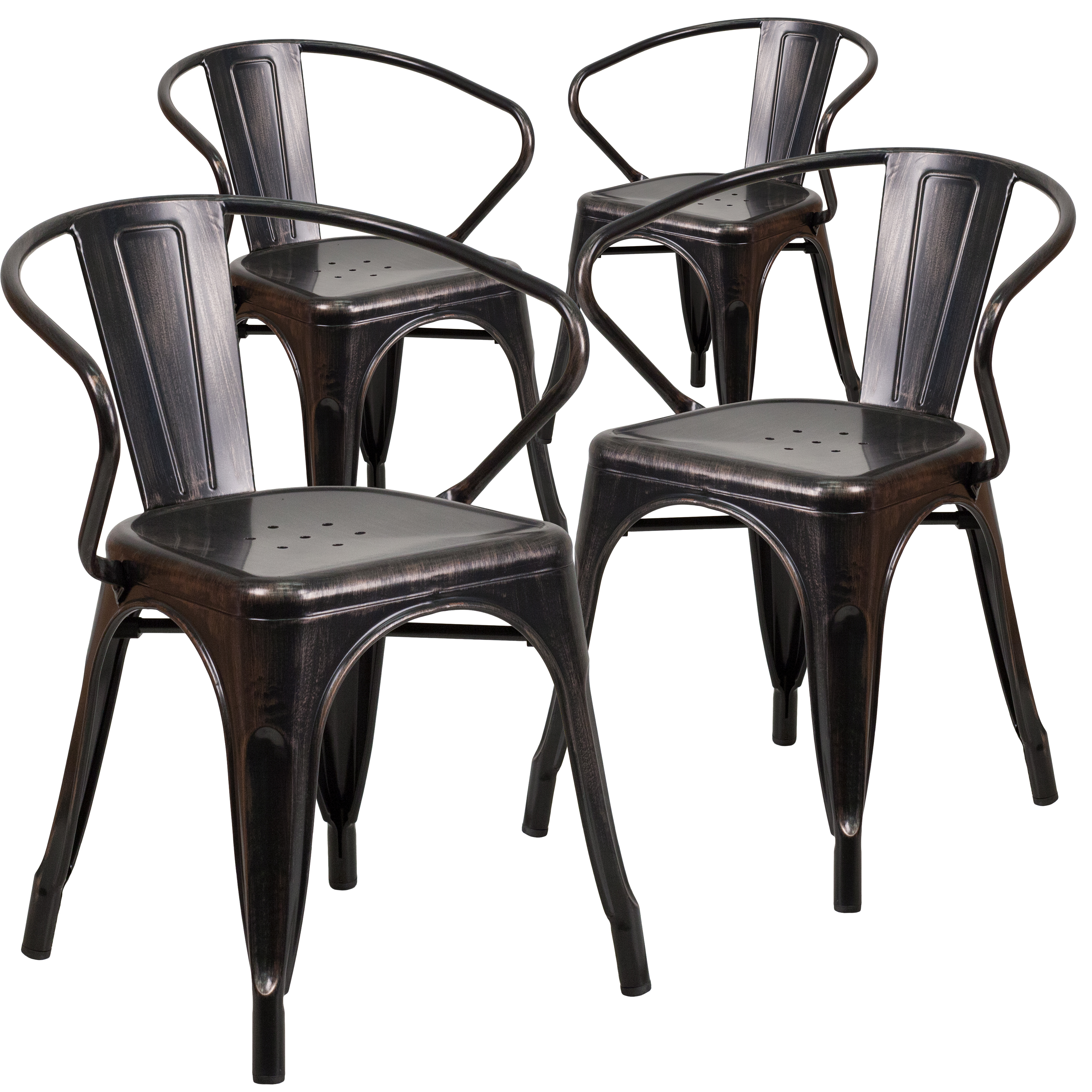 Brand Name FLASH UPC Code 889142015093 Product Family Hucheson Bundle Size 4 Planned to Discontinue No Warranty 5 Years Limited Rated For Commercial Use Yes Cleaning Code Water and neutral detergent Assembly Required No Item Weight 41.92 Weight Capacity 500 Seating Capacity 4 Stack Quantity 8 Colors Antique Gold, Black Overall Dimensions 19"D x 21.5"W x 27.75"H Extended Dimensions PRODUCT MEASUREMENTS: Overall Size: 21.5"W x 19"D x 27.75"H; Seat Size: 12-14"W x 14"D x 17.5"H; Back Size: 11"W x 11.5"H; Arm Size: 25.5"H from floor; 9"H from seat; No Assembly Required Bullet_1 Set of 4 Stackable Bistro Style Chairs Bullet_2 500 lb. Weight Capacity Bullet_3 Lightweight Design, Stack Quantity: 8 Bullet_4 Curved Back with Vertical Slat, Integrated Arms Bullet_5 Antique Black Powder Coated Frame Finish, Plastic Caps on cross brace protect finish when stacked Bullet_6 Seat Drain Holes assist in drying Bullet_7 Galvanized Steel Construction Bullet_8 Floor Protector Plastic Glides Bullet_9 Designed for Indoor or Outdoor Use Bullet_10 No Assembly Required Product Copy Spice up your kitchen or dining room by adding this colorful antique gold metal chair to your space. This metal dining chair pairs nicely with metal and non metal tables. Whether your home decor is shabby chic, traditional or industrially styled, you'll be surprised how easily this stackable metal chair will blend with your existing decor.