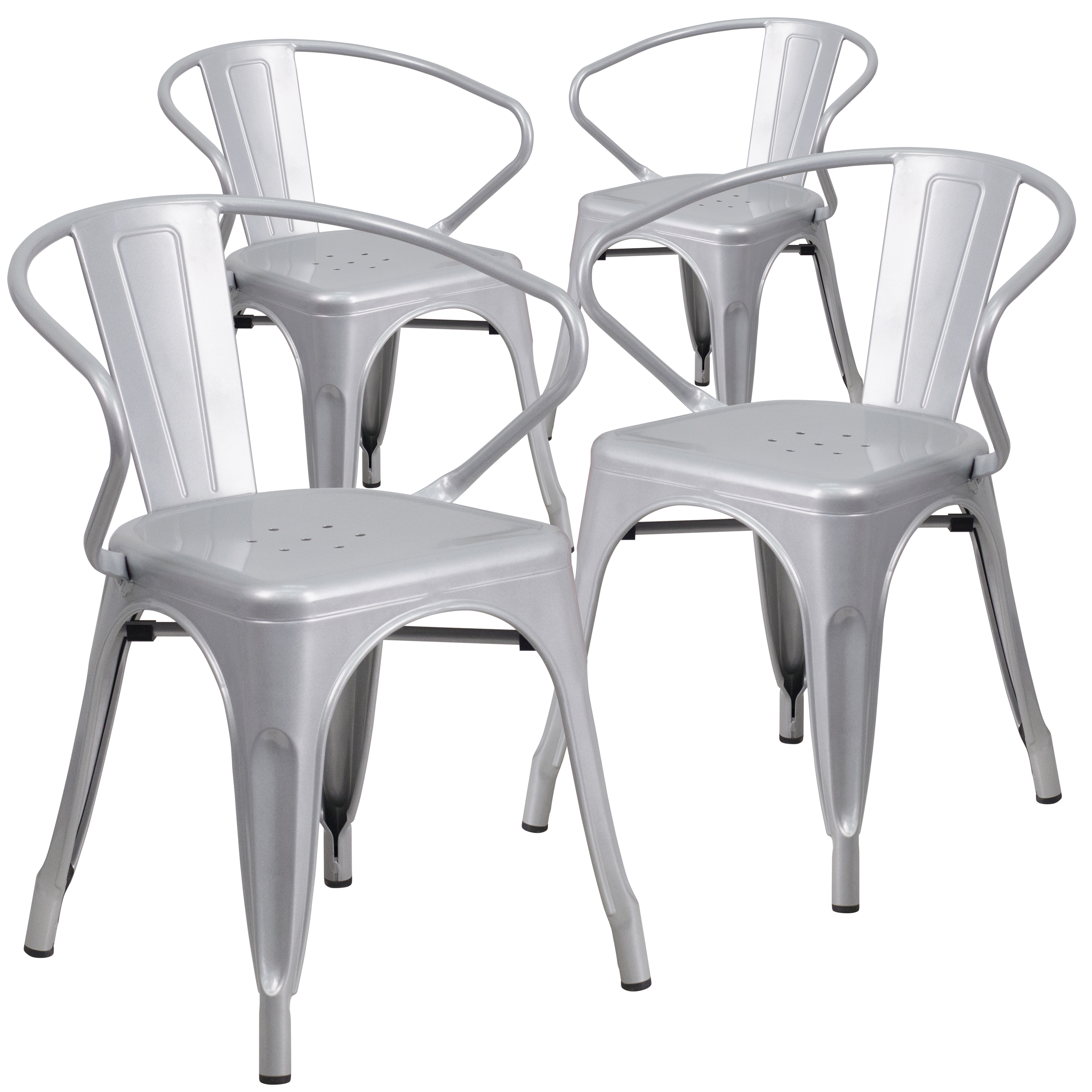 Brand Name FLASH UPC Code 889142015130 Product Family Hucheson Bundle Size 4 Planned to Discontinue No Warranty 5 Years Limited Rated For Commercial Use Yes Cleaning Code Water and neutral detergent Assembly Required No Item Weight 41.92 Weight Capacity 500 Seating Capacity 4 Stack Quantity 8 Colors Silver Overall Dimensions 19"D x 21.5"W x 27.75"H Extended Dimensions PRODUCT MEASUREMENTS: Overall Size: 21.5"W x 19"D x 27.75"H; Seat Size: 12-14"W x 14"D x 17.5"H; Back Size: 11"W x 11.5"H; Arm Size: 25.5"H from floor; 9"H from seat; No Assembly Required Bullet_1 Set of 4 Stackable Bistro Style Chairs Bullet_2 500 lb. Weight Capacity Bullet_3 Lightweight Design, Stack Quantity: 8 Bullet_4 Curved Back with Vertical Slat, Integrated Arms Bullet_5 Silver Powder Coated Frame Finish, Plastic Caps on cross brace protect finish when stacked Bullet_6 Seat Drain Holes assist in drying Bullet_7 Galvanized Steel Construction Bullet_8 Floor Protector Plastic Glides Bullet_9 Designed for Indoor or Outdoor Use Bullet_10 No Assembly Required Product Copy Spice up your kitchen or dining room by adding this colorful silver metal chair to your space. This metal dining chair pairs nicely with metal and non metal tables. Whether your home decor is shabby chic, traditional or industrially styled, you'll be surprised how easily this stackable metal chair will blend with your existing decor.