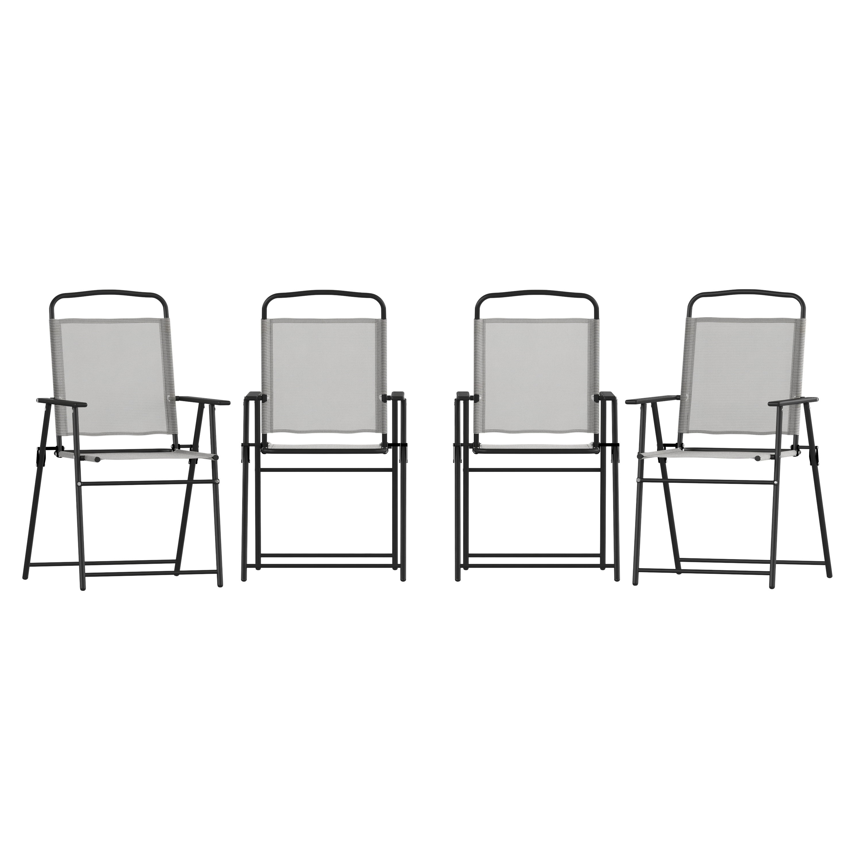 Brand Name FLASH UPC Code 196861105388 Product Family Raven Bundle Size 4 Planned to Discontinue No Warranty 1 Year Limited Rated For Commercial Use Yes Cleaning Code Damp cloth Assembly Required No Item Weight 26 Weight Capacity 350 Seating Capacity 4 Colors Gray Overall Dimensions 24.5"D x 20.75"W x 35.75"H Extended Dimensions PRODUCT MEASUREMENTS: Overall Size (4): 20.75"W x 24.5"D x 35.75"H; Seat Size: 15.75"W x 14.25"D x 17.75"H; Back Size: 17"W x 15.75"H; Arm Size: 23.25"H from floor; 7"H from seat; Folded Size: 21.5"W x 2"D x 34"H Bullet_1 Set of 4 Contemporary Sling Style Patio Chairs with Armrests Bullet_2 Breathable Textilene Backs and Seats in Gray Bullet_3 UV Fade Resistant and Quick Drying Bullet_4 Integrated Armrests Relieve Neck and Shoulder Tension Bullet_5 Black Powder Coated Weather and Rust-Resistant Frames Bullet_6 Foldable Design for Easy Transport or Storage Bullet_7 No Assembly Required Bullet_8 Wipe Clean with a Damp Cloth Product Copy Relax and enjoy your outdoor leisure time with this set of 4 patio sling chairs with armrests. Breathable textilene fabric allows for airflow to keep you cool and is quick drying making these chairs ideal for use outside.