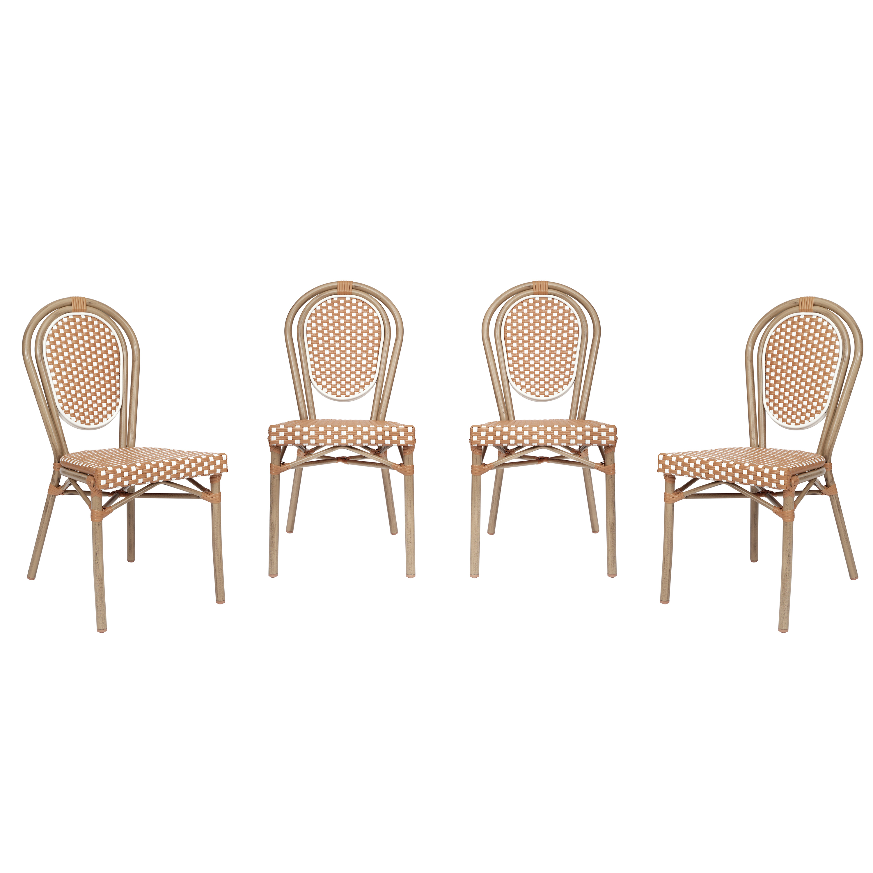 4 Pack Lourdes Indoor/Outdoor Commercial Thonet Bistro Stacking Chair, Natural/White PE Rattan and Bamboo Print Aluminum Frame in Light Natural