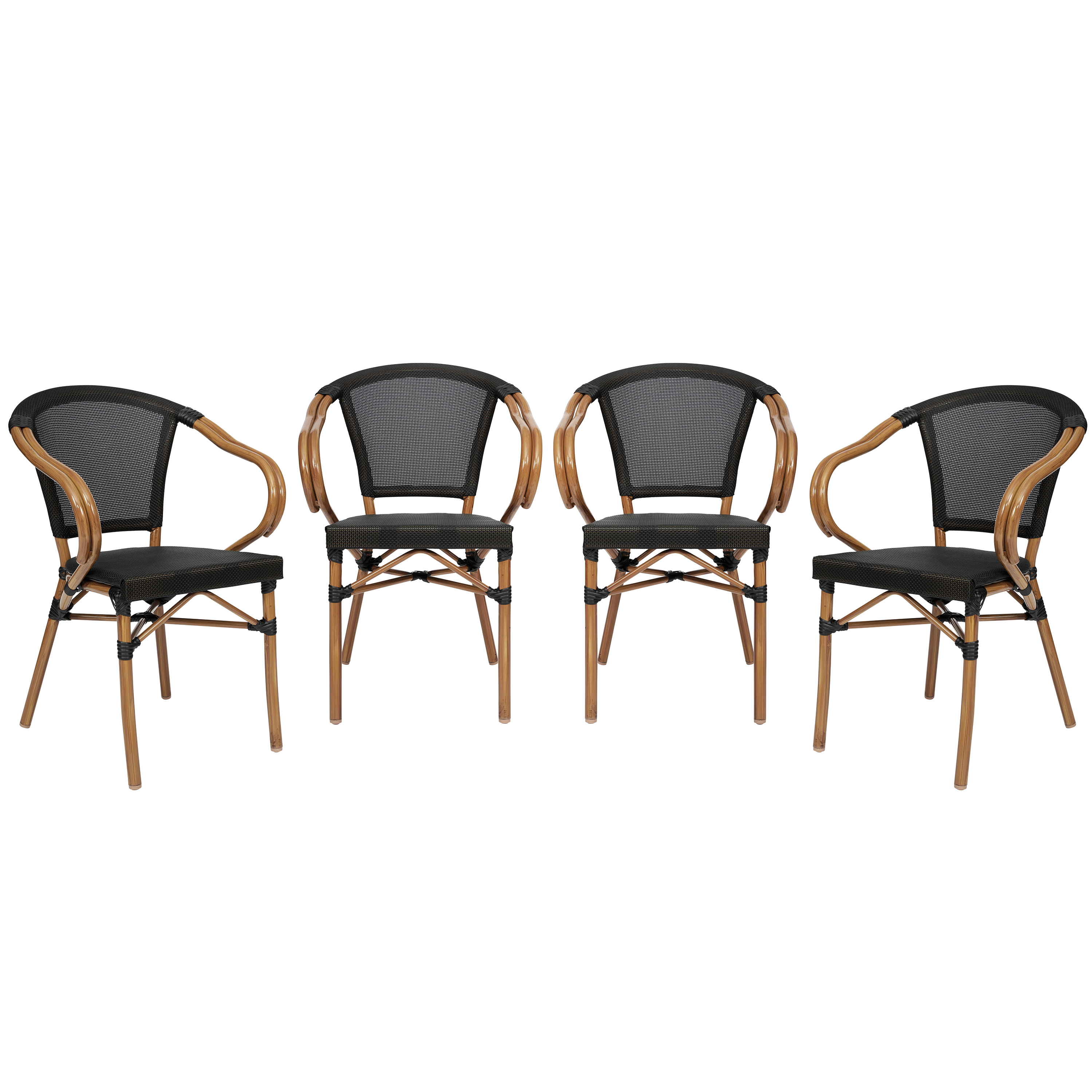 4 Pack Marseille Indoor/Outdoor Commercial Bistro Stacking Chair with Arms, Black Textilene and Bamboo Print Aluminum Frame in Natural