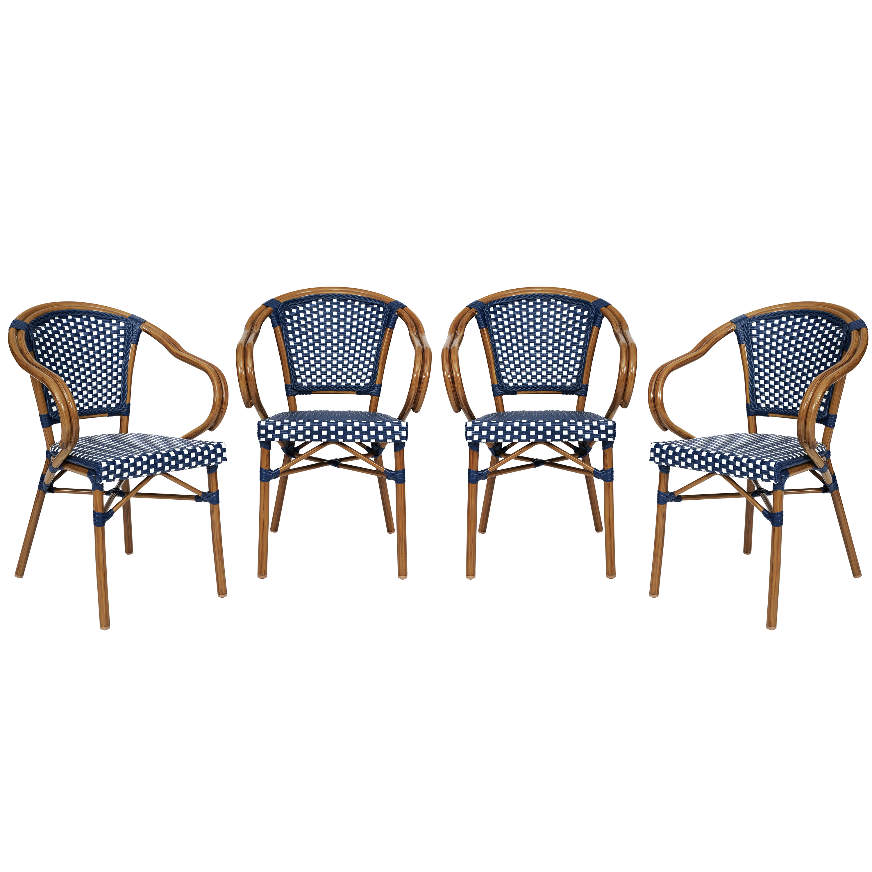 4 Pack Bordeaux Indoor/Outdoor Commercial Bistro Stacking Chair with Arms, Navy and White PE Rattan and Bamboo Print Aluminum Frame in Natural