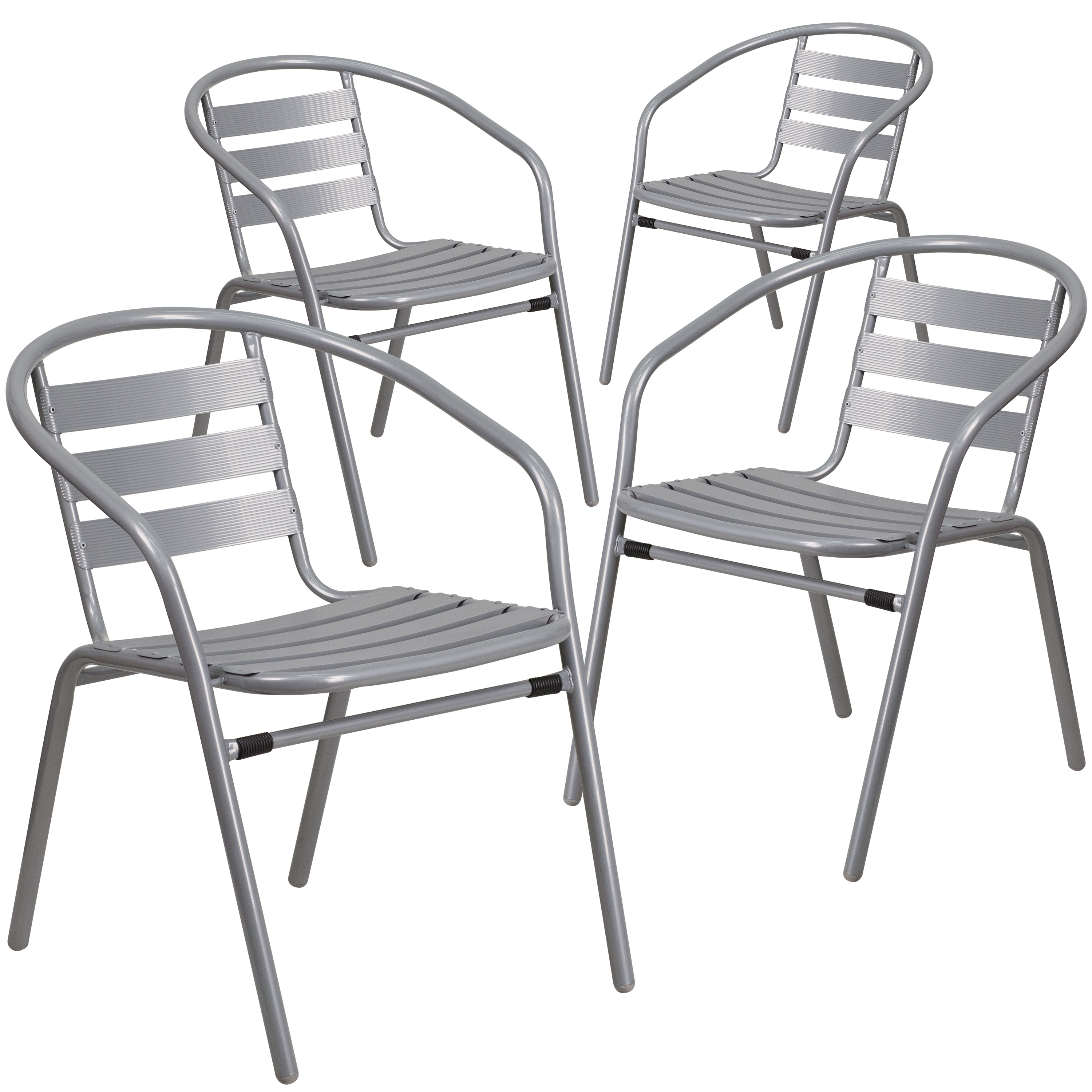 Brand Name FLASH UPC Code 889142062295 Product Family Lila Bundle Size 4 Planned to Discontinue No Warranty 1 Year Limited Rated For Commercial Use Yes Cleaning Code Solvent and water based cleaner such as foam Assembly Required No Item Weight 28 Weight Capacity 352 Seating Capacity 4 Stack Quantity 22 Colors Aluminum, Silver Overall Dimensions 24"D x 21.5"W x 28.5"H Extended Dimensions PRODUCT MEASUREMENTS: Overall Size: 21.5"W x 24"D x 28.5"H; Seat Size: 16.75"W x 14"D x 17"H; Back Size: 12"W x 15.5"H; Arm Size: 25"H from floor; 9"H from seat; No Assembly Required Bullet_1 Set of 4 Contemporary Patio Chairs for Indoor and Outdoor Use Bullet_2 352 lb. Weight Capacity Bullet_3 Stack Quantity: 22 Bullet_4 Curved Aluminum Triple Slat Back with Textured Seat to ensure safe seating Bullet_5 Electrophoresis Process protects chair from rusting Bullet_6 Designed for Commercial or Residential Use Bullet_7 Floor Protector Plastic Glides Bullet_8 Ships Fully Assembled for quick setup Bullet_9 Lightweight Design for easy mobility and storage Bullet_10 Stackable metal chair for patio, veranda, restaurant, café, kitchen and outdoor dining Product Copy Dine outdoors in this comfortable metal patio chair for your deck, restaurant or hospitality business. This chair features a modern curved slat style back to keep you comfortable and a textured seat for safe seating. The lightweight design of this chair makes it a breeze to move and allows it to easily stack for storage while cross braces provide extra stability. The protective plastic feet prevent damage to flooring. The frame is designed for all-weather use making it a great option for indoor and outdoor settings. For longevity, care should be taken to protect from long periods of wet weather. Pair this chair with a glass or metal patio table to complete your setting.