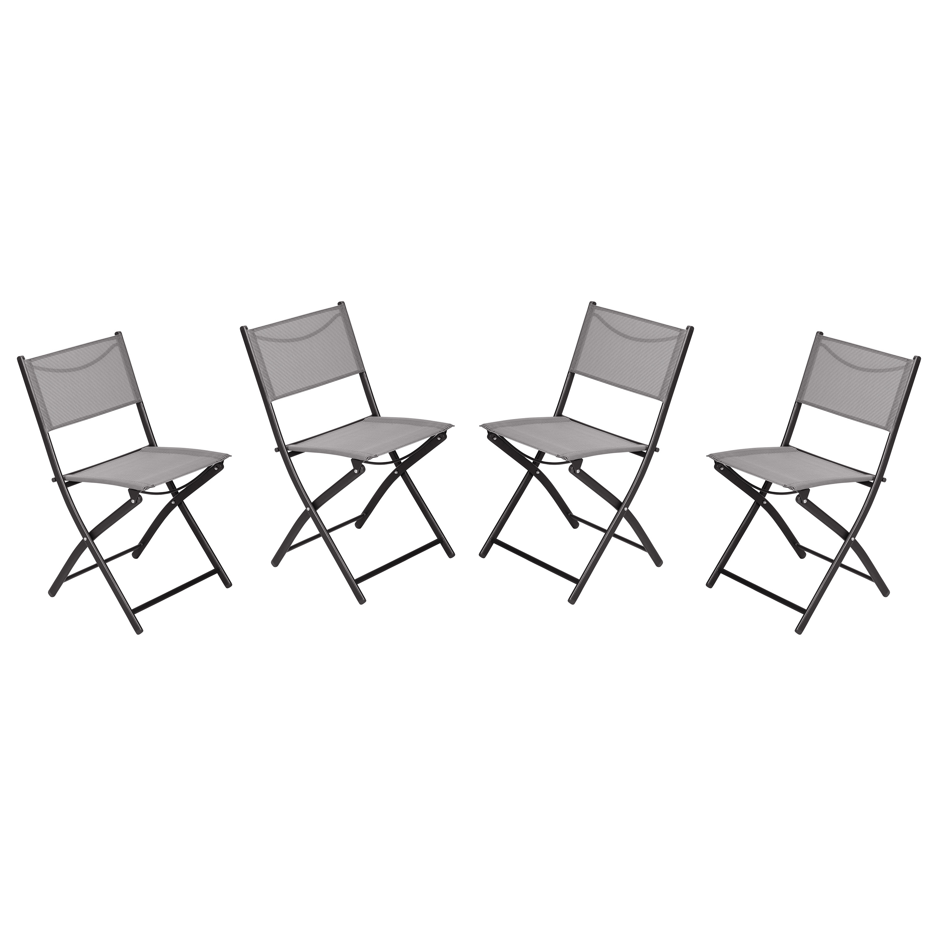 Brand Name FLASH UPC Code 196861151262 Product Family Brazos Bundle Size 4 Planned to Discontinue Yes Warranty 1 Year Limited Rated For Commercial Use Yes Cleaning Code Solvent and water based cleaner such as foam Assembly Required No Item Weight 24.0 Weight Capacity 300 Seating Capacity 4 Colors Gray Overall Dimensions 21.75"D x 18"W x 31.75"H Extended Dimensions PRODUCT MEASUREMENTS (4): 18"W x 21.75"D x 31.75"H; Seat Size: 16"W x 15"D x 18.5"H; Back Size: 17.75"W x 14.5"H Bullet_1 Set of Four Commercial Grade Outdoor Folding Chairs Bullet_2 Gray Bullet_3 Breathable, Rip-Resistant Textilene Seats and Backs for Flexibility and Comfort Bullet_4 Versatile Style for Patio, Backyard, Porch, or Deck at Home, or Restaurant, Bar, Bistro, or Café Bullet_5 Portable and Foldable for Easy Carrying and Movement Bullet_6 Weather and Rust-Resistant, Quick to Dry Bullet_7 Sturdy Steel Frame Holds up to 300 lbs. Static Weight Bullet_8 No Assembly Required Bullet_9 Cleans Easily With Water and Neutral Cleaner Product Copy Add stylish seating to your outdoor space with this set of four commercial grade outdoor folding chairs with flex comfort material. Cherish in the comfort of the breathable and rip-resistant mesh fabric seats and backs while taking in a day in the sun. These chairs are incredibly versatile, perfect for your patio, porch, backyard, poolside area, or deck in addition to being commercial grade, making them great for any outdoor bar, bistro, restaurant, lounge, or café. The stylish textilene pattern will pair perfectly with almost any design scheme. Whether you’re looking for a new way to relax or aiming to wow your guests at the next barbecue, these chairs are tough and built for any occasion with a weather and rust-resistant structure that dries quickly. Plus, this set is foldable and portable, making it easy to adjust your area and display your seats wherever you like. Relax confidently with a sturdy steel frame engineered to hold up to 300 lbs. static weight and anti-slip fixed floor glides to prevent damage to your floors. No assembly is required, so you can skip the setup and focus on furnishing your outdoor space. Cleaning is quick and easy, as these chairs can be washed with water and a neutral cleaner. With these chairs at your disposal, you can confidently showcase your style sense and enjoy some well-deserved comfort.