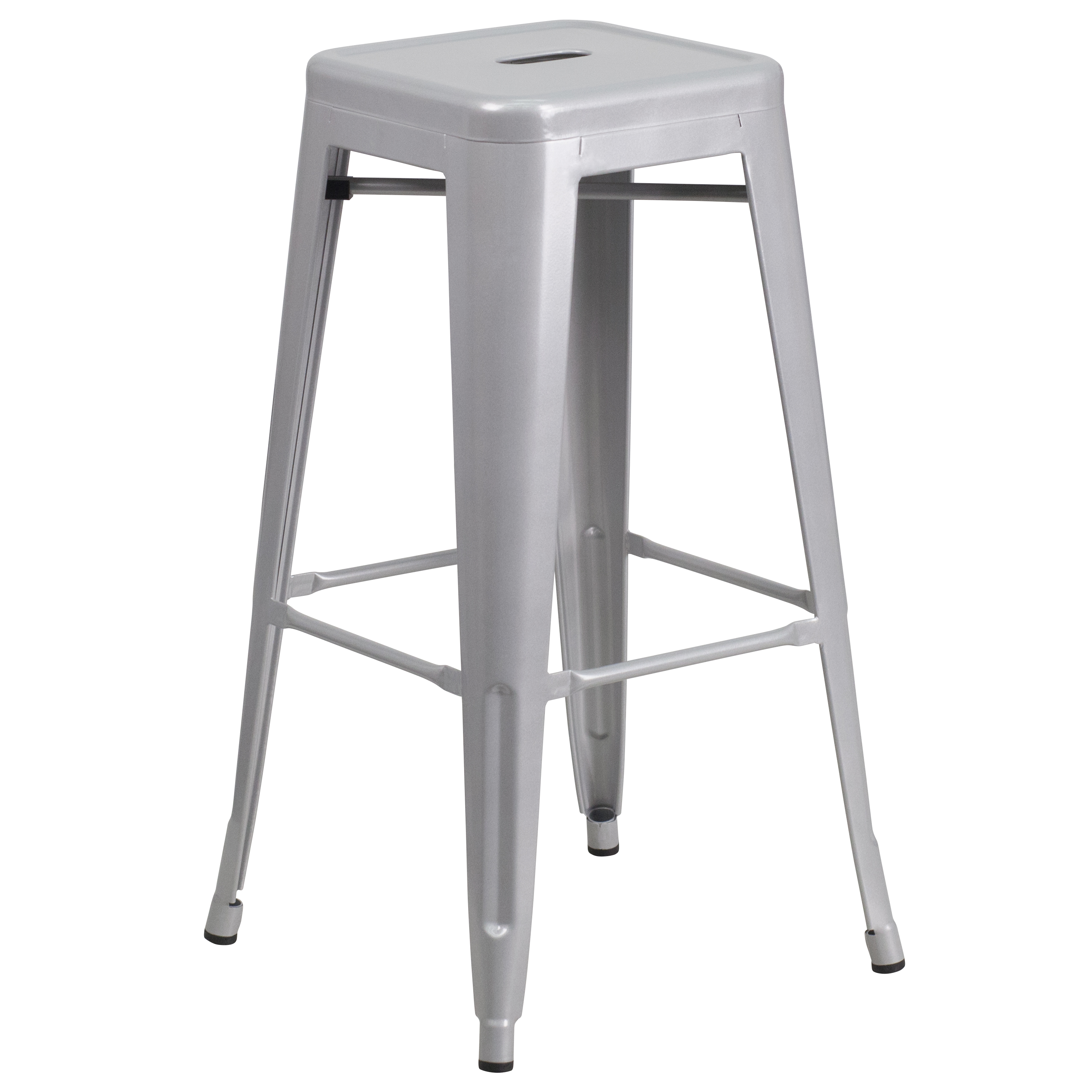 Brand Name FLASH UPC Code 889142002895 Product Family Margherite Planned to Discontinue No Warranty 5 Years Limited Rated For Commercial Use Yes Cleaning Code Water and neutral detergent Assembly Required No Item Weight 10 Weight Capacity 500 Stack Quantity 4 Colors Silver Overall Dimensions 17"D x 17"W x 30"H Extended Dimensions PRODUCT MEASUREMENTS: Overall Size: 17"W x 17"D x 30"H; Seat Size: 12"W x 12"D x 30"H; No Assembly Required Bullet_1 Industrial Backless Bar Height Stool for Indoor or Outdoor Use Bullet_2 500 lb. Weight Capacity Bullet_3 Stack Quantity: 4-8 Bullet_4 12" Seat Width with Drain Hole to assist with drying Bullet_5 Plastic Caps on cross brace protect finish when stacked Bullet_6 Galvanized Steel Silver Powder Coated Frame Finish Bullet_7 Footrest promotes better sitting experience Bullet_8 Floor Glides to protect floors when used indoors Bullet_9 Quality constructed metal stool, lightweight for ease of movement Bullet_10 No Assembly Required Product Copy Let the clean lines and simple design of this square, industrial style barstool add a modern appearance to your home or business with this colorful bar height stool. This space-saving stool is stackable making it great for storing.