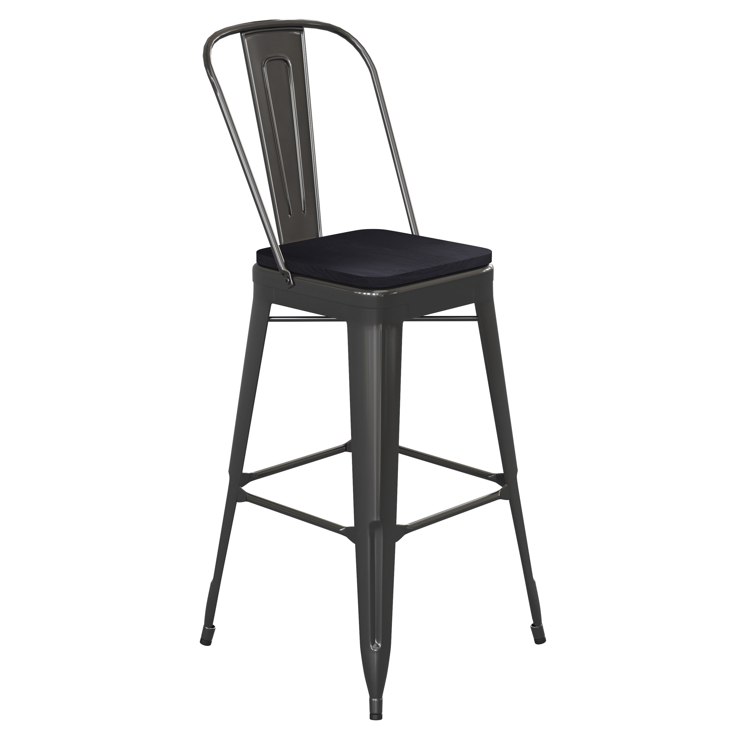 Kai Commercial Grade 30" High Black Metal Indoor-Outdoor Bar Height Stool with Removable Back and Black All-Weather Poly Resin Seat