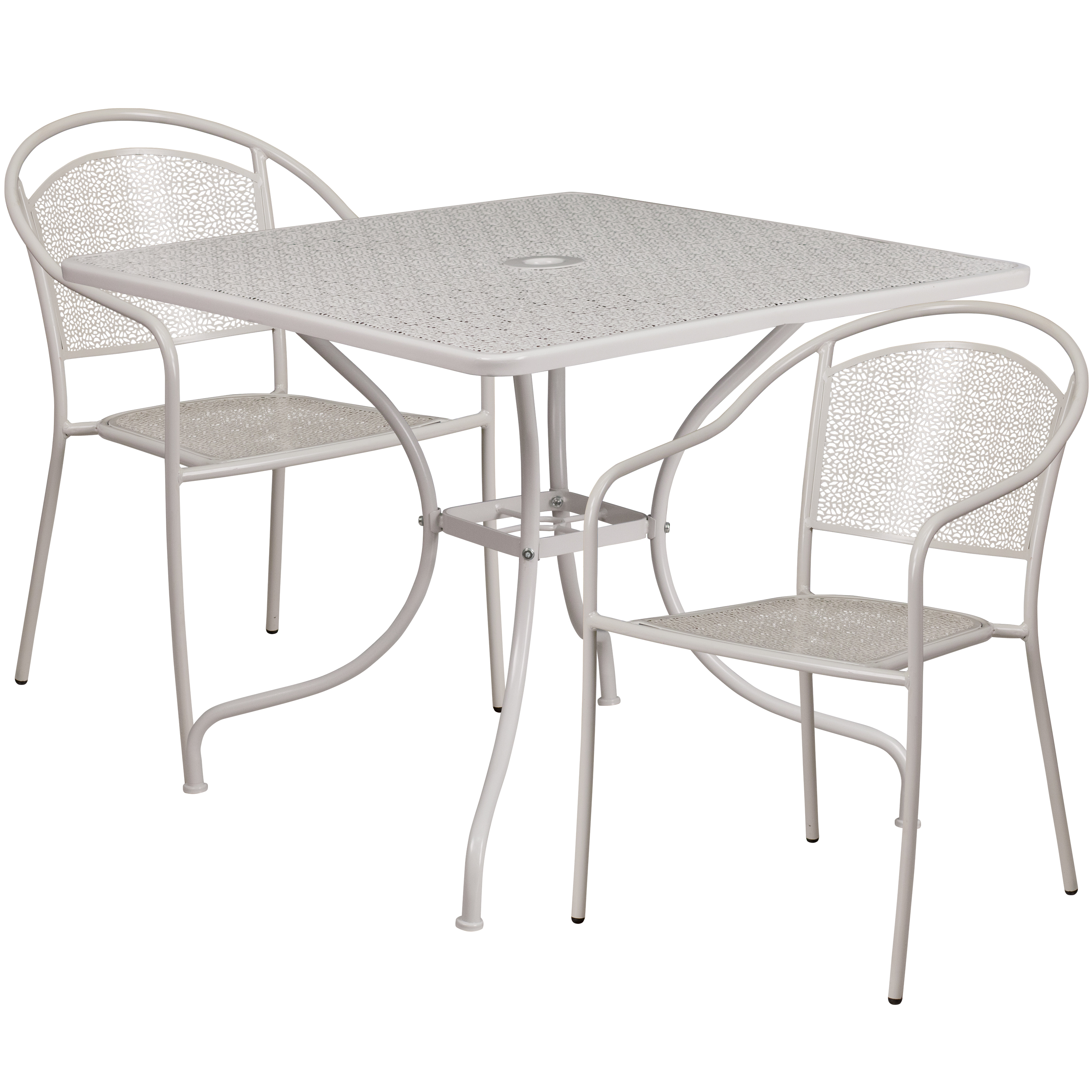 Oia Commercial Grade 35.5" Square Light Gray Indoor-Outdoor Steel Patio Table Set with 2 Round Back Chairs