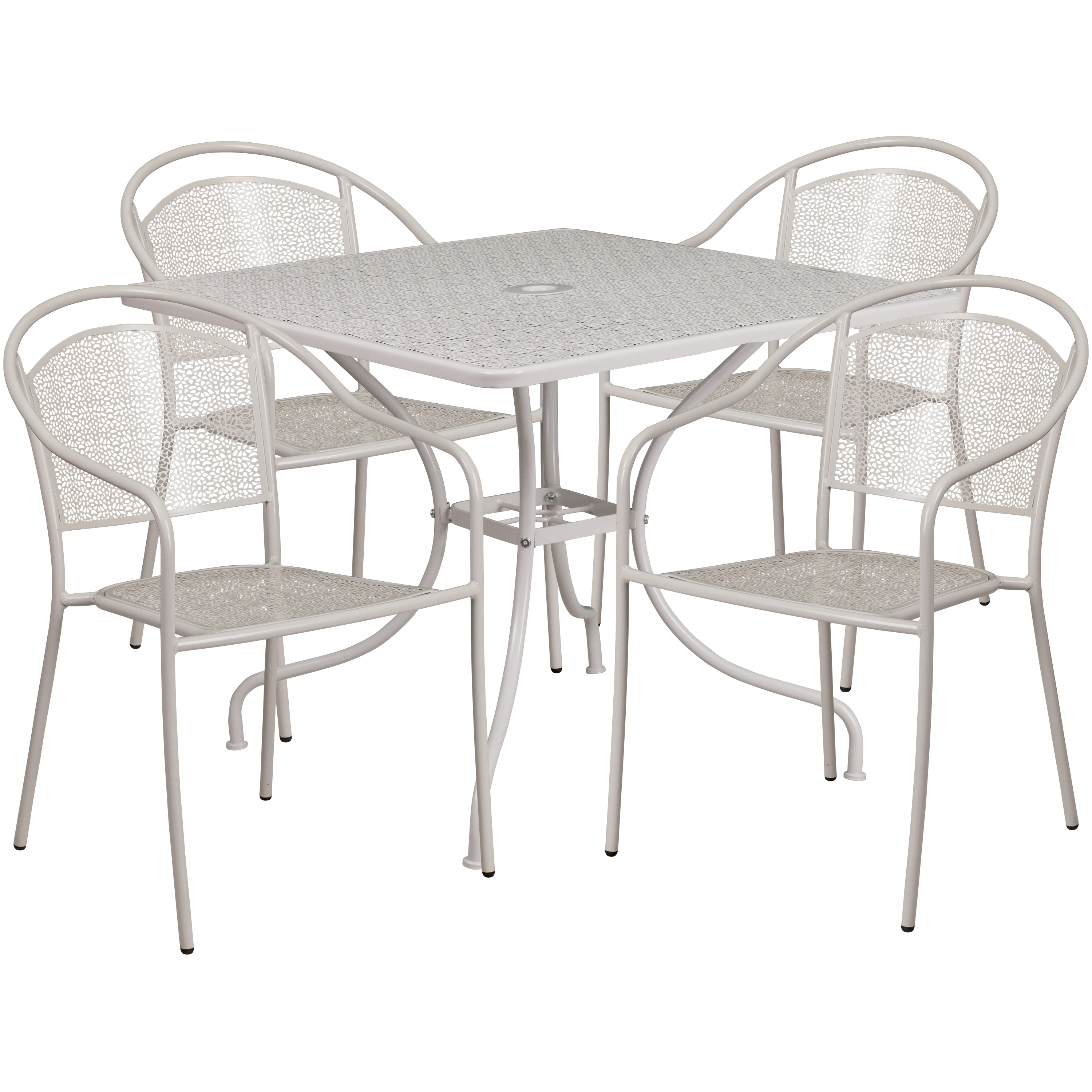 Oia Commercial Grade 35.5" Square Light Gray Indoor-Outdoor Steel Patio Table Set with 4 Round Back Chairs