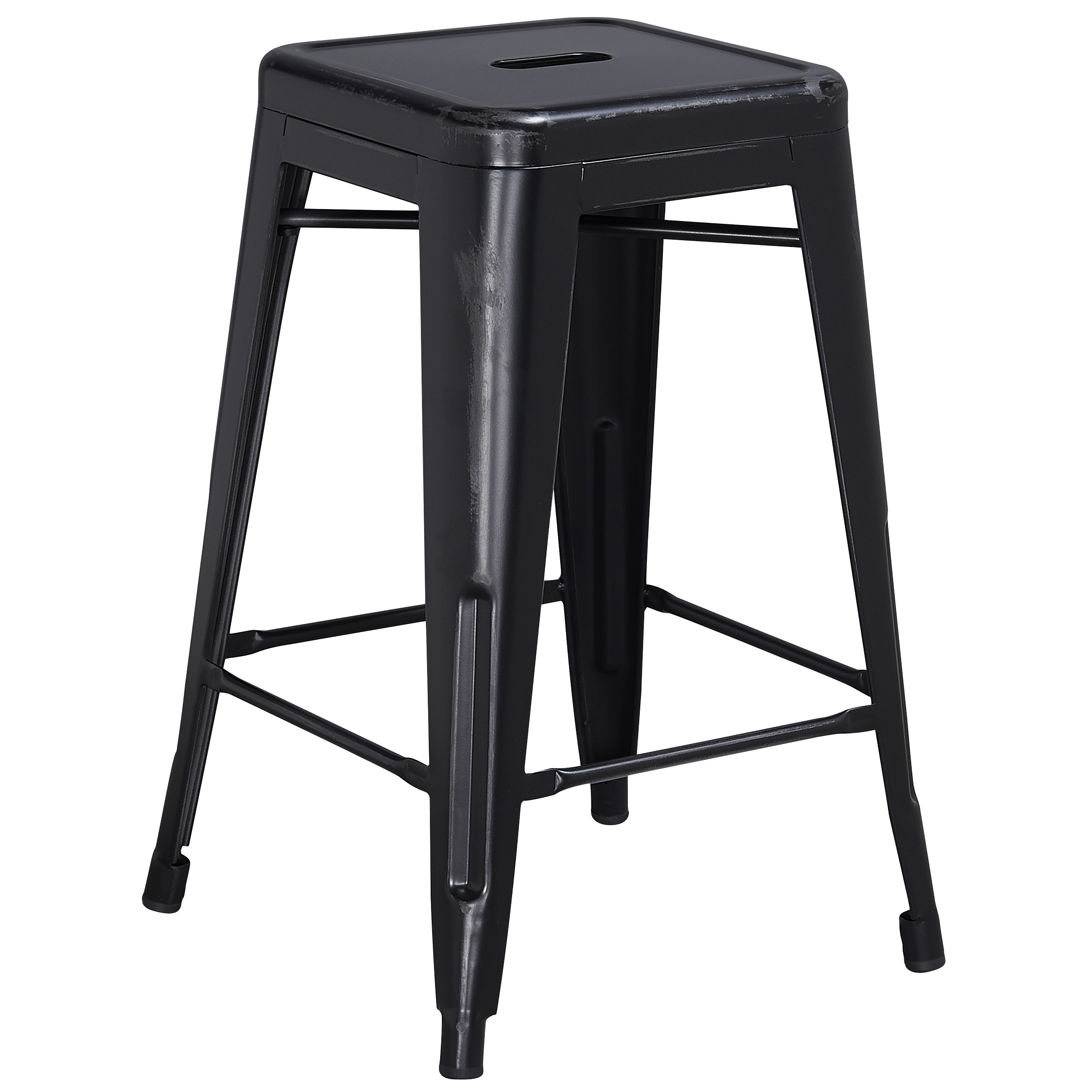 Brand Name FLASH UPC Code 889142024453 Product Family Kai Planned to Discontinue Yes Warranty 5 Years Limited Rated For Commercial Use Yes Cleaning Code Water and neutral detergent Assembly Required No Item Weight 9 Weight Capacity 500 Stack Quantity 10 Colors Black Overall Dimensions 16"D x 16"W x 24"H Extended Dimensions PRODUCT MEASUREMENTS: Overall Size: 16"W x 16"D x 24"H; Seat Size: 12"W x 12"D x 24"H; No Assembly Required Bullet_1 Industrial Dining Counter Stool for Indoor or Outdoor Use Bullet_2 500 lb. Weight Capacity Bullet_3 Stack Quantity: 10 Bullet_4 12" Seat Width with Drain Hole to assist with drying Bullet_5 Plastic Caps on cross brace protect finish when stacked Bullet_6 Distressed Black Powder Coated Frame Finish Bullet_7 Footrest promotes better sitting experience Bullet_8 Rubber Floor Glides to protect floors when used indoors Bullet_9 Quality constructed metal stool, lightweight for ease of movement Bullet_10 No Assembly Required Product Copy Be daring in your decorating scheme and let the clean lines of this metal, indoor-outdoor, backless counter stool add a classic industrial look to your kitchen island or counter. You'll be pleasantly surprised how well these distressed metal counter stools blend in with your existing furnishings.