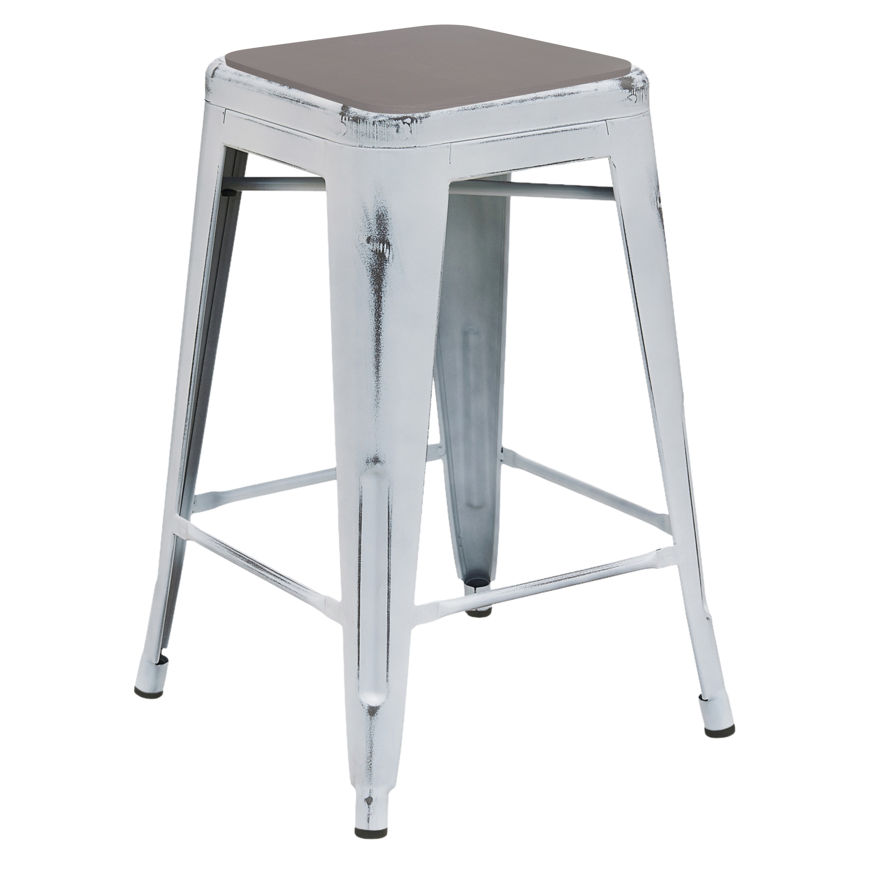 Brand Name FLASH UPC Code 196861050015 Product Family Margherite Planned to Discontinue No Warranty 5 Years Limited Rated For Commercial Use Yes Cleaning Code Water and neutral detergent Assembly Required Yes Assembly Level Easy Assembly Time Frame 1-10 Minutes Item Weight 12.1 Weight Capacity 500 Stack Quantity 10 Colors White Overall Dimensions 16"D x 16"W x 24.75"H Extended Dimensions PRODUCT MEASUREMENTS: Chair Size: 16"W x 16"D x 24"H; Seat Size: 12"W x 12"D x 24"H | Poly Resin Seat Size: 12"W x 12"D x .75"H Bullet_1 Modern Backless Counter Stool with Poly Resin Seat for Commercial or Residential Use Bullet_2 Distressed White Galvanized Steel Frame Bullet_3 Gray Polystyrene Seat Will Not Rot, Chip, or Peel Bullet_4 Space-Saving Backless Design Bullet_5 Underseat Cross Bracing and Integrated Footrest Bullet_6 Holds up to 500 LBS. Static Weight Bullet_7 Wipe Clean with a Water and a Neutral Detergent Bullet_8 Seat Attaches to Preassembled Chair in Minutes Bullet_9 Designed for Indoor and Outdoor Use Product Copy Be daring in your decorating scheme and let the clean lines of this metal, indoor-outdoor, backless counter stool add an on-trend industrial look to any space. Constructed to hold up in commercial settings, as well as your home, this dining counter stool will instantly modernize your restaurant, cafe, or bar. Available in multiple colors as well as bar height, you can mix and match to make your place look cohesive. The lower support brace doubles as a footrest, promoting proper posture and an improved sitting experience. Create a unique breakfast nook or update the employee breakroom with this colorful dining stool. This timeless counter height bar stool includes an all-weather poly resin seat that won't rot, chip, or peel making it ideal for indoor and outdoor use. The seat attaches to the preassembled chair in minutes and cleanup is quick and easy with water and a neutral detergent.
