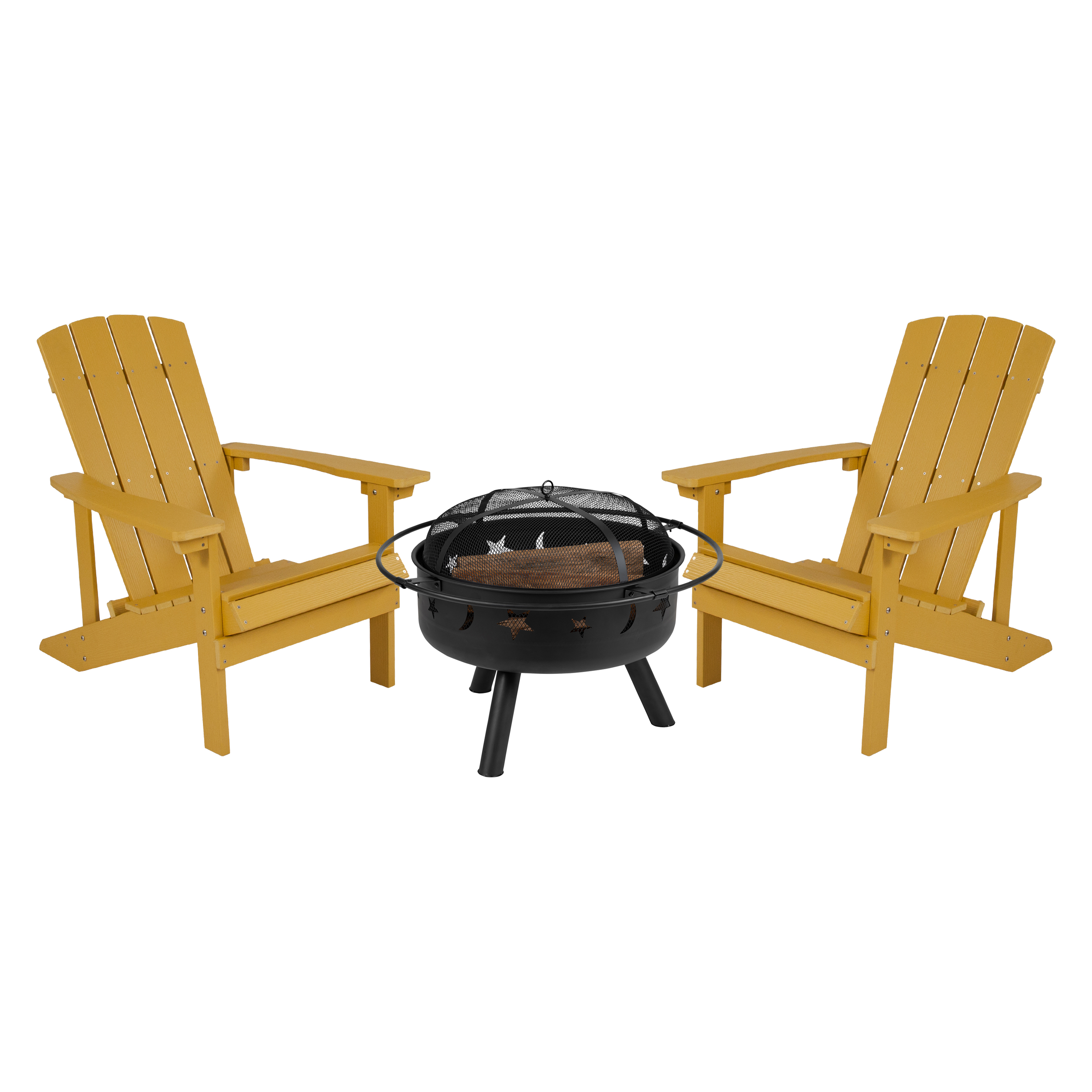 3 Piece Charlestown Commercial Yellow Commercial Poly Resin Wood Adirondack Chair Set with Fire Pit - Star and Moon Fire Pit with Mesh Cover